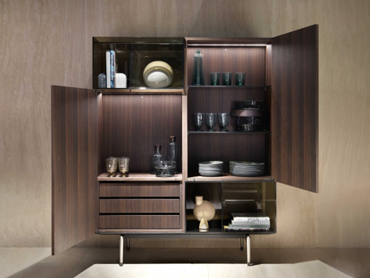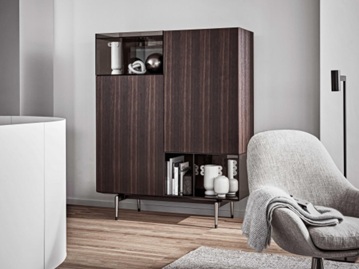 Jeremy è uno dei molti prodotti disegnati da Carlo Colombo per Flexform, un esempio di eleganza e versatilità progettuale che ben si accorda allo stile di un arredo contemporaneo. La sua bellezza nasce dal saper coniugare un gioco di pieni e vuoti, dando vita a composizioni uniche dove gli oggetti vengono risposti o esposti nei diversi piani così da valorizzarli o nasconderli alla vista. Di particolare pregio è la contrapposizione fra le teche in vetro fumé e la ruvida matericità del rovere cotto. I contenitori di Jeremy sono realizzati anche in diverse versioni e poggiano su raffinati piedini in alluminio pressofuso, anch’esso personalizzabile a seconda del gusto. *Caratteristiche tecniche: ripiani in vetro