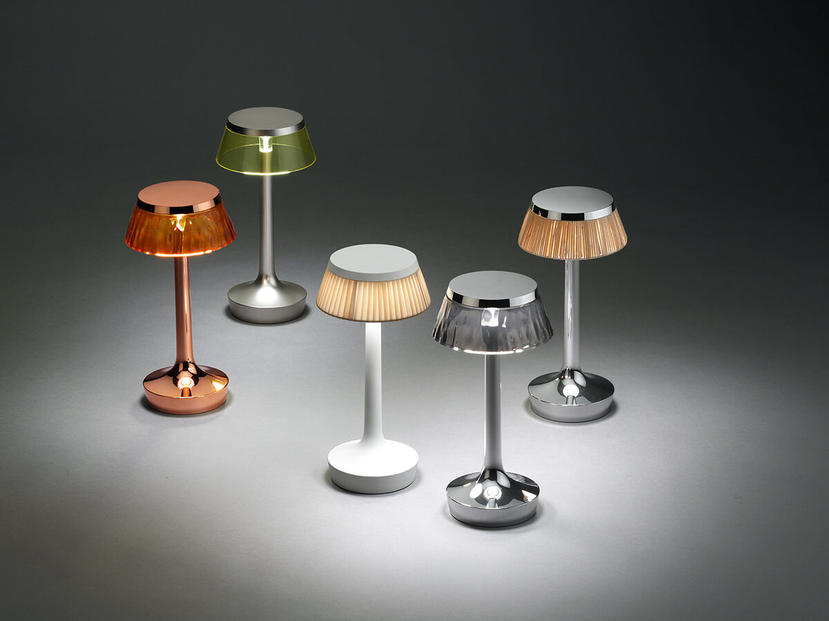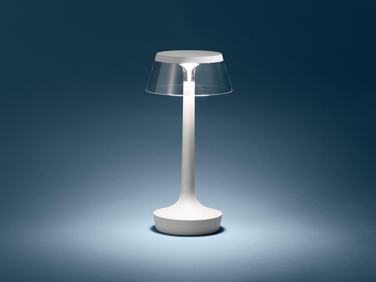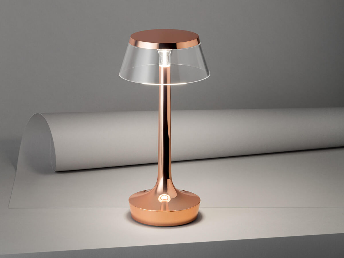 Bon Jour si conforma come elemento d’arredo di grande finezza estetica, fonte di luce e al contempo punto d’incontro di sguardi inevitabilmente attratti dal suo stile peculiare e difficilmente riproducibile. La base e il diffusore sono in PMMA trasparente, stampato a iniezione. La fonte luminosa sfrutta la tecnologia Edge Lighting, per un effetto brillante e peculiare. Punto di forza di Bon Jour è la presenza di moltissime varianti e declinazioni che a partire dalle dimensioni rendono disponibili a catalogo le più disparate scelte estetiche. Fra i colori messi a disposizione di Flos citiamo il bianco, cromo e rame, tre aspetti d’eleganza in ambienti cui Bon Jour attribuisce un tocco di ricchezza.