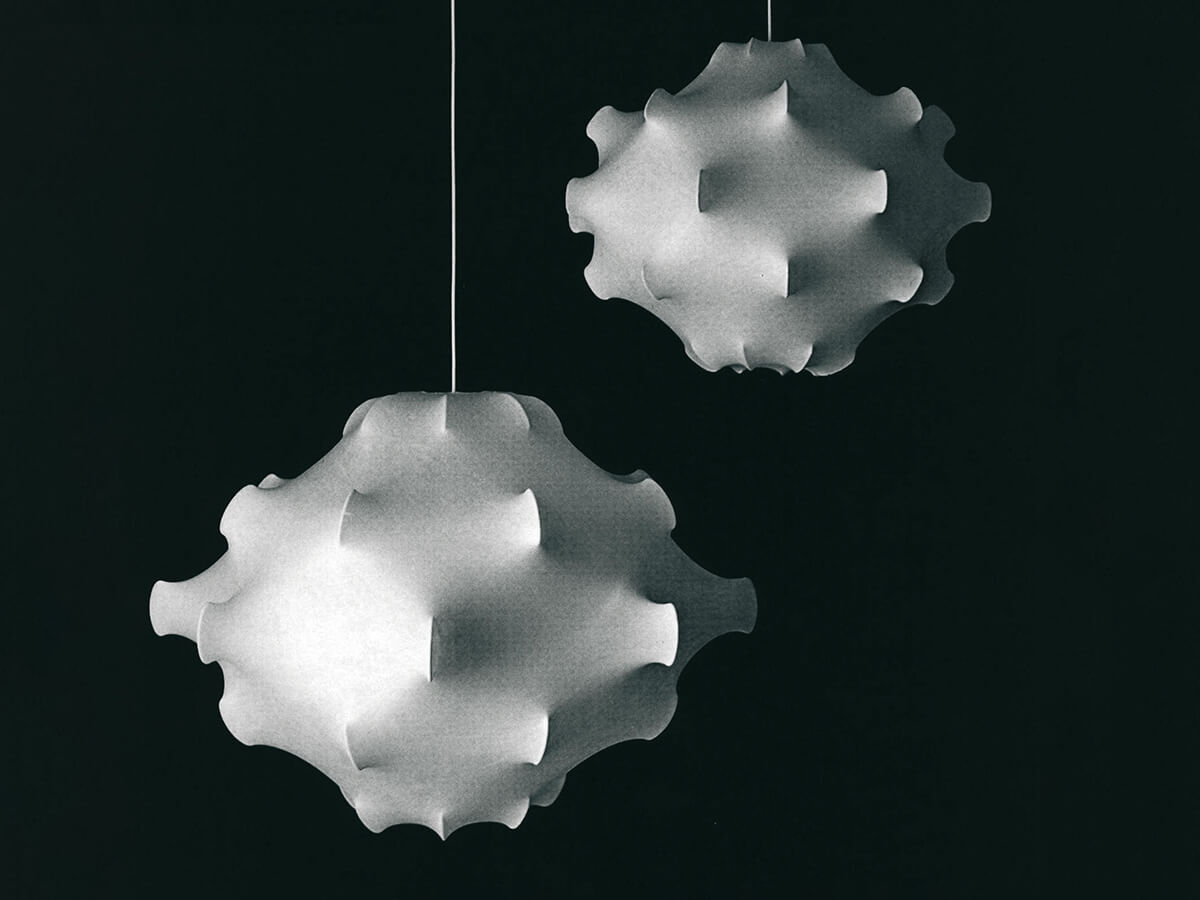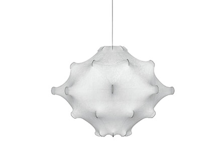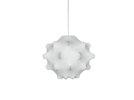 Taraxacum fa parte delle numerose creazioni di Achille & Pier Giacomo Castiglioni, la cui forza immaginativa unita a una sapienza strutturale dà vita a opere uniche e di grande effetto. L’utilizzo della particolare resina “cocoon” spruzzata sulla struttura delinea proiezioni e sagomature estremamente eleganti, ammorbidite proprio dalla proprietà di questo elemento elastico ed estremamente duttile. La peculiarità di cocoon è quella di far passare la luce, pur filtrandola in modo non omogeneo, dando così vita a riflessi e morbide sfumature uniche nel loro genere. La scelta di una forma vagamente romboidale viene qui associata alla presenza di numerose punte che come veri e propri “peduncoli” emergono dalla superficie donandole una caratterizzazione dinamica e movimentata.