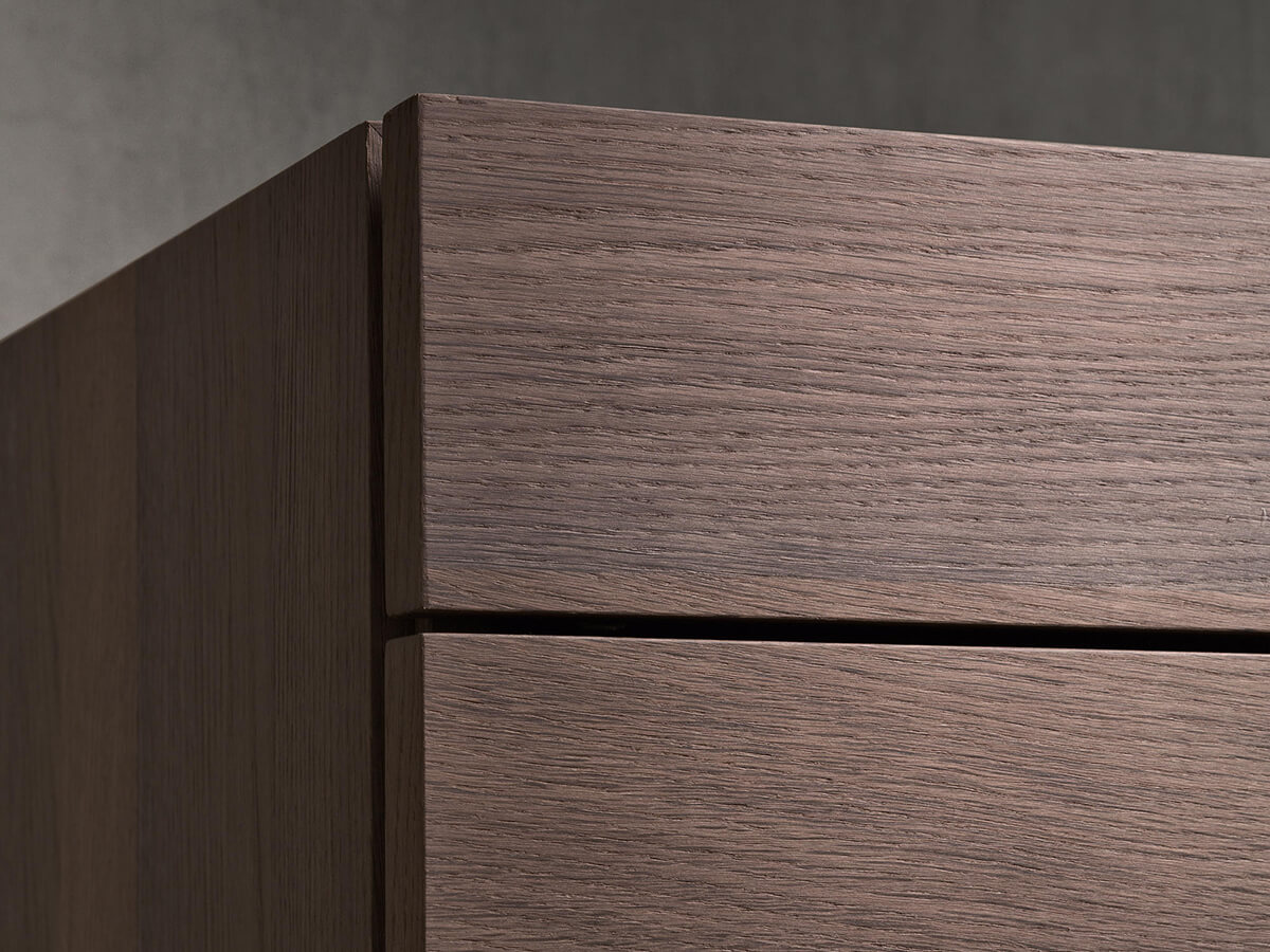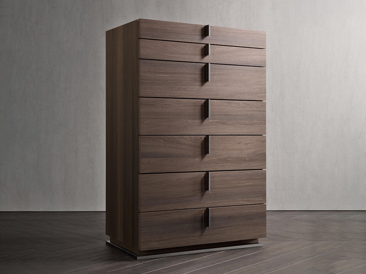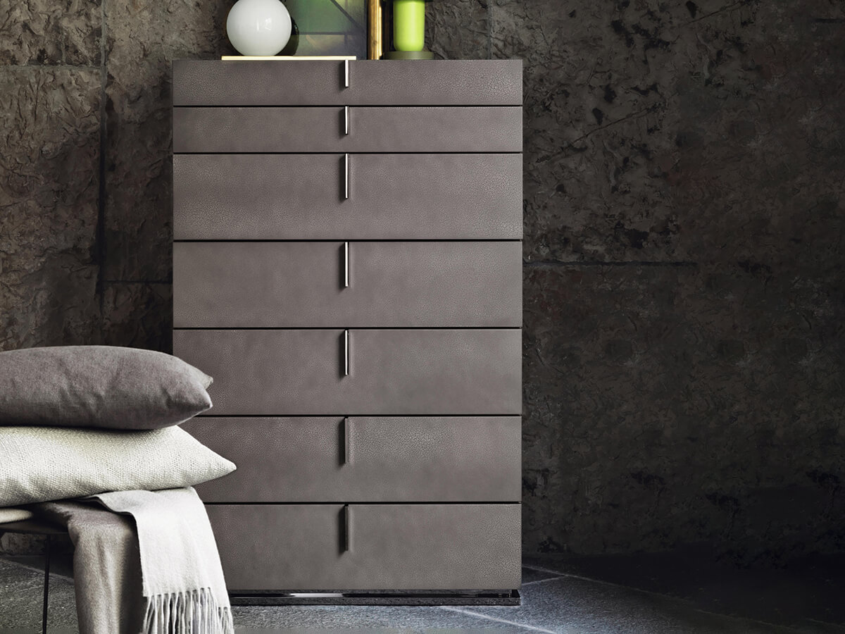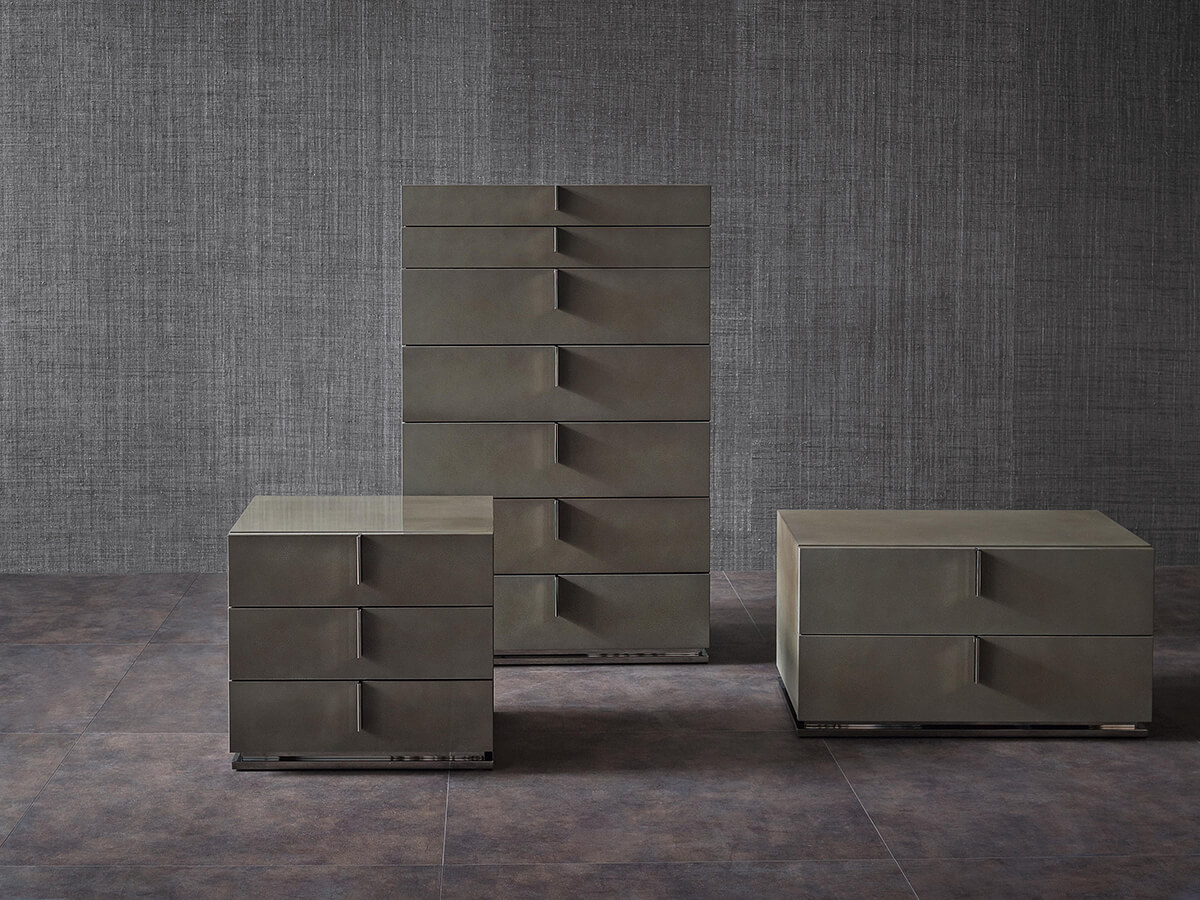 La serie Ari si compone di numerose offerte per la zona notte, disegnate per esprimere al meglio la concezione Flou del “buon dormire”. Fra le proposte di contenitori, citiamo i comodini e settimanali /camicerie, entrambi caratterizzati da una preziosa configurazione di linee e materiali accuratamente lavorati. La purezza di forme qui pare studiata per richiamare l’attenzione senza però sottrarla ad altre parti della camera da letto. La struttura in legno è impreziosita dalla laccatura effetto galuchat opaca disponibile in diverse colorazioni. Preziosa è la versione in legno fossile per il comodino a tre cassetti e il settimanale. *Caratteristiche tecniche: il primo e il secondo cassetto del settimanale hanno divisori interni. Maniglie e basi in nickel nero lucido.