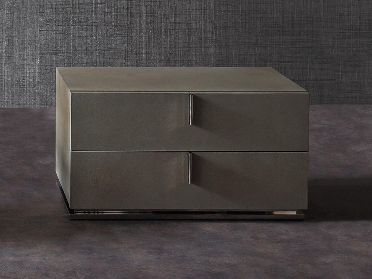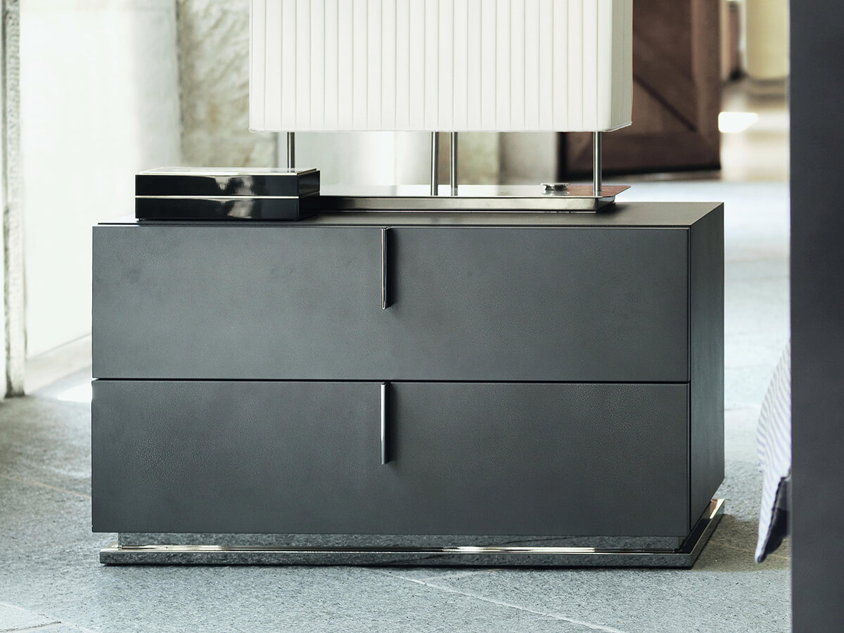 La serie Ari si compone di numerose offerte per la zona notte, disegnate per esprimere al meglio la concezione Flou del “buon dormire”. Fra le proposte di contenitori, citiamo i comodini e settimanali /camicerie, entrambi caratterizzati da una preziosa configurazione di linee e materiali accuratamente lavorati. La purezza di forme qui pare studiata per richiamare l’attenzione senza però sottrarla ad altre parti della camera da letto. La struttura in legno è impreziosita dalla laccatura effetto galuchat opaca disponibile in diverse colorazioni. Preziosa è la versione in legno fossile per il comodino a tre cassetti e il settimanale. *Caratteristiche tecniche: il primo e il secondo cassetto del settimanale hanno divisori interni. Maniglie e basi in nickel nero lucido.