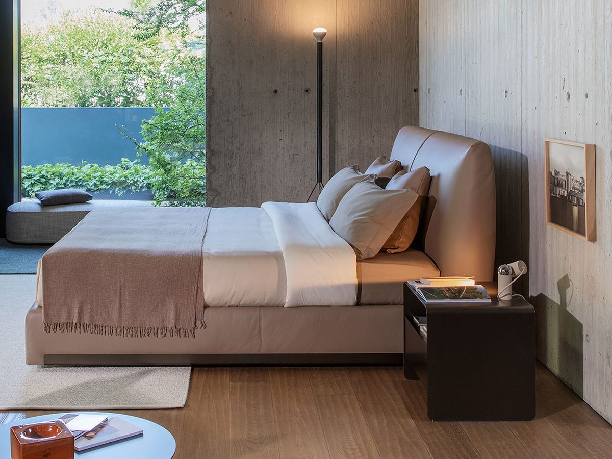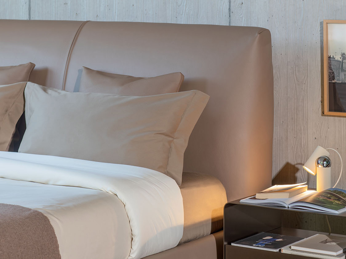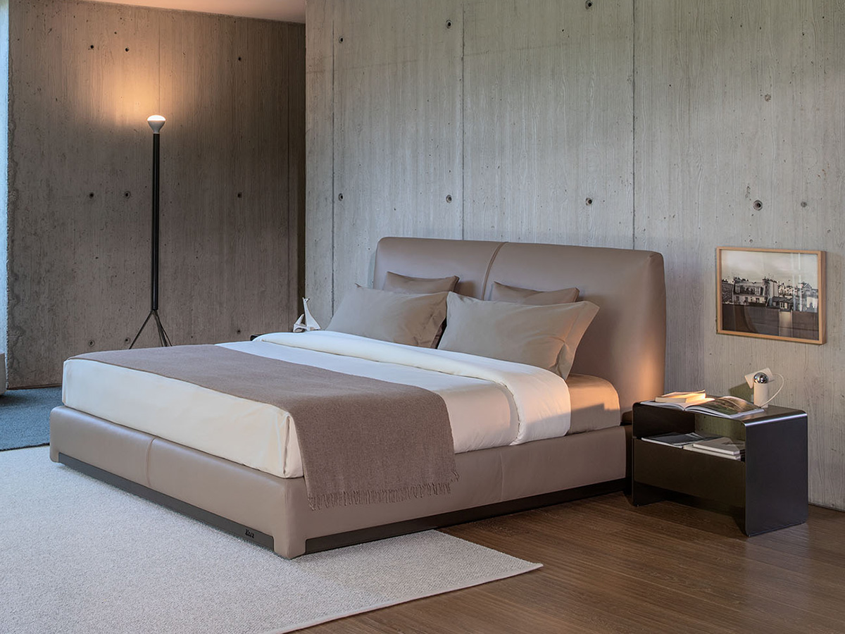 Una linea morbida e sensuale trova posto all’interno delle collezioni Flou per la camera da letto. Un letto nato dal gusto di Gino Moschetti e costruito come un abito, pensando a giochi di forme e sovrapposizioni che mescolano non solo i colori, ma anche i materiali e le finiture. La bellezza di Atelier M nasce in primo luogo dall’eccellenza sartoriale di Flou, qui manifesta nel dettaglio in lamiera ai piedi della base che rende l’insieme unico e originale. Non meno prezioso è lo spacco al centro della testiera del letto, elemento che naturalmente divide questa parte in due sezioni perfettamente simmetriche fra loro. Flou trova in questo modello una ulteriore prova di capacità progettuale, evidenziando le sue competenze nella costruzione del “dolce dormire”.
