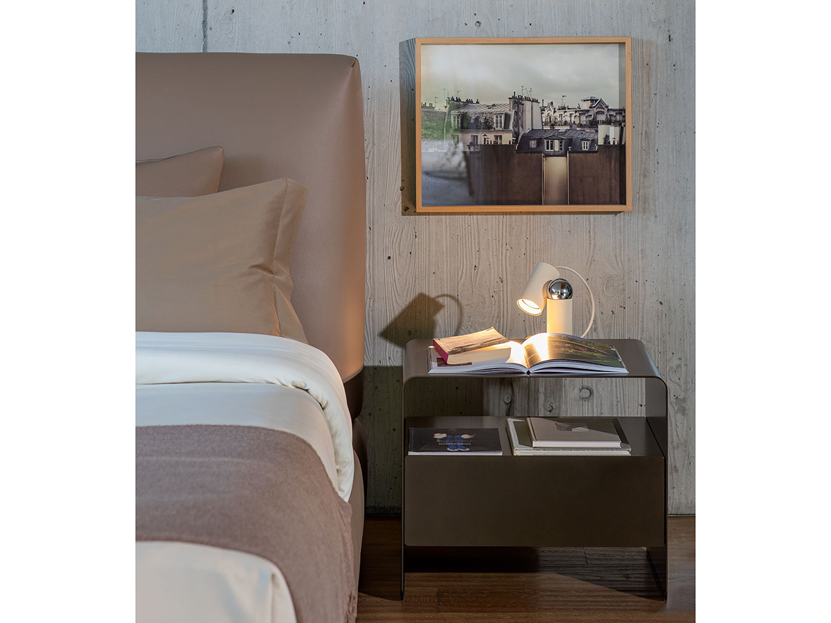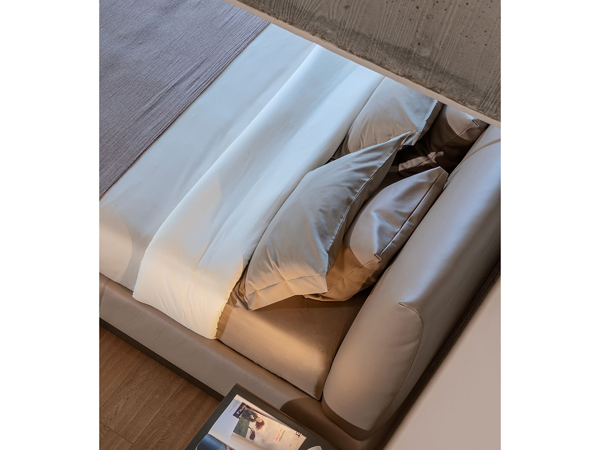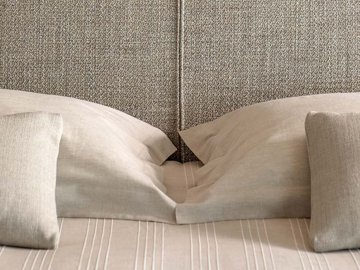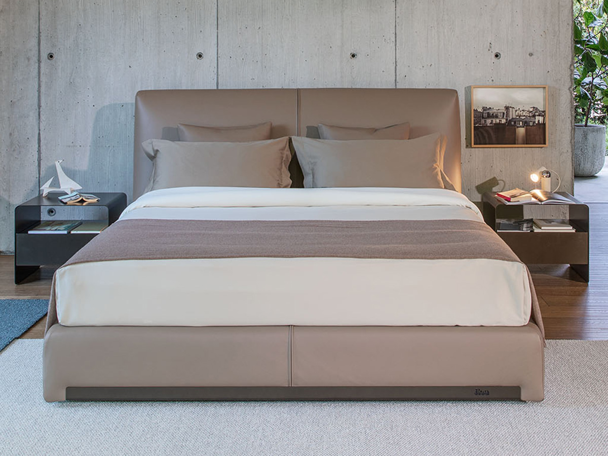 Una linea morbida e sensuale trova posto all’interno delle collezioni Flou per la camera da letto. Un letto nato dal gusto di Gino Moschetti e costruito come un abito, pensando a giochi di forme e sovrapposizioni che mescolano non solo i colori, ma anche i materiali e le finiture. La bellezza di Atelier M nasce in primo luogo dall’eccellenza sartoriale di Flou, qui manifesta nel dettaglio in lamiera ai piedi della base che rende l’insieme unico e originale. Non meno prezioso è lo spacco al centro della testiera del letto, elemento che naturalmente divide questa parte in due sezioni perfettamente simmetriche fra loro. Flou trova in questo modello una ulteriore prova di capacità progettuale, evidenziando le sue competenze nella costruzione del “dolce dormire”.