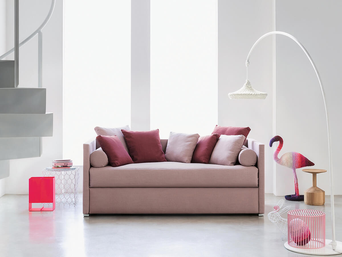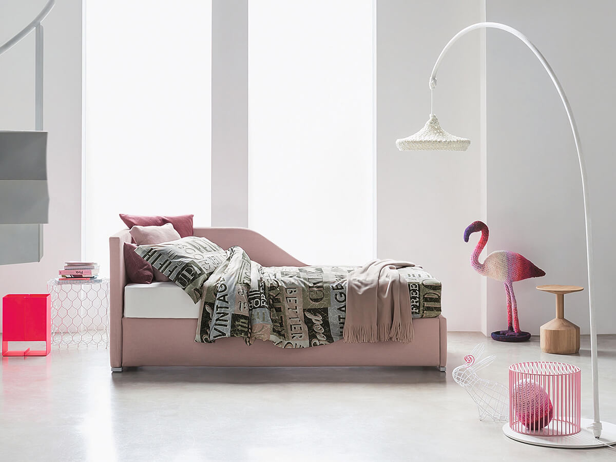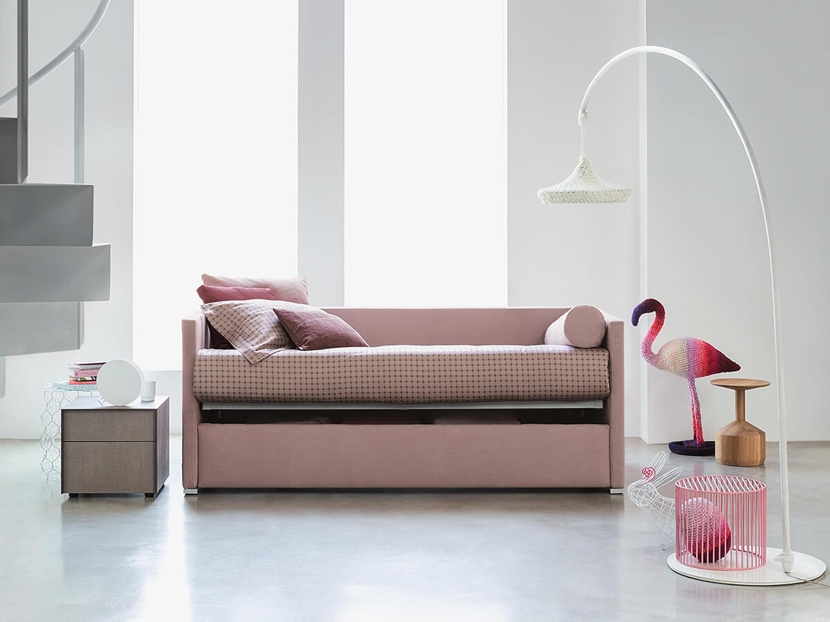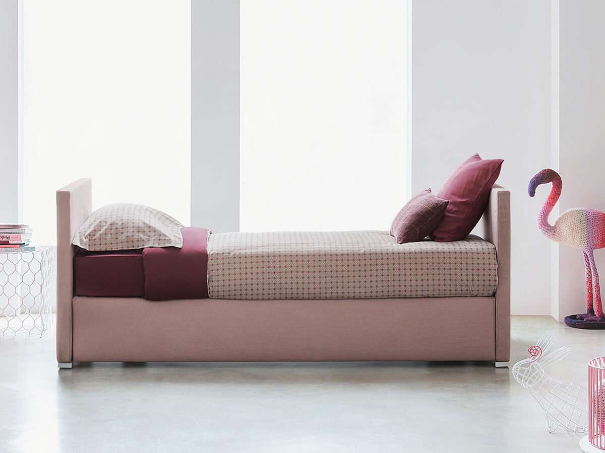 Biss è un letto estremamente versatile, capace di conformarsi a seconda della necessità. Disponibile in due versioni, la prima con contenitore salva spazio e la seconda con base provvista di apertura laterale per alloggiare un secondo letto a scomparsa, è ideale per chi desideri un elemento d’arredo elegante e fortemente caratterizzato. Nella versione con secondo letto, l’elemento estraibile è privo di testata ma munito di ruote per facilitarne la movimentazione. Può inoltre essere sollevato da terra grazie a un meccanismo di pistoni, oppure restare alloggiato a terra. I rivestimenti in tessuto, pelle o Ecopelle sono totalmente sfoderabili per garantire durabilità nel tempo.