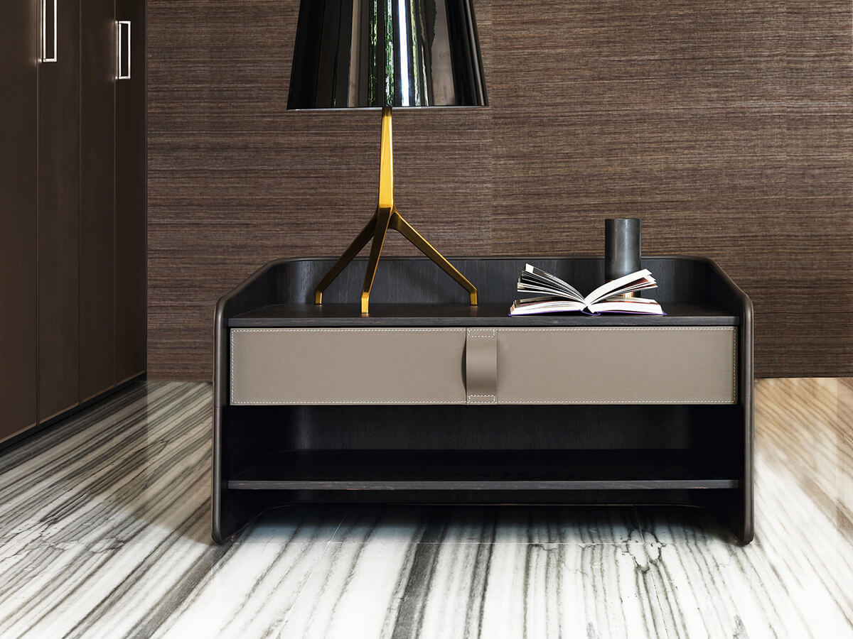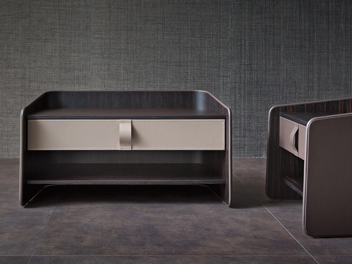 La serie Gentleman si compone di numerose offerte per la zona notte, specificamente disegnate per esprimere al meglio la concezione Flou del “buon dormire” e del vivere serenamente gli spazi più intimi della casa. Fra le proposte di contenitori, citiamo i comodini e comò Gentleman, entrambi caratterizzati da una preziosa configurazione di linee e materiali accuratamente lavorati. La struttura è in legno multistrato curvato e rivestito esternamente in pelle come il cordonetto perimetrale. I frontali e le maniglie in pelle si prestano a una personalizzazione più radicata per concedere spazio alla personalità e gusto del singolo. *Caratteristiche tecniche: struttura e piani appoggio in ebano opaco
