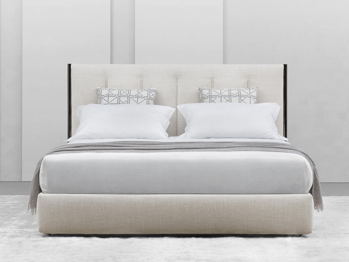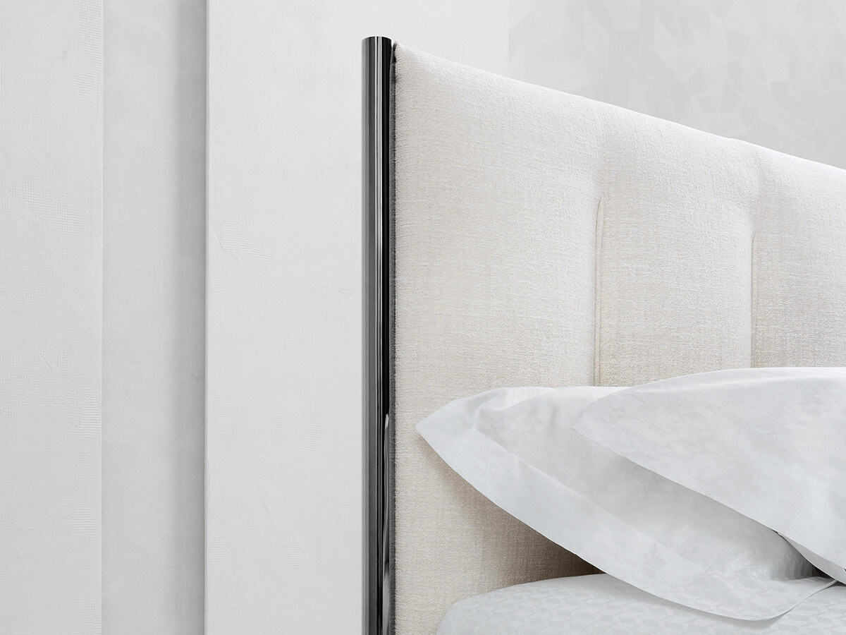 Una delle molte prove artistiche dell’azienda Flou, capace di dar vita a elementi d’arredo unici e dal gusto estremamente ricercato. Dalla penna di Carlo Colombo nasce Koi, letto dalle linee pulite ed essenziali. La forma rigorosa della testata si accosta a un’incorniciatura in metallo, preziosa e definita fino a collimare nei piedi. L’utilizzo del tessuto ingentilisce la durezza di questi dettagli artigianali donando alla struttura una nota più morbida culminante nelle trapunture verticali della testata che si slanciano dal basso verso l’alto. Disponibile con base fissa, contenitore, con movimento elettrico e base Leonardo. Il rivestimento in tessuto o pelle è completamente sfoderabile. *Caratteristiche tecniche: struttura testata in nickel nero lucido o in brunito opaco