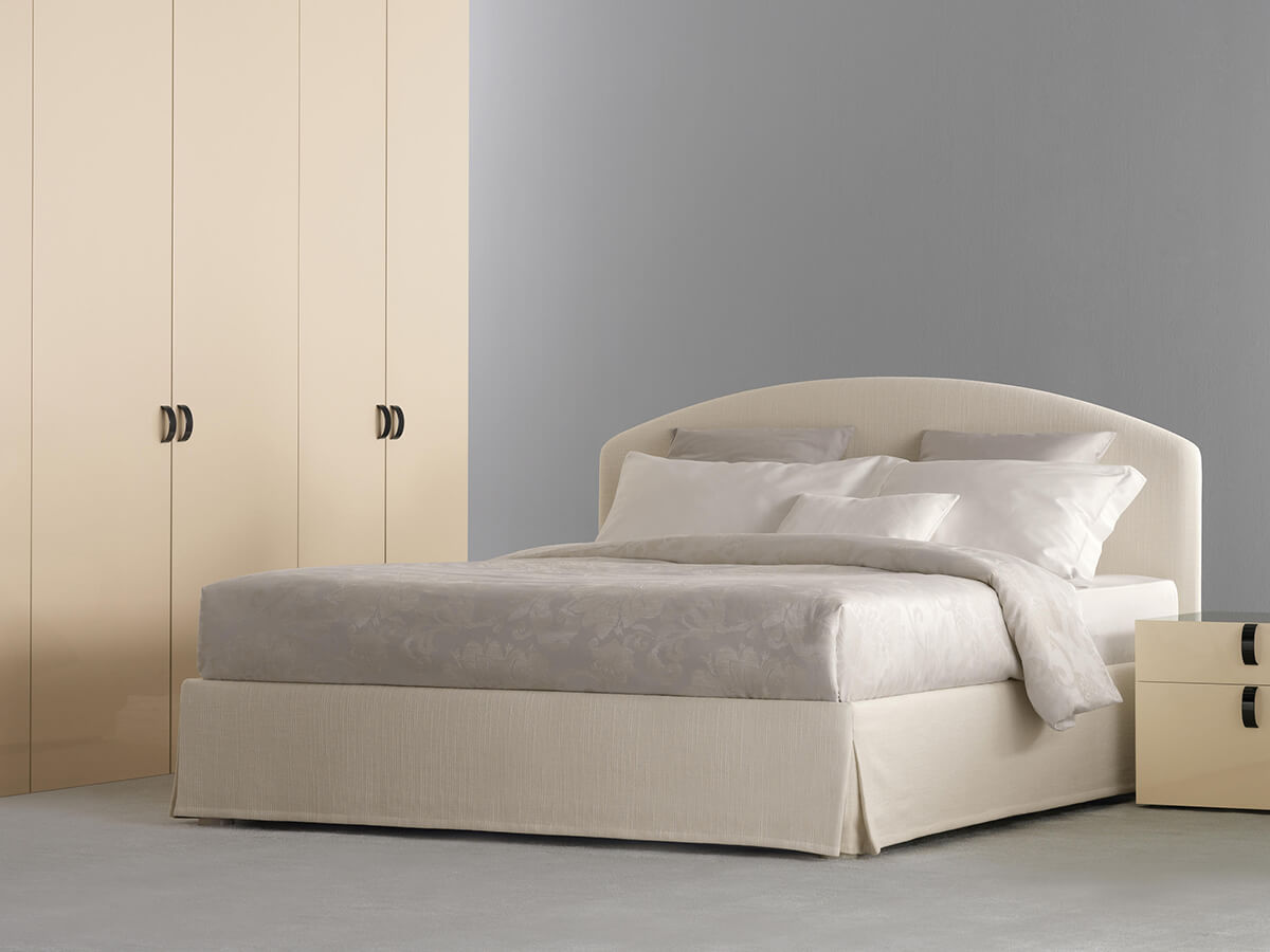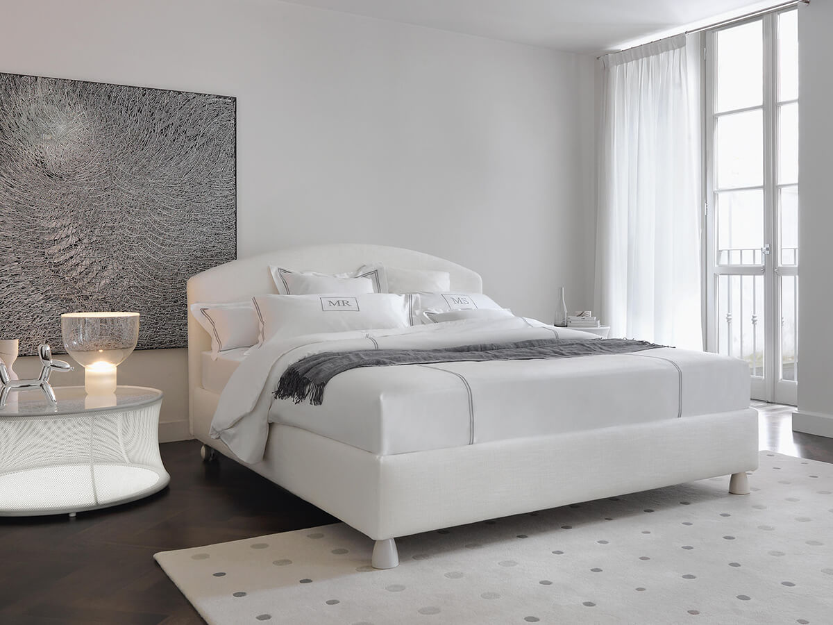 Un letto dalla linea romantica, capace di rievocare la dolcezza di un arredo fatto di qualità e suggestione. L’ampia testata imbottita di Magnolia crea insieme alla base un comodo spazio per rilassarsi e sostare anche in posizione seduta. I rivestimenti possono essere in tessuto, pelle o Ecopelle, completamente sfoderabili. La dolce curvatura dello schienale addolcisce l’intera struttura, dando modo di collocarla in ambienti dal gusto particolarmente diversificato senza mai risultare eccessivo. Disponibile con base a molle Leonardo, base contenitore, base fissa e con base con rete a movimento elettrico. *Caratteristiche tecniche: piedini conici H.10 cm in colore antracite o alluminio oppure cilindrici H.10 cm in brunito opaco. Per alcune versioni, rivestimento disponibile anche a volants.