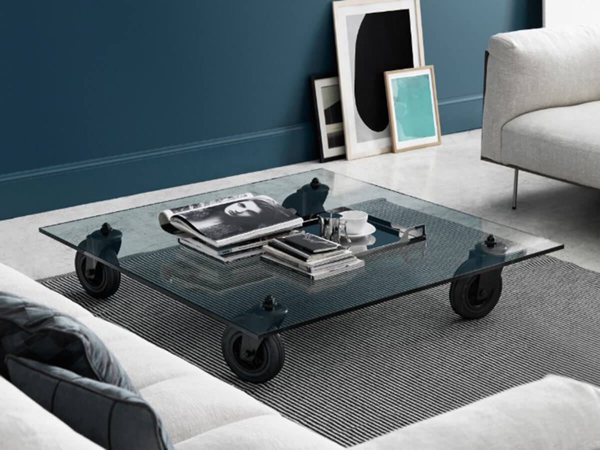 “Tavolo con Ruote” di Fontana Arte è un basso coffee table disegnato nel 1980 da Gae Aulenti e già entrato nel novero dei classici imprescindibili del design italiano, parte delle collezioni permanenti di musei quali il MoMa di New York e del Centre Pompidou di Parigi. Al contempo pratico e raffinato, con le sue rotelle di chiara derivazione industriale assume un giocoso tocco dadaista quasi da ready-made. Gae Aulenti trasse infatti l’ispirazione per le sue forme dalla vista di un carrello industriale usato per il trasporto delle lastre di vetro nella storica sede di Fontana Arte, trasfigurato con pochi semplici tocchi in un elegante complemento domestico. Il tavolino ha come piano una spessa lastra in vetro molato mentre le quattro rotelle sono lasciate con movimento libero e presentano una verniciatura di colore nero.