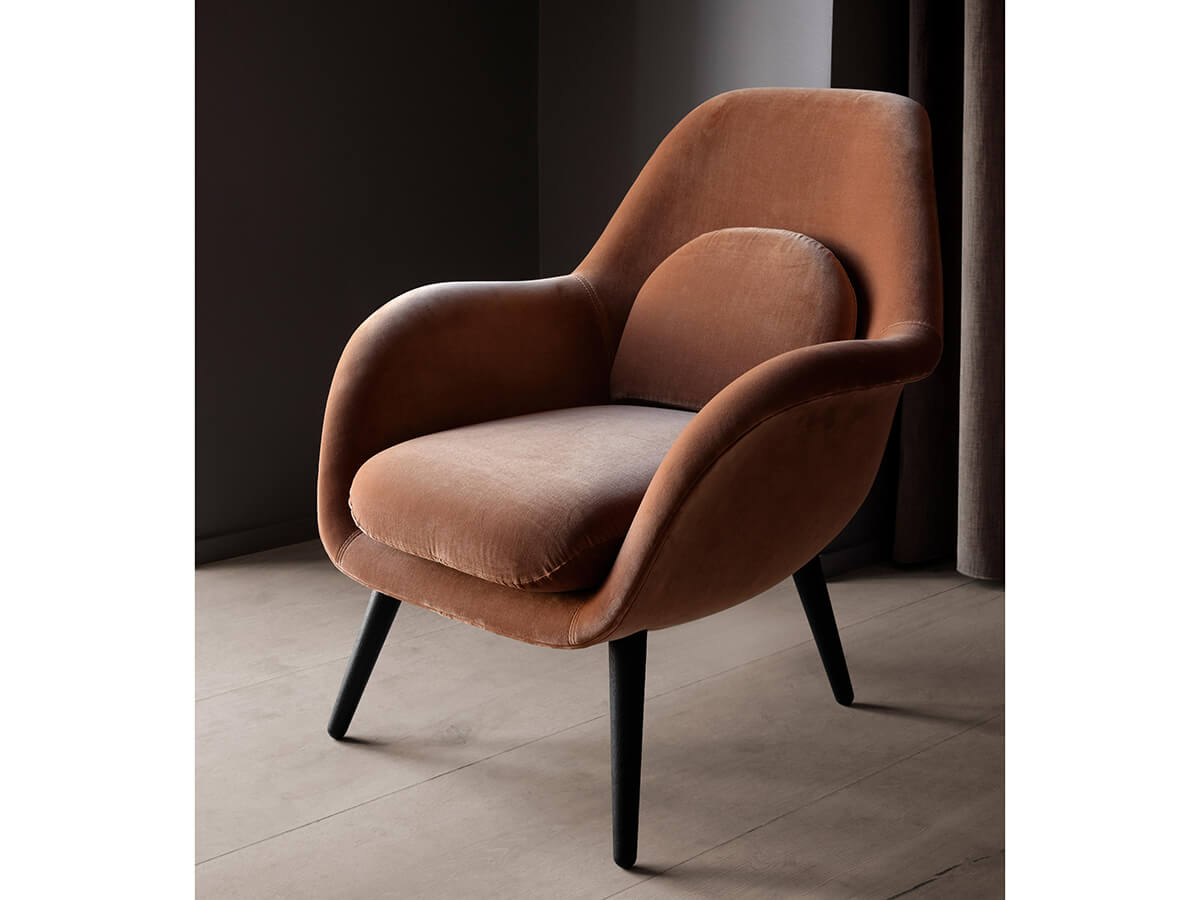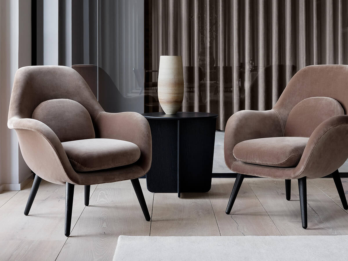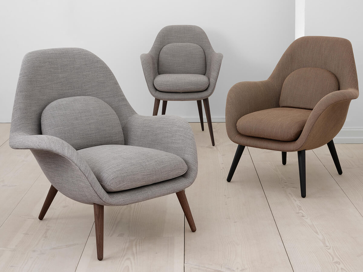 La poltrona Swoon di Fredericia può già essere considerata un classico del nuovo design scandinavo seppur sia stata disegnata soltanto nel 2016. Porta la firma dello studio Space Copenhagen, una delle realtà più interessanti del design danese contemporaneo, con un grande expertise nella realizzazione di ristoranti stellati e hotel di lusso. La poltrona Swoon stessa risulta perfetta sia per realizzazioni contract e spazi comuni che per un ambito domestico, grazie alla forma peculiare della sua scocca che permette una seduta comoda e rilassata a metà strada fra quella di una lounge chair e una bergère. Dal punto di vista stilistico colpisce la curva sinuosa che allarga la scocca verso l’esterno, andando a definire due ampi braccioli. È disponibile anche nella versione Swoon Lounge Petit dalla seduta più stretta, che può essere realizzata sia con base in legno che con base girevole a quattro razze.