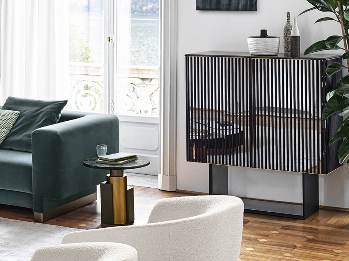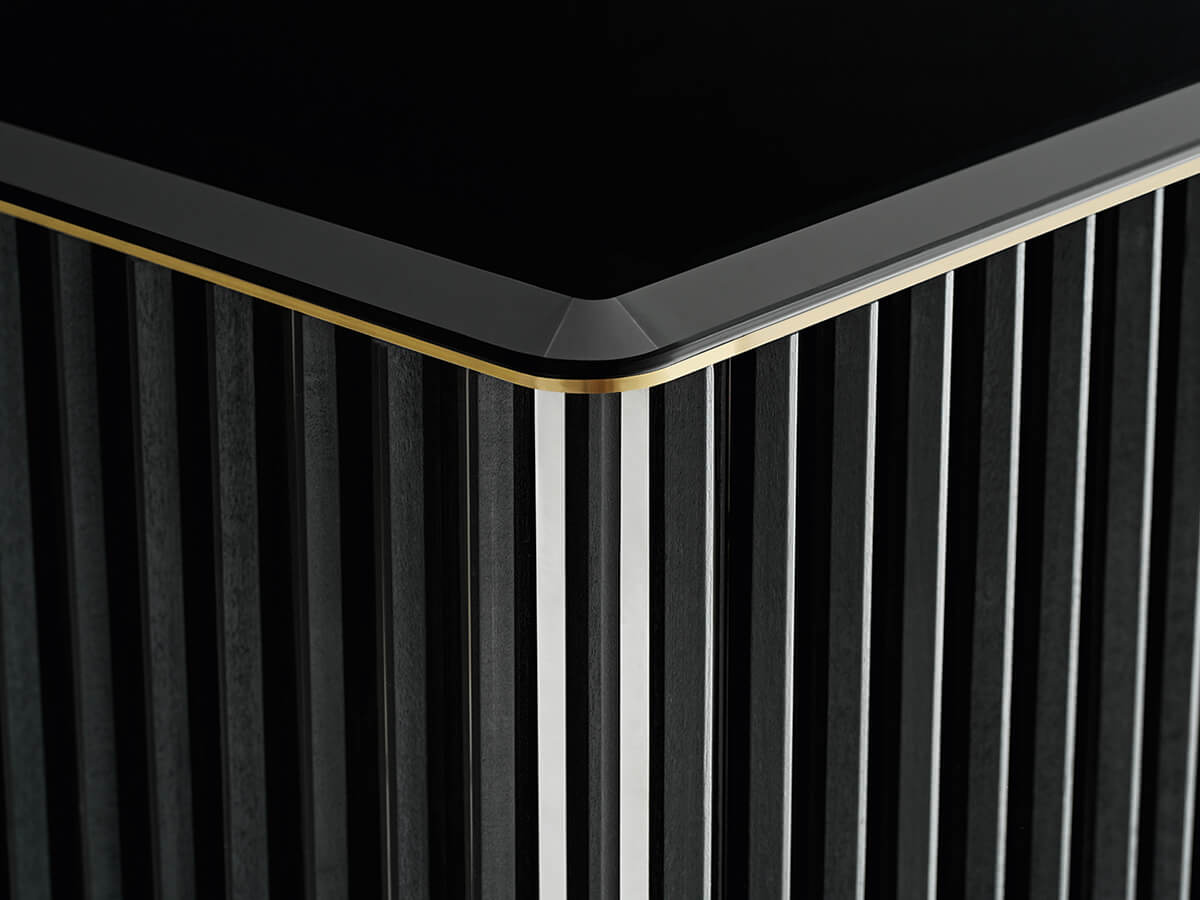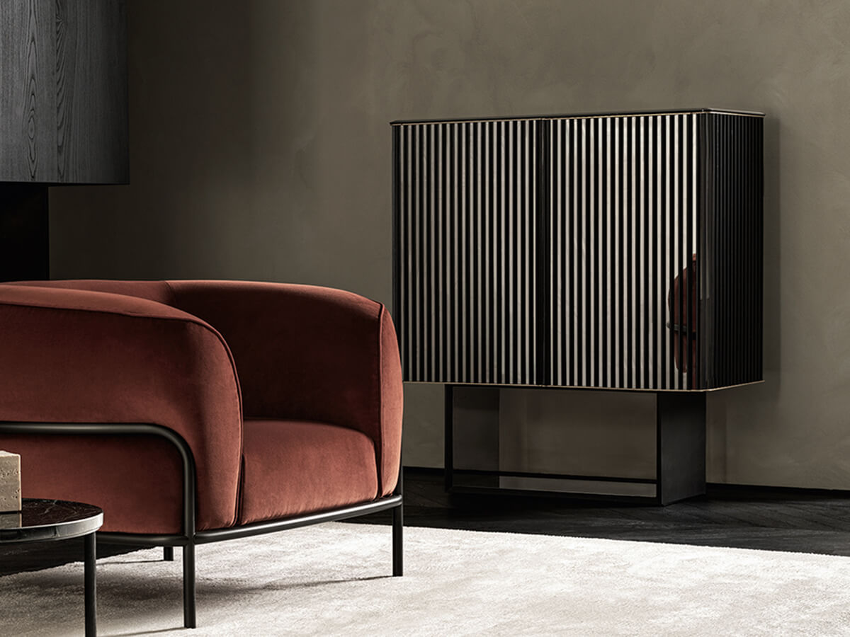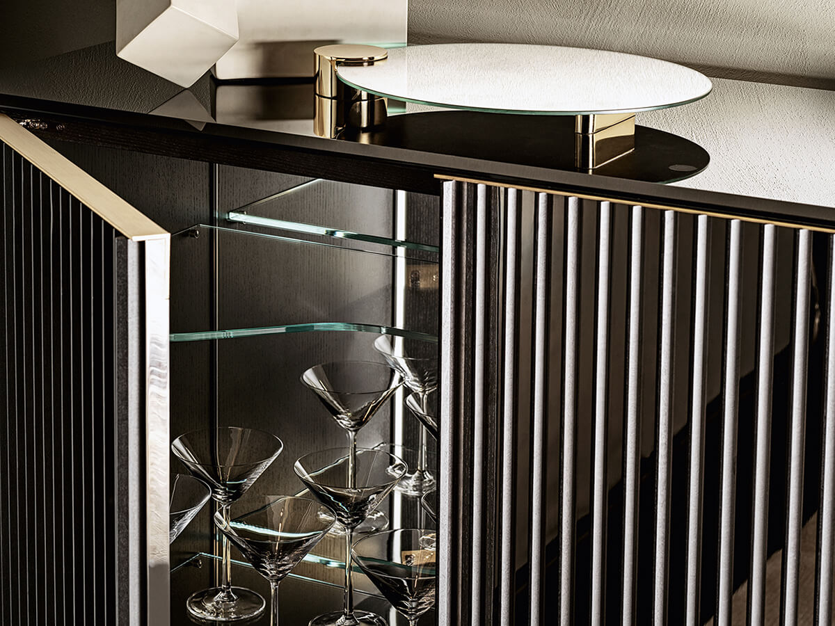La madia 5th Avenue di Gallotti&Radice si caratterizza per la raffinata lavorazione delle ante che la rende un pregiato oggetto di alto artigianato. L’intera struttura di 5th Avenue è infatti rivestita in acciaio inox “supermirror” con effetto specchiante, a cui sulle ante vengono sovrapposti sottili listelli verticali in massello di frassino tinto nero che vanno a costituire una decorazione geometrica e riccamente lussuosa, combinandosi con il riflesso dell’acciaio in un trompe l’oeil di pregevole suggestione. La madia è poi sormontata da un top in cristallo “Grigio Italia” retro verniciato e poggia su un ampio e rigoroso basamento squadrato e cavo, rivetsiuta anch’essa in acciaio “supermirror” nella finitura in cromo nero. È disponibile anche in versione bassa “5th Avenue Crédence”.