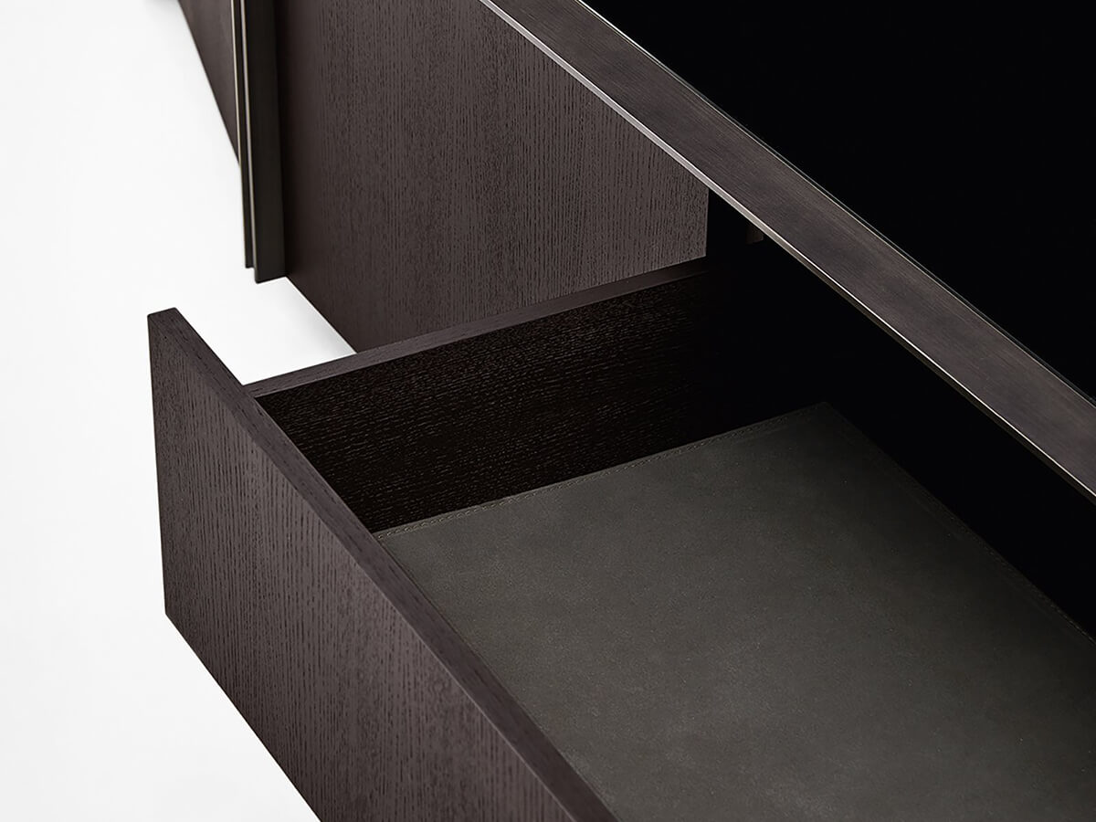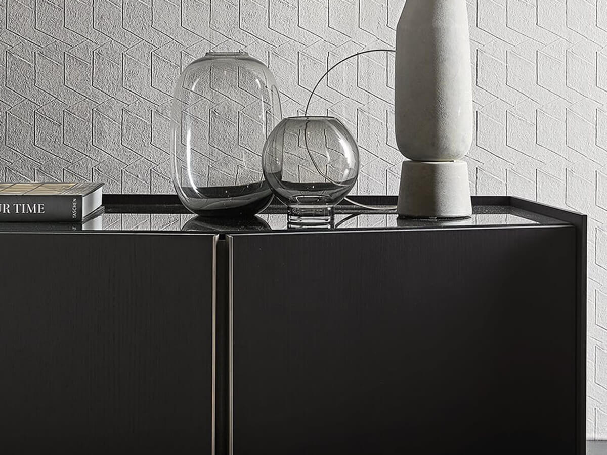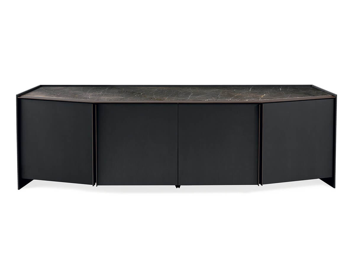 Imponente e scenografica, la madia Athus di Gallotti&Radice cattura l’attenzione con i suoi volumi e con la sua peculiare geometria aggettante in cui l’angolo delle ante proietta in avanti la parte centrale estendendola verso l’osservatore e garantendo maggiore capienza. Disponibile in diverse configurazioni, sia alte che basse, Athus poggia direttamente a terra senza alcuna base e può essere completata con un top in marmo, che ne accentua il senso di statuaria solidità, oppure con un piano in cristallo retroverniciato. Ante e struttura sono in frassino laccato nero a poro aperto, con dettagli metallici verniciati in color bronzo. L’interno presenta schienali a specchio e un ripiano in cristallo extralight, oltre alla possibilità di inserimento di cassetti push-pull con fondo in pelle scamosciata (solo per alcune versioni).
