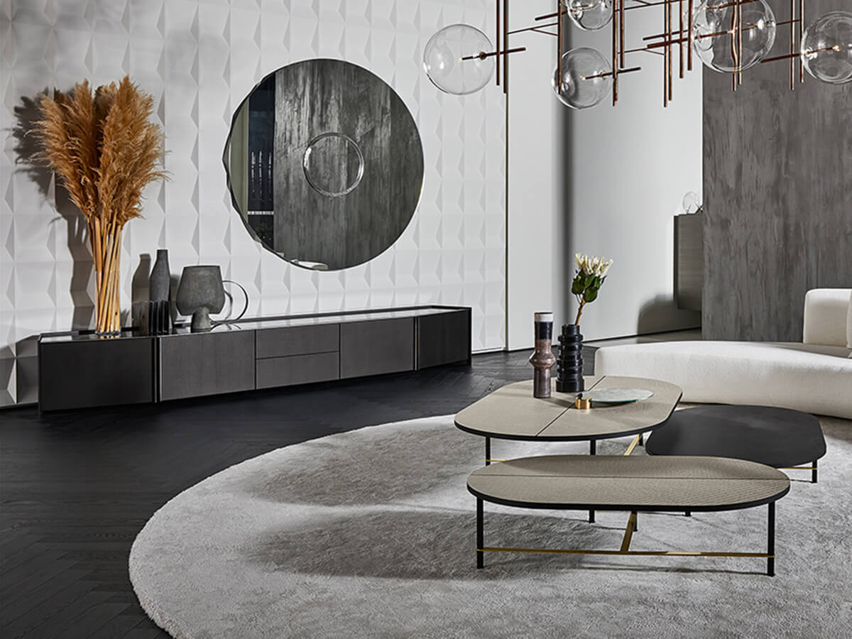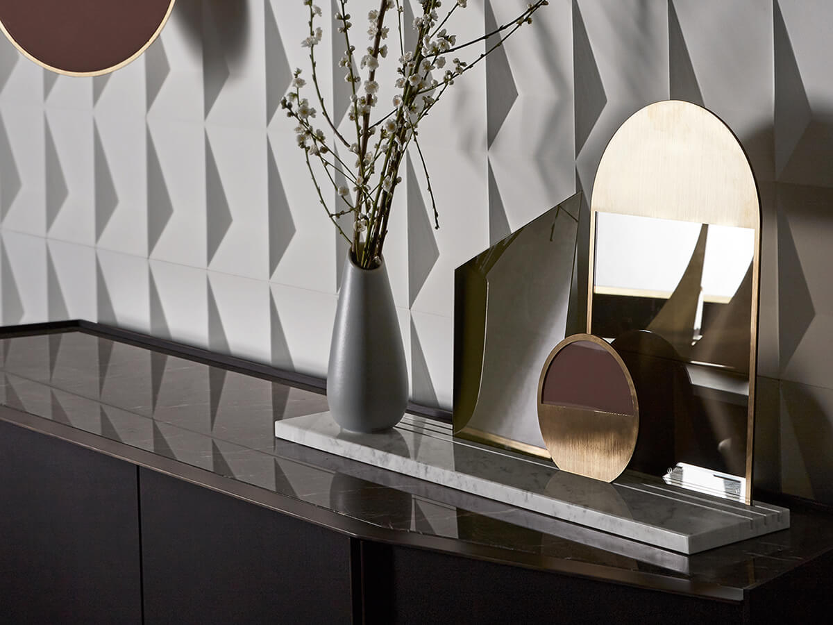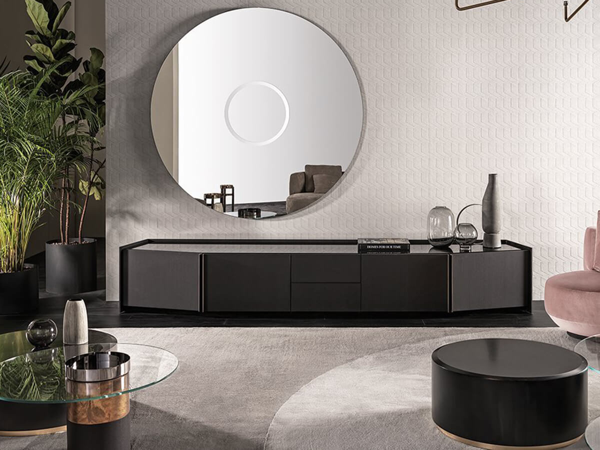 Imponente e scenografica, la madia Athus di Gallotti&Radice cattura l’attenzione con i suoi volumi e con la sua peculiare geometria aggettante in cui l’angolo delle ante proietta in avanti la parte centrale estendendola verso l’osservatore e garantendo maggiore capienza. Disponibile in diverse configurazioni, sia alte che basse, Athus poggia direttamente a terra senza alcuna base e può essere completata con un top in marmo, che ne accentua il senso di statuaria solidità, oppure con un piano in cristallo retroverniciato. Ante e struttura sono in frassino laccato nero a poro aperto, con dettagli metallici verniciati in color bronzo. L’interno presenta schienali a specchio e un ripiano in cristallo extralight, oltre alla possibilità di inserimento di cassetti push-pull con fondo in pelle scamosciata (solo per alcune versioni).