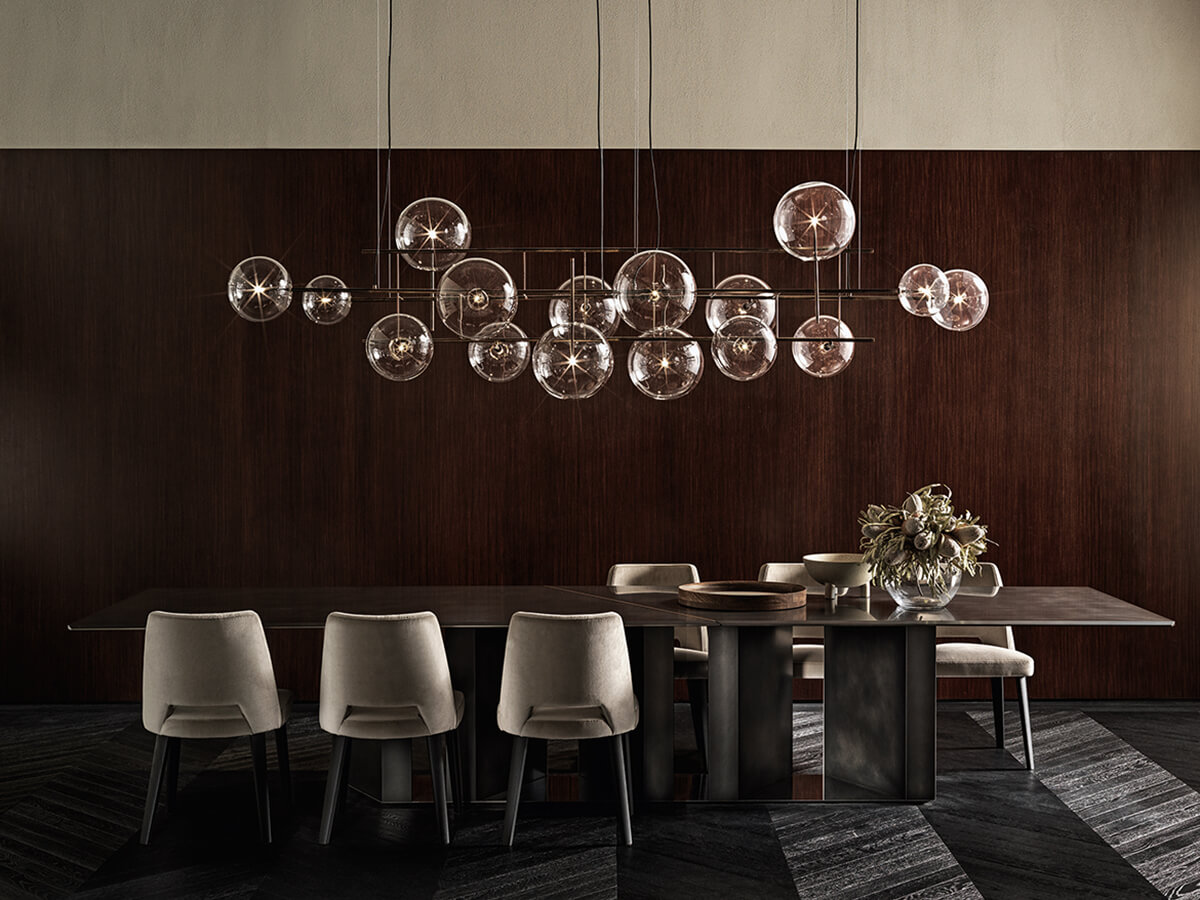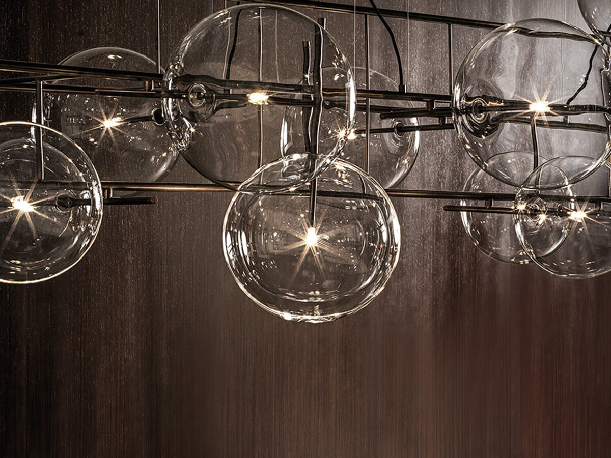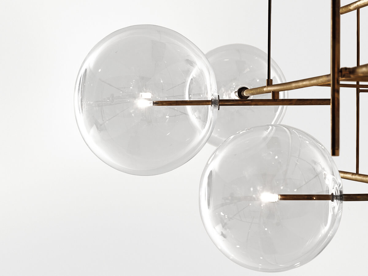 La lampada a sospensione Bolle è uno dei prodotti più iconici e riconoscibili del catalogo Gallotti&Radice. Disegnata da Massimo Castagna, basa il proprio inconfondibile fascino sull’armonia fra la preziosa struttura in ottone brunito a mano, che assume in ogni pezzo una connotazione unica sempre diversa grazie alla lavorazione artigianale, e le eteree sfere in cristallo trasparente soffiato a bocca che fungono da diffusore per l’illuminazione a led. Bolle Orizzontale è la versione più lussuosa e spettacolare dell’intera famiglia di lampade Bolle: si tratta di un’imponente lampadario in cui la struttura in ottone assume forma composita allungandosi in diverse diramazioni a cui si agganciano 10 oppure 16 sfere con un effetto fortemente scenografico.*Caratteristiche tecniche: lampada a luce Led dimmerabile – lampadine incluse