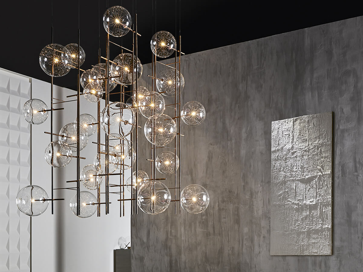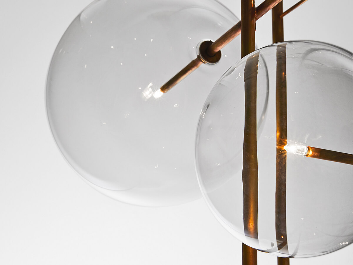 La lampada a sospensione Bolle è uno dei prodotti più iconici e riconoscibili del catalogo Gallotti&Radice. Disegnata da Massimo Castagna, basa il proprio inconfondibile fascino sull’armonia fra la preziosa struttura in ottone brunito a mano, che assume in ogni pezzo una connotazione unica sempre diversa grazie alla lavorazione artigianale, e le eteree sfere in cristallo trasparente soffiato a bocca che fungono da diffusore per l’illuminazione a led. Bolle Tela ne estremizza il concept, facendo diventare protagonista l’ottone della struttura, organizzato in un composito reticolo verticale che dà alla lampada le valenze di una vera e propria scultura sospesa. È disponibile in due differenti versioni, a 8 oppure a 6 sfere.*Caratteristiche tecniche: lampada a luce Led dimmerabile – lampadine incluse