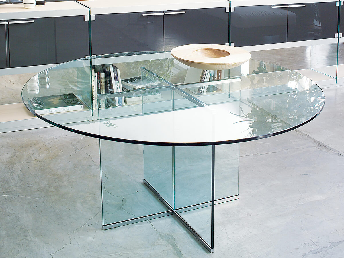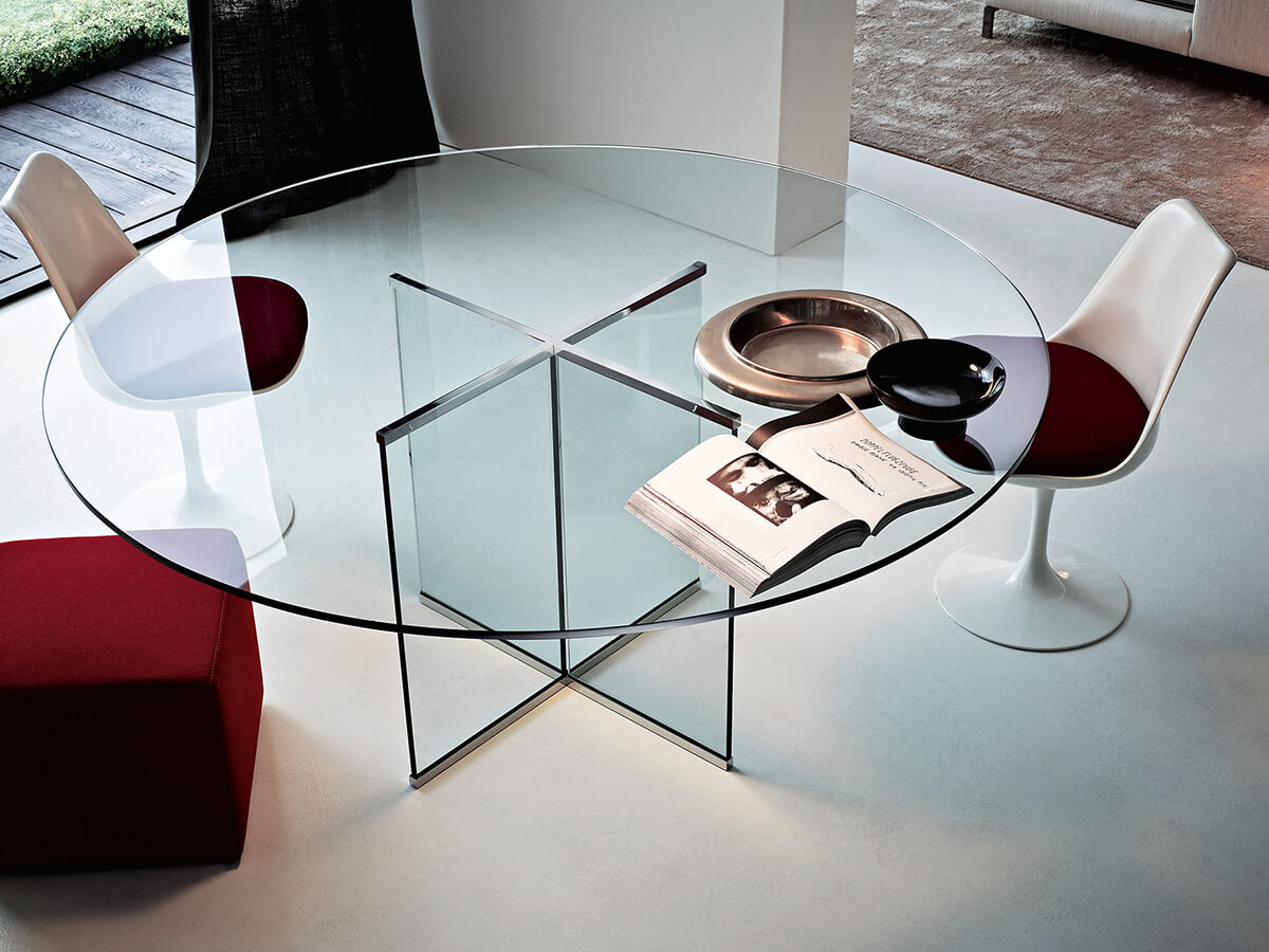 Eros è un grande classico della produzione Gallotti&Radice: datato 1971, il suo design è firmato direttamente dallo storico titolare dell’azienda, Pierangelo Gallotti. Il suo fascino trova radice nei giochi di trasparenze che caratterizzano ogni sua parte: sia il piano che il grosso sostegno centrale quadripartito sono infatti interamente in cristallo, disponibile in finitura trasparente oppure extralight. Oltre alla tradizionale versione rotonda è disponibile anche inversioni con piano rettangolare o ovale, in cui il sostegno è raddoppiato e prende la forma di due grosse basi centrali. *Caratteristiche tecniche: parti metalliche in ottone cromato