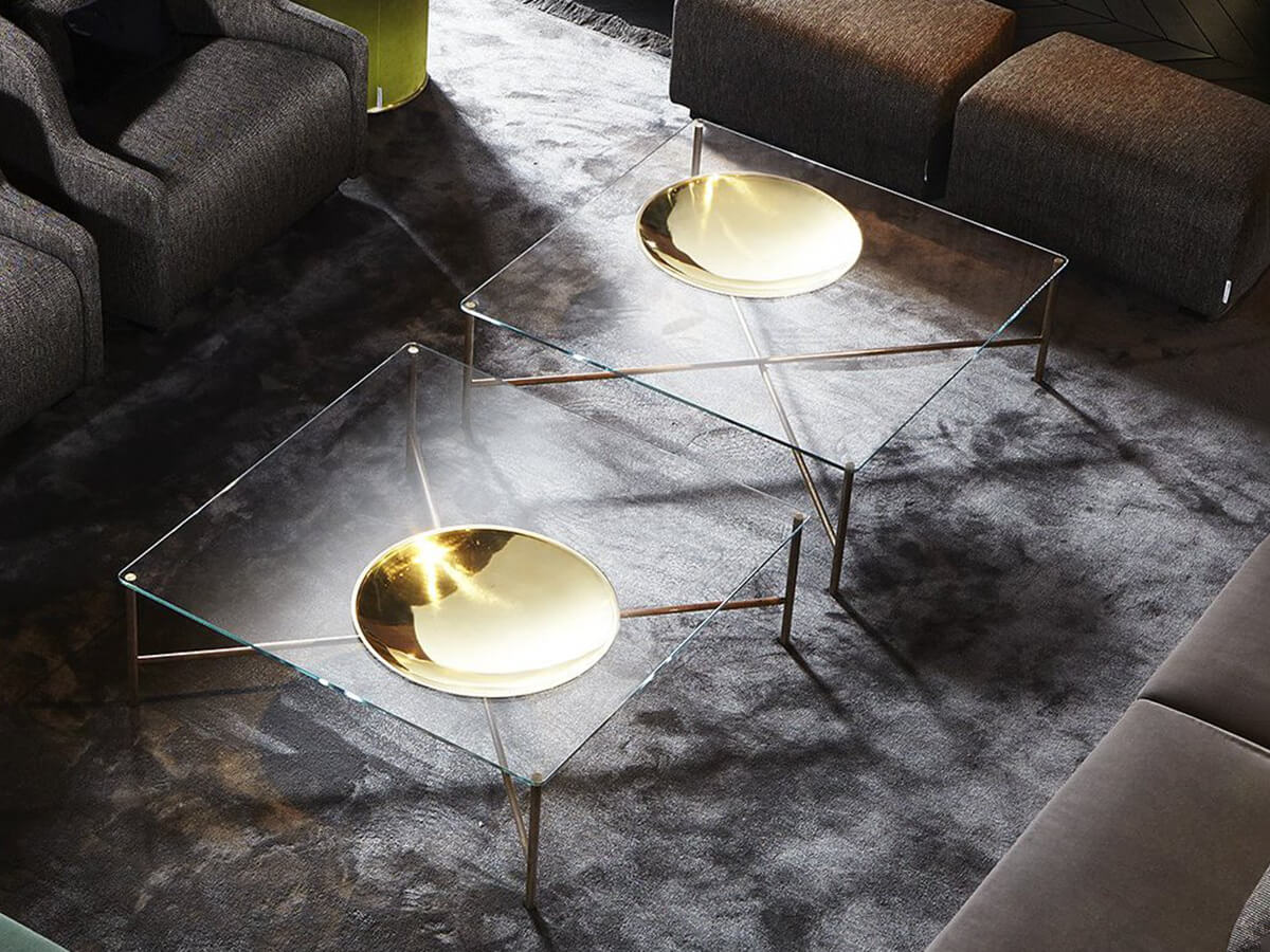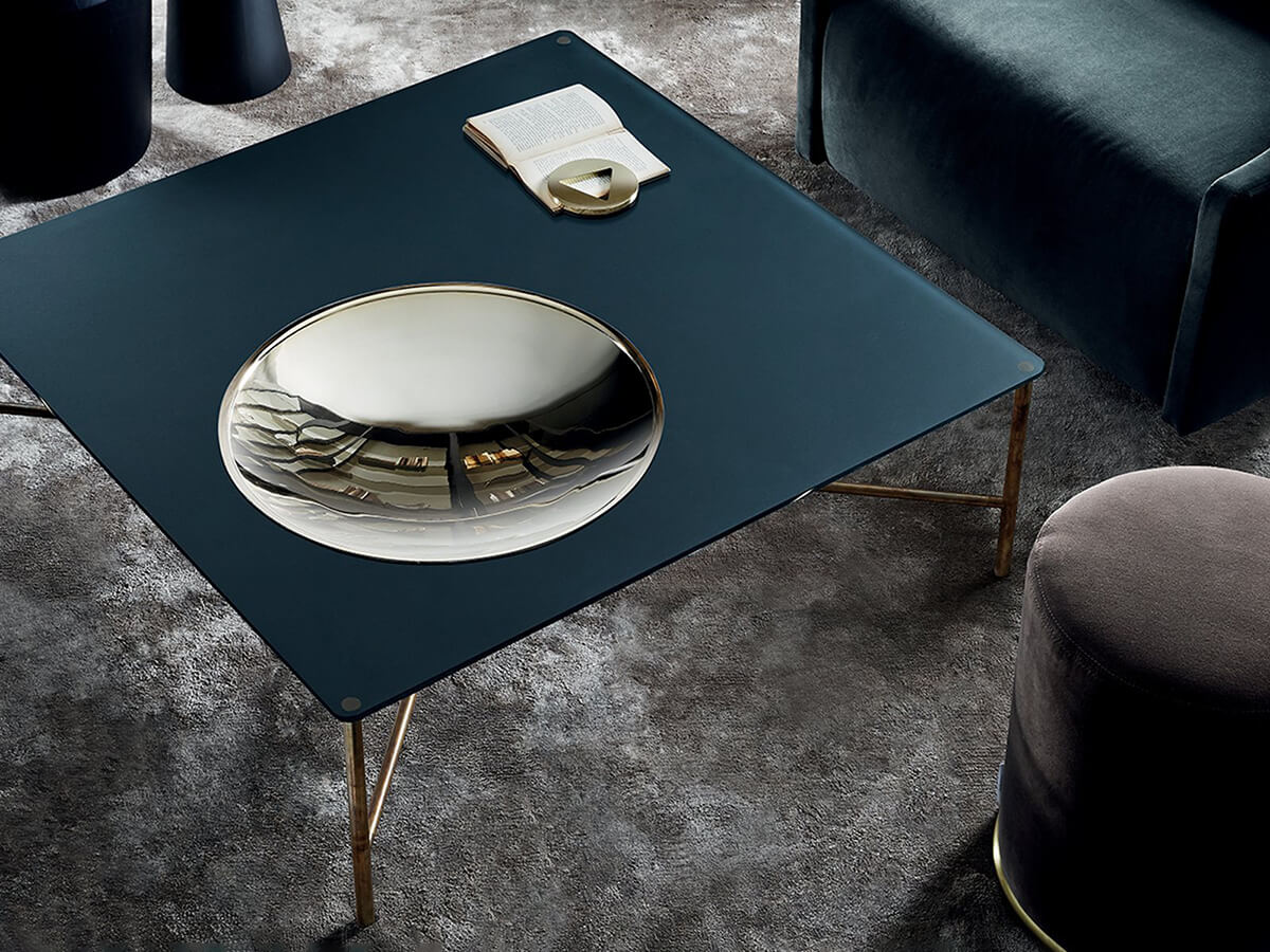 Il tavolino Golden Moon, firmato da Massimo Castagna per Gallotti&Radice, incarna nelle sue forme una poeticità delicata d’ispirazione orientale unita in una sapiente connubio con la preziosità dei materiali. La leggera struttura è composta da quattro sottili gambe in ottone brunito rafforzate da traverse di sostegno a “X” e sorregge un piano in cristallo (trasparente o retri verniciato) in cui trovano spazio uno o più inserti stondati in ottone lucido con funzione di vassoio. Come sulla superficie lunare, il piano di Golden Moon lascia dunque spazio alla presenza di un grosso “cratere” le cui pareti lisce e luminose catturano l’occhio con i suoi deliziosi riflessi.*Caratteristiche tecniche: struttura in ottone brunito e piatto in ottone lucido