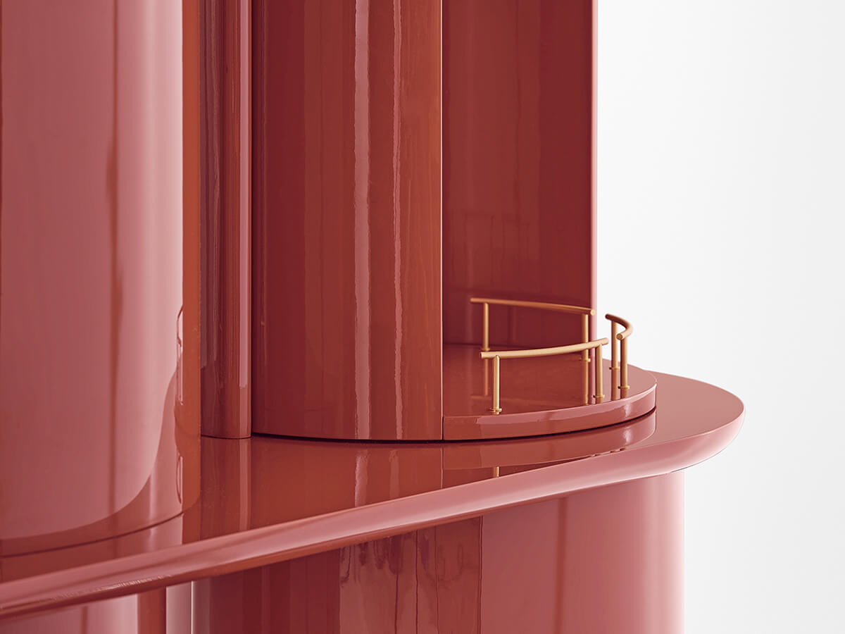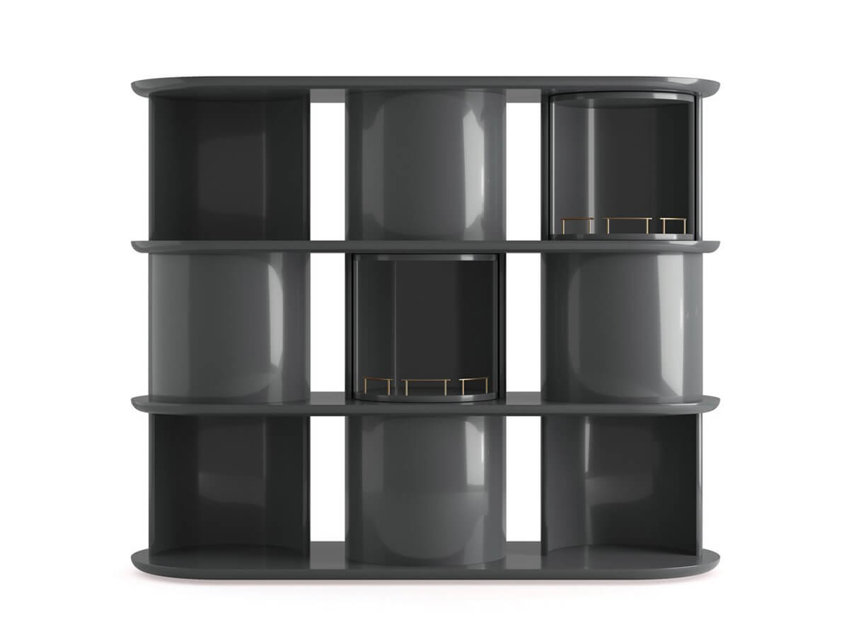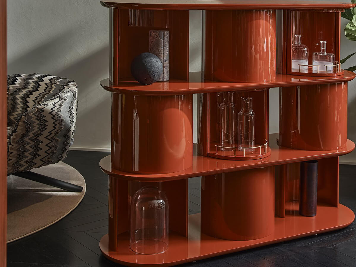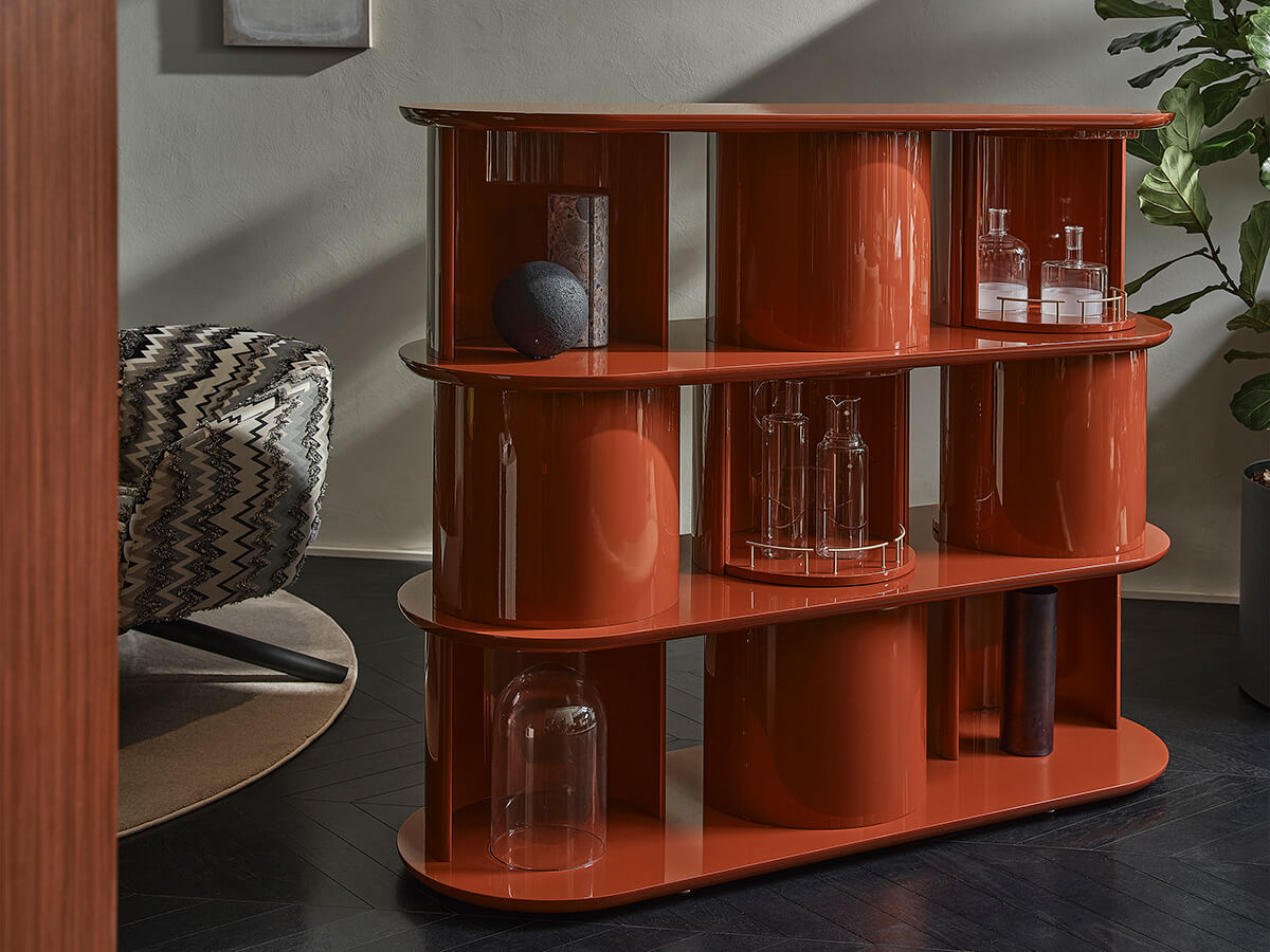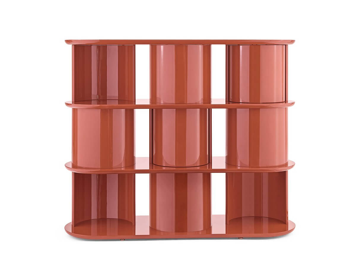 Figlia dell’estro del geniale Pietro Russo, la libreria Hide&Seek di Gallotti&Radice presenta un design ingegnoso e creativo: ogni suo ripiano è infatti suddiviso in vani da tre mezzi cilindri, che in alcune versioni possono essere resi richiudibili grazie allo scorrimento di un secondo mezzo cilindro girevole. I cilindri presentano aperture orientate in entrambi i sensi, facendo di Hide&Seek una libreria bifacciale ideale per un posizionamento a centro-stanza. Hide&Seek è interamente laccata, lucida oppure opaca, ed è disponibile in differenti colori: “Rosso Persia”, acceso e vivace, ideale per dare un tono fresco e determinato all’ambiente, oppure “Grigio Londra”, più sobrio e versatile.