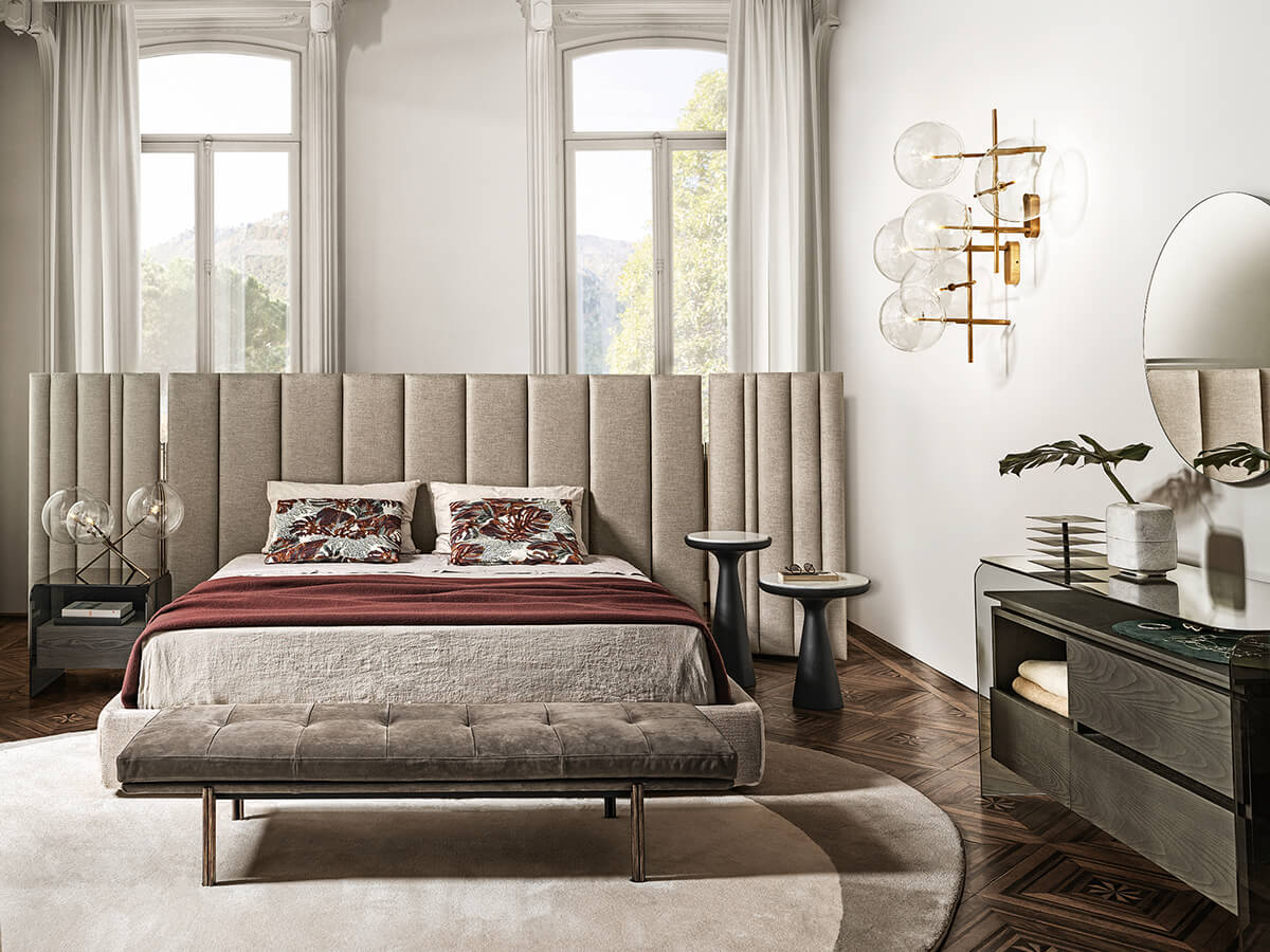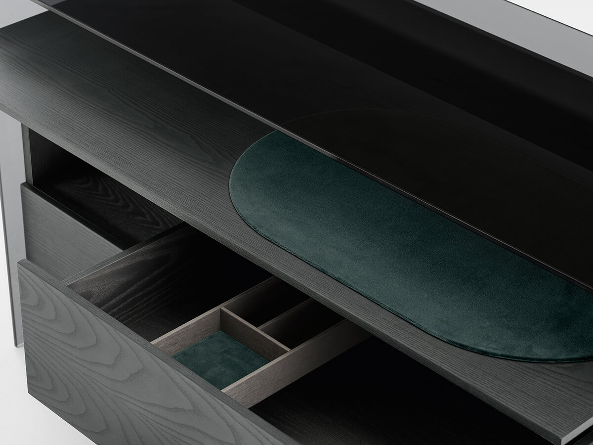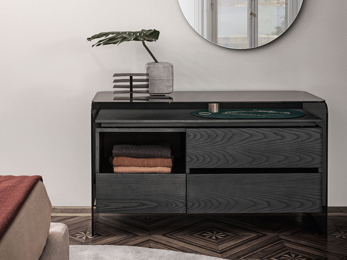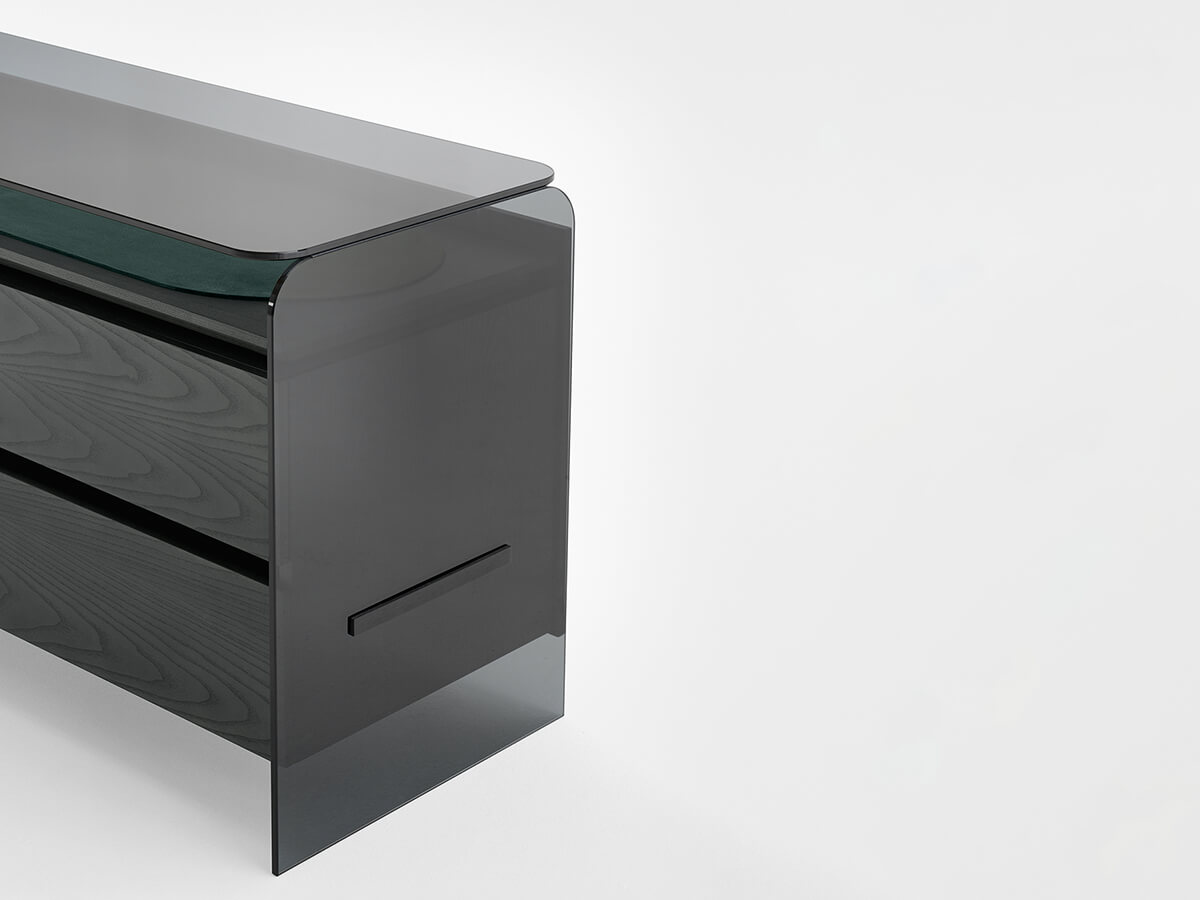 La serie di comodini e comò Holly di Gallotti&Radice gioca in maniera sapiente con le interazioni fra legno e cristallo per dare vita a una linea di contenitori per la zona notte di grande eleganza. In Holly infatti fianchi e piano superiore sono realizzati in cristallo, ricavati da tre diverse lastre dagli angoli dolcemente arrotondati, mentre struttura e cassetti sono realizzabili in frassino tinto nero poro aperto oppure tinto grigio smoke. Il comodino Holly è attrezzato con un singolo cassetto e un ampio vano a giorno, mentre il comò affianca due cassetti più larghi a un terzo più piccolo e ad un vano a giorno.