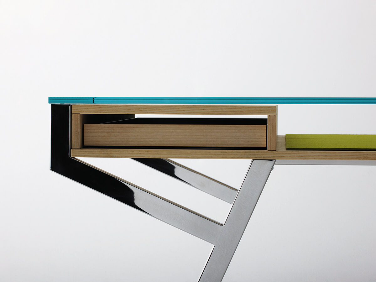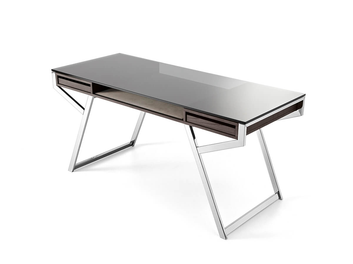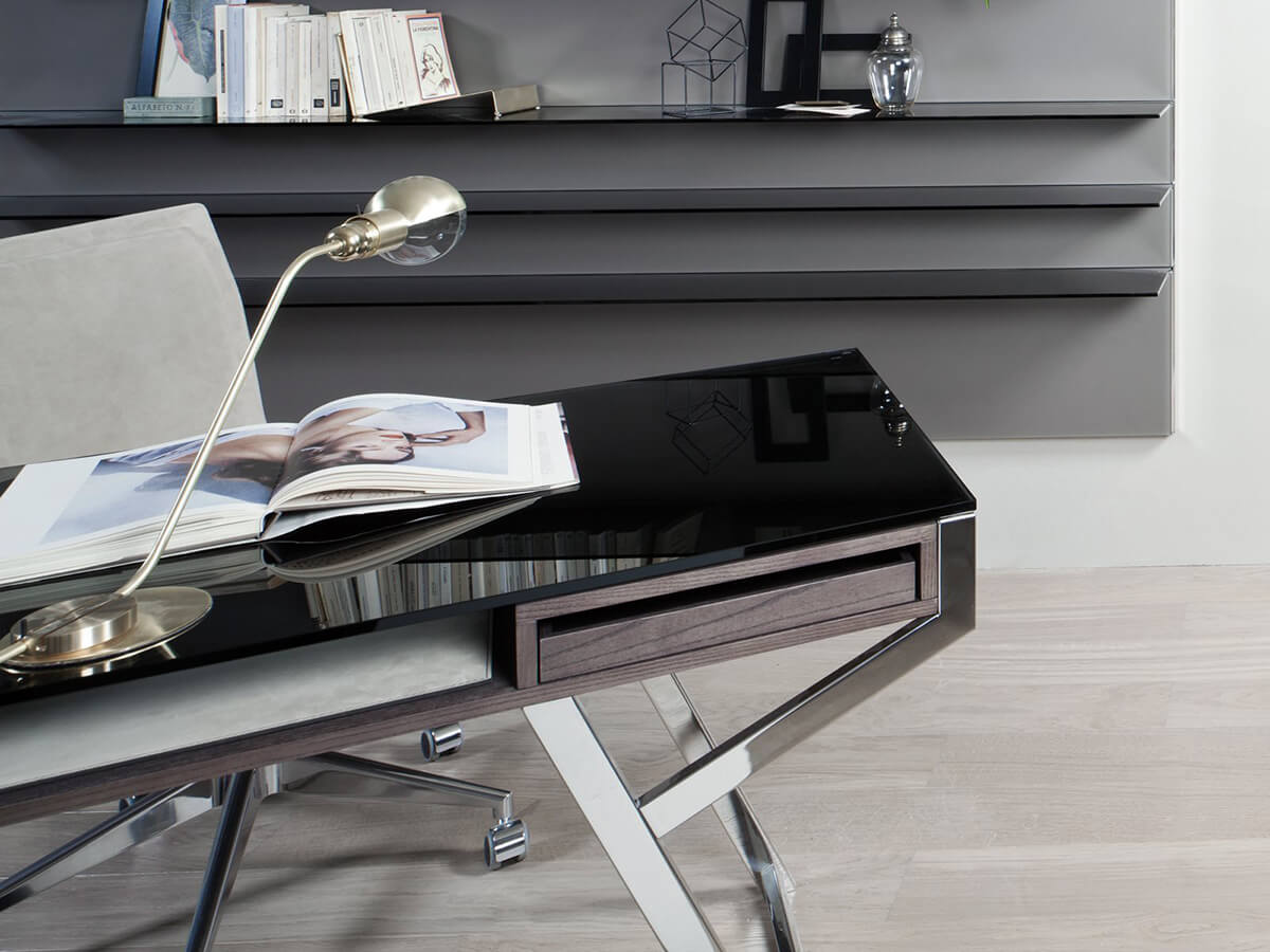 Disegnato da Paolo Maria Fumagalli, lo scrittoio Luì di Gallotti&Radice si caratterizza per la funzionale forma a cavalletto e per gli ingombri limitati che lo rendono un prodotto perfetto per la realizzazione di un home office ricco di stile. La solida struttura metallica, divaricata in due larghe e stabili gambe laterali, è disponibile sia in finitura inox (lucido o satinato) sia in una versione più calda in metallo brunito. Sotto al piano in cristallo trova posto un piccolo ripiano inferiore, chiuso sui due lati da due cassetti che conferiscono a Luì un’immagine di perfetta simmetria.*Caratteristiche tecniche: ripiano inferiore e cassetti in frassino naturale, tinto wengè, tinto tabacco, bianco o nero; tappetino in feltro o in pelle scamosciata