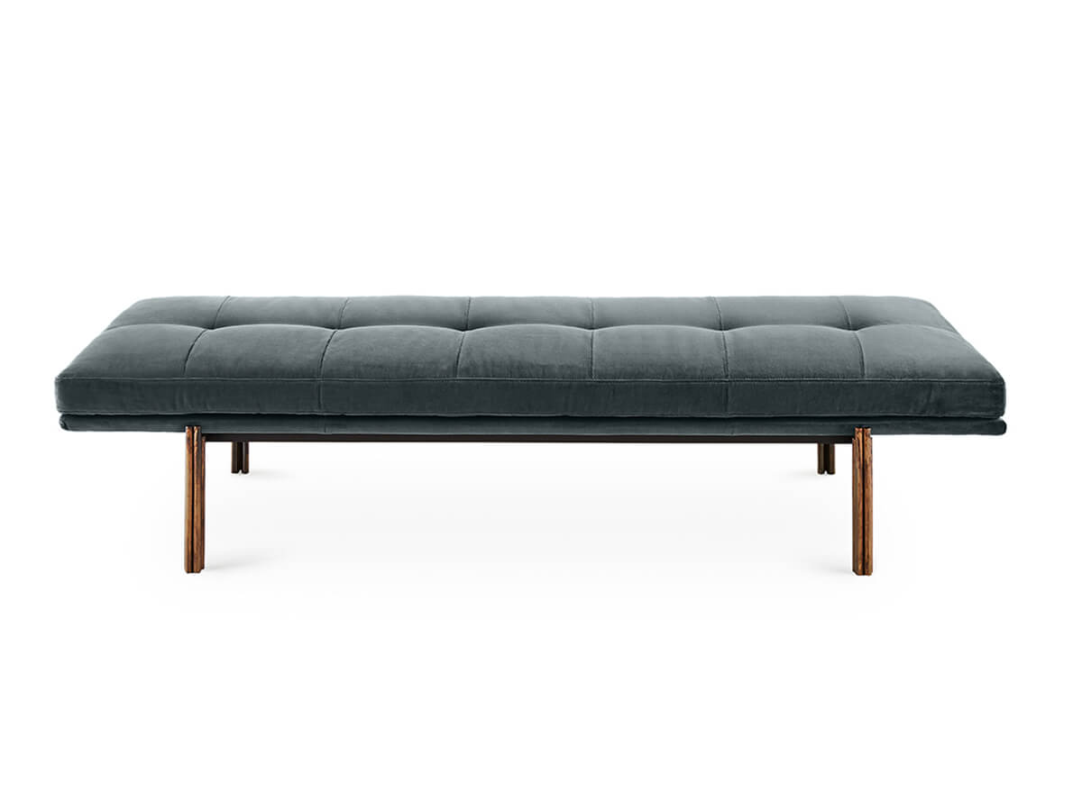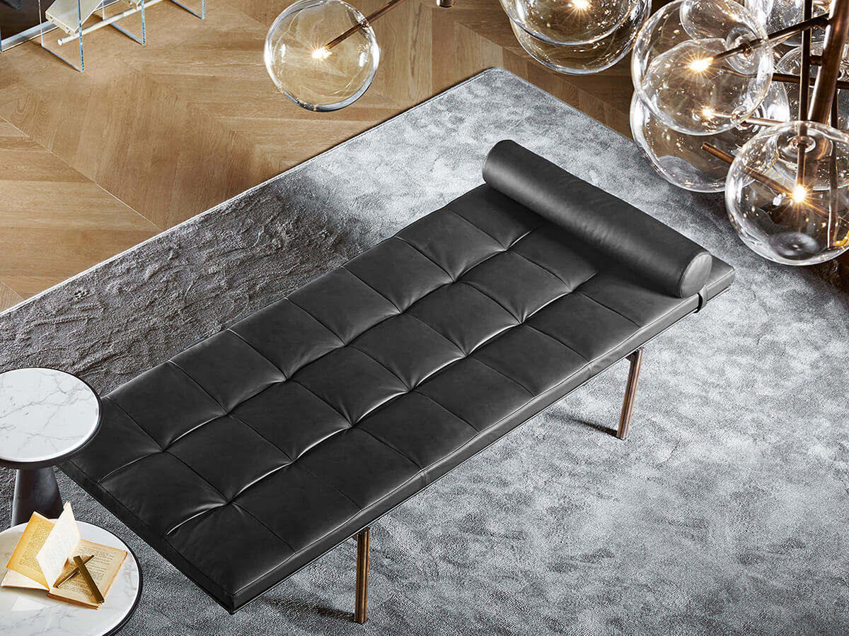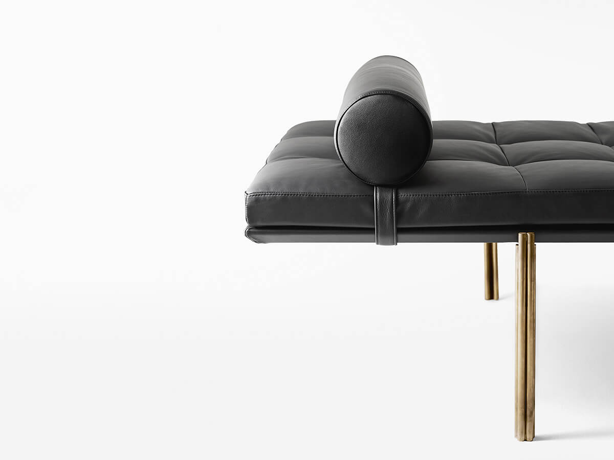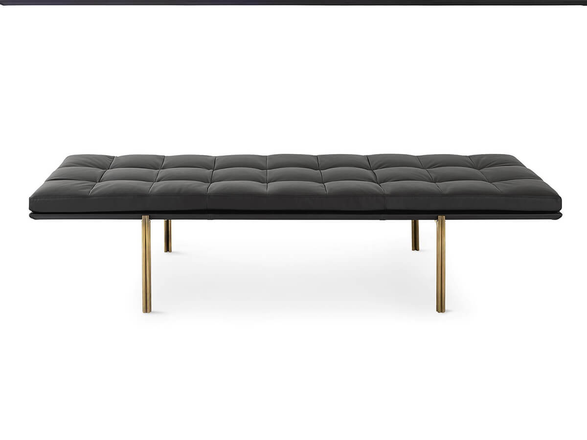 Il Daybed Twelve di Gallotti&Radice, disegnato da Massimo Castagna, riprende le forme austere tipiche del Bauhaus impreziosendole con l’uso di uno scintillante ottone brunito per le gambe e le parti metalliche. Ideale omaggio allo stile di un grande maestro come Ludwig Mies van Der Rohe, il daybed Twelve si presenta con un lungo piano rigidamente orizzontale occupato da un materassino dalla ricca decorazione trapuntata a quadrotti. Il materassino può essere rivestito in pelle o in tessuto nei vari colori del campionario Gallotti&radice e può essere attrezzato anche con l’aggiunta di un poggiatesta che ne rende più confortevole l’uso.*Caratteristiche tecniche: struttura in ottone brunito