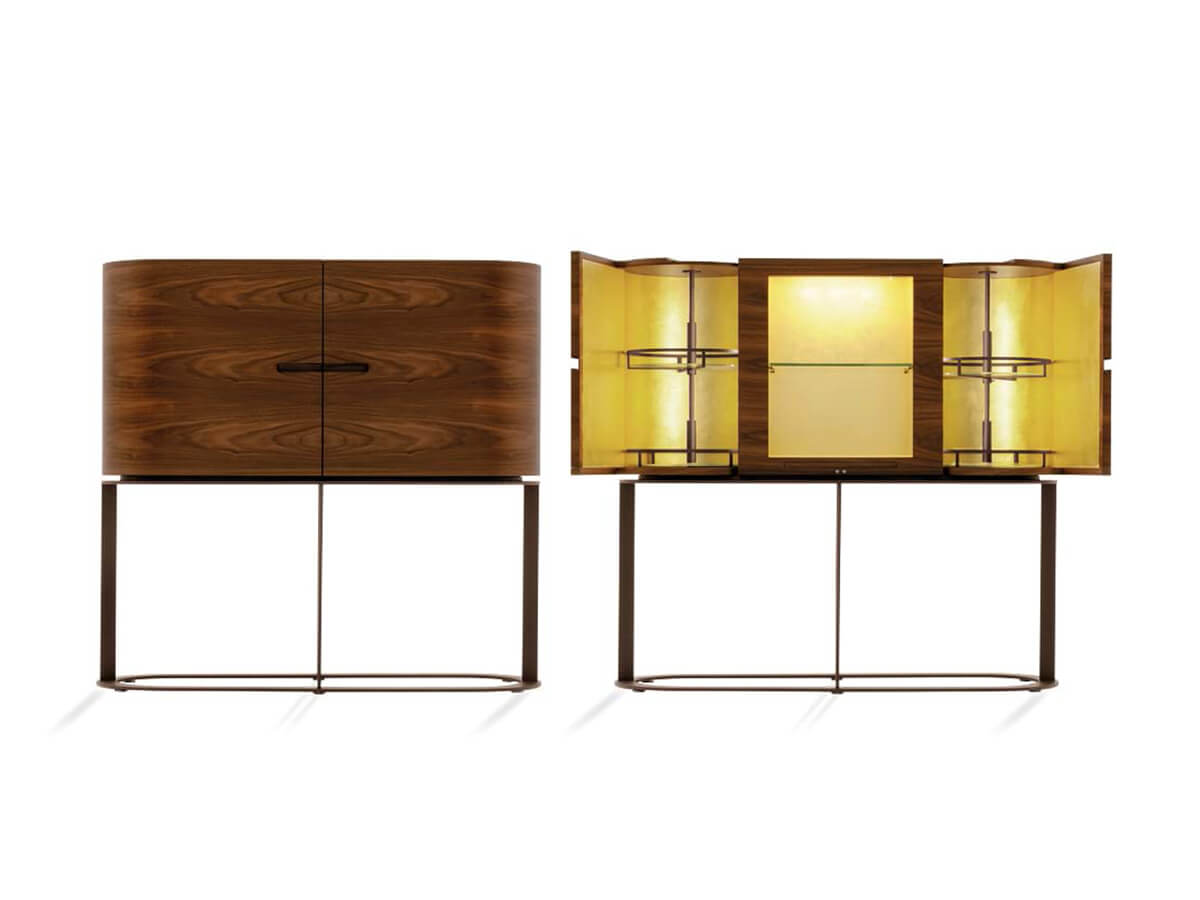 Eleganza e design si intrecciano in un tutt’uno inscindibile nel mobile bar Ino di Giorgetti. Questo mobile si può presentare a singolo o a due ante in noce canaletto, e incarna perfettamente lo stile immaginato di Chi Wing Lo la cui ispirazione si esprime spesso nelle forme arrotondate e materiali utilizzati negli anni ’50. La parte interna di Ino è disponibile in diverse versioni fra cui Sycomore frisè tinto bianco o decorazione dorata in foglia. All’interno sono disponibili diversi vassoi girevoli in metallo verniciato, regolabili in altezza e completati da ripiani in cristallo con illuminazione Led. Il profilo arrotondato e la struttura di sostegno essenziale, unita alla qualità dei materiali utilizzati, rendono Ino un oggetto particolarmente pregevole.