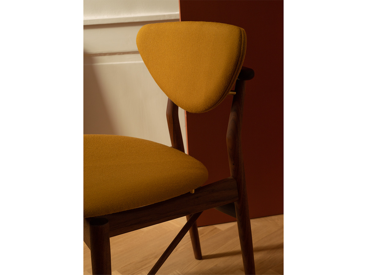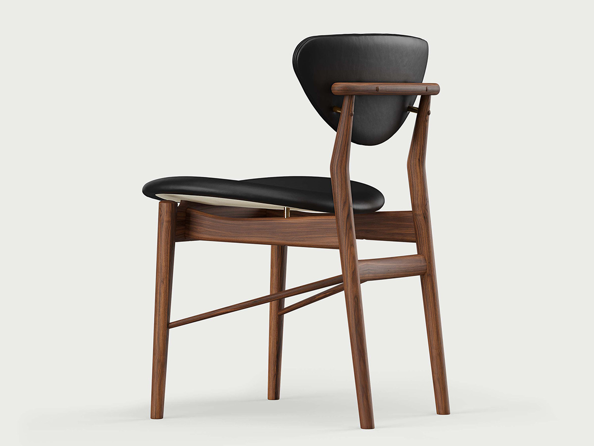 La sedia 108 di House of Finn Juhl è un grande esempio di raffinato modernismo danese Mid-Century. Il segreto del suo fascino risiede nei dettagli: angoli e curve delle gambe e degli elementi di sostegno sono attentamente studiati in forme inusuali, di difficile lavorazione, che conferiscono alla sedia un aspetto dinamico ed organico sorprendentemente moderno. La sedia 108 è un pezzo di alta ebanisteria, una seduta sofisticata per veri intenditori, grande classico del design danese fin dal suo lancio nel 1946. Seduta e schienale sono composti da due distinti elementi e possono essere rivestiti sia in pelle che in tessuto.
