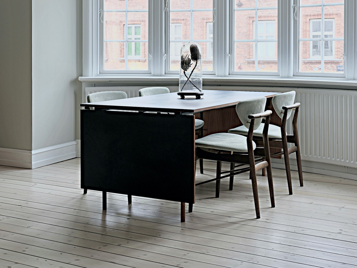 Finn Juhl (1912-1989) è uno dei massimi esponenti della scuola del design danese. Figura colta e raffinata, fu il grande dandy del design scandinavo degli anni d’oro, con complesse creazioni dalle forme organiche che si discostavano dal razionalismo imperante in quegli anni. Caratteristiche che all’epoca gli preclusero forse un successo di massa nella sua Danimarca, dove risultò un po’ oscurato dalle creazioni più accessibili di firme come Hans J. Wegner e Børge Mogensen, ma che gli valsero un’imperitura fama di “designer di tendenza per intenditori”, oggi più viva che mai. Finn Juhl, architetto di formazione, si considerava un designer autodidatta: aveva infatti iniziato a disegnare arredi per la propria casa, sul finire degli anni ’30, facendoli poi realizzare all’ebanista Arne Vodder con il quale strinse un forte sodalizio. Le imbottiture sottili e le curve complesse del legno delle sue creazioni (in parte ispirate alle sculture contemporanee di Hans Arp e Alexander Calder, accanto alle quali Juhl amava esporre le sue poltrone) resero a lungo difficile la produzione in serie dei suoi arredi. I primi a provarci furono gli americani, paese in cui a partire dagli anni ’50 Finn Juhl trovò una grande fama: le sue creazioni prodotte dalla Baker Furniture raggiungono oggi sul mercato del vintage quotazioni da capogiro. Ad oggi l’unico produttore ufficiale dei suoi arredi è House of Finn Juhl, brand che ha curato una meticolosa azione di riscoperta e catalogazione delle sue opere. Come architetto Finn Juhl invece lavorò per undici anni nello studio di Vilhelm Lauritzen, dal 1934 al 1945, occupandosi principalmente di architettura degli interni. Fondò poi un proprio studio a Copenhagen nel 1945, con il quale progettò fra le altre cose gli interni della Trusteeship Council Chamber presso la sede ONU di New York.
