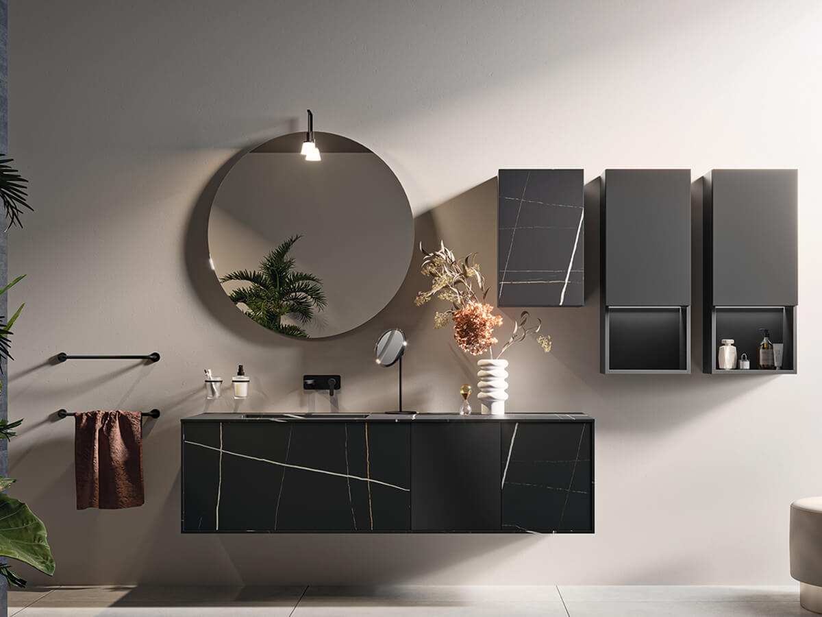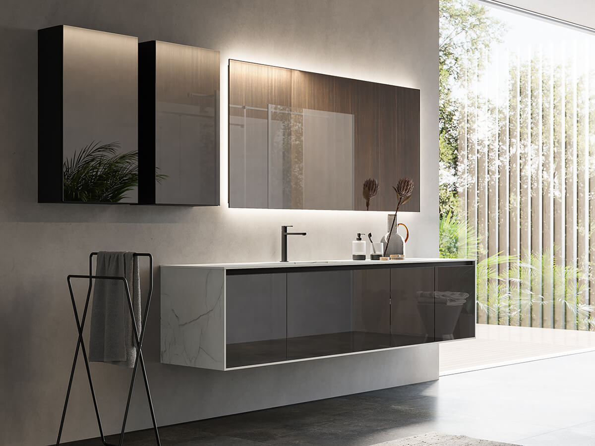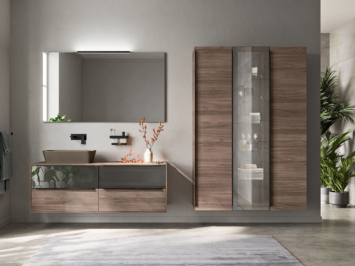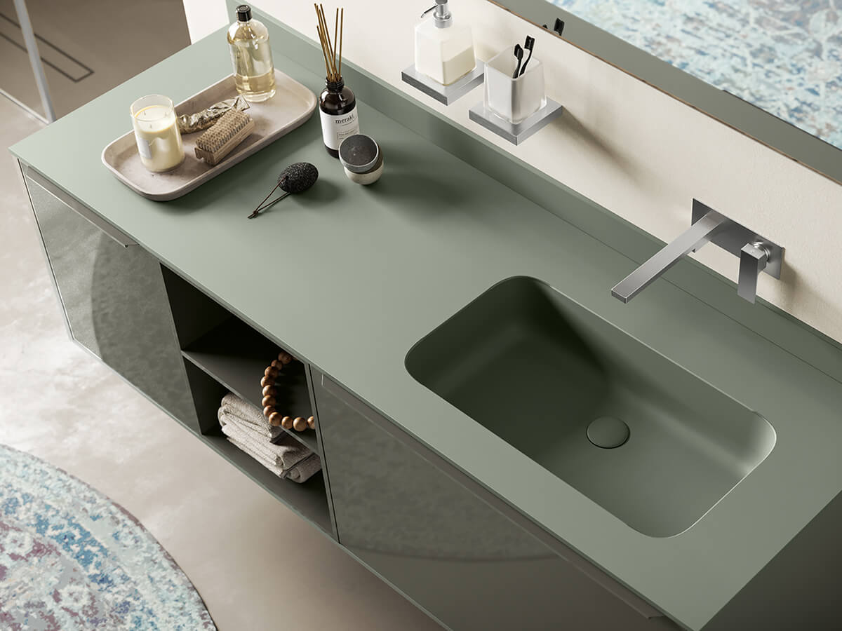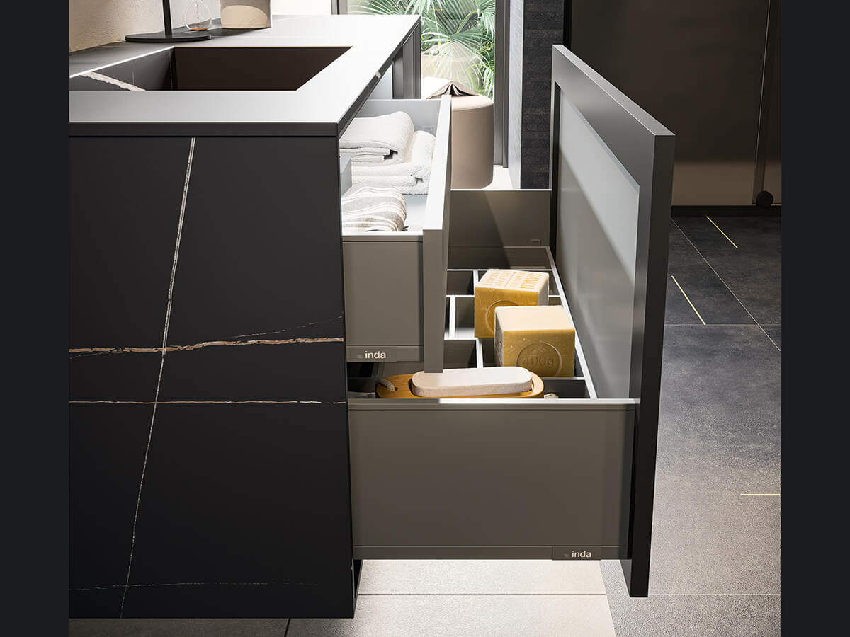 Minamale e versatile, il bagno Corretto di Inda presenta grosse e capienti cassettiere incastonate in maniera elegante ai quattro lati dalla struttura di sostegno composta da piano, fianchi e base. Le scelte del progettista possono dotarla di effetti radicalmente differenti: optando per una scelta di finiture a contrasto le cassettiere risultano come incorniciate dalla struttura, con un effetto pregevolmente decorativo, mentre se vengono accomunate dalla stessa finitura si ottengono composizioni più solide e monolitiche, di scenografica maestosità. Un uso sapiente di materiali quali laccati lucido o opachi, laminato HPL, gres opaco o legni decorativi consente di ottenere con Corretto la composizione giusta per ogni progetto. La collezione è compatibile con una grande varietà di lavabi, sia soprapiano che integrati nel top.
