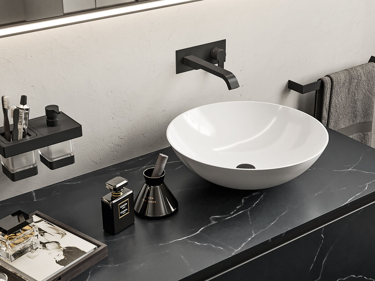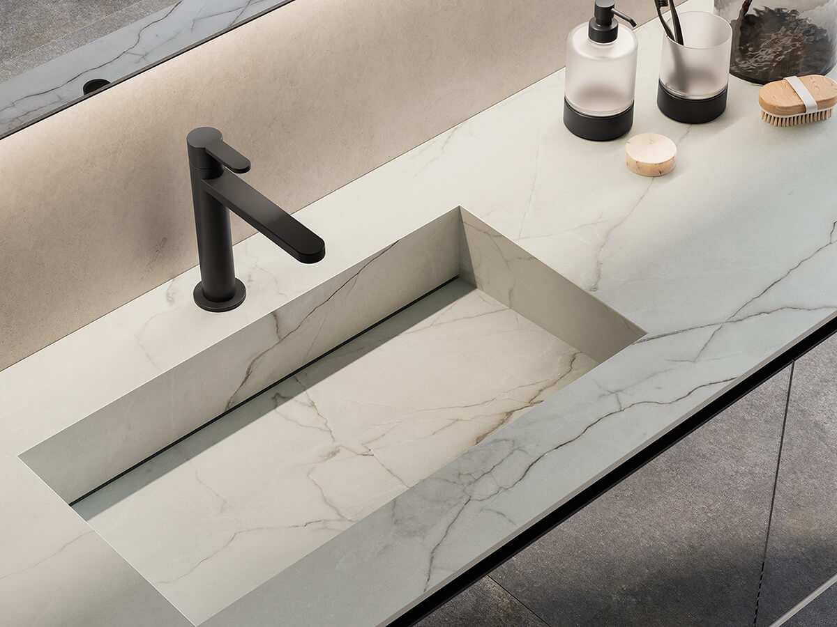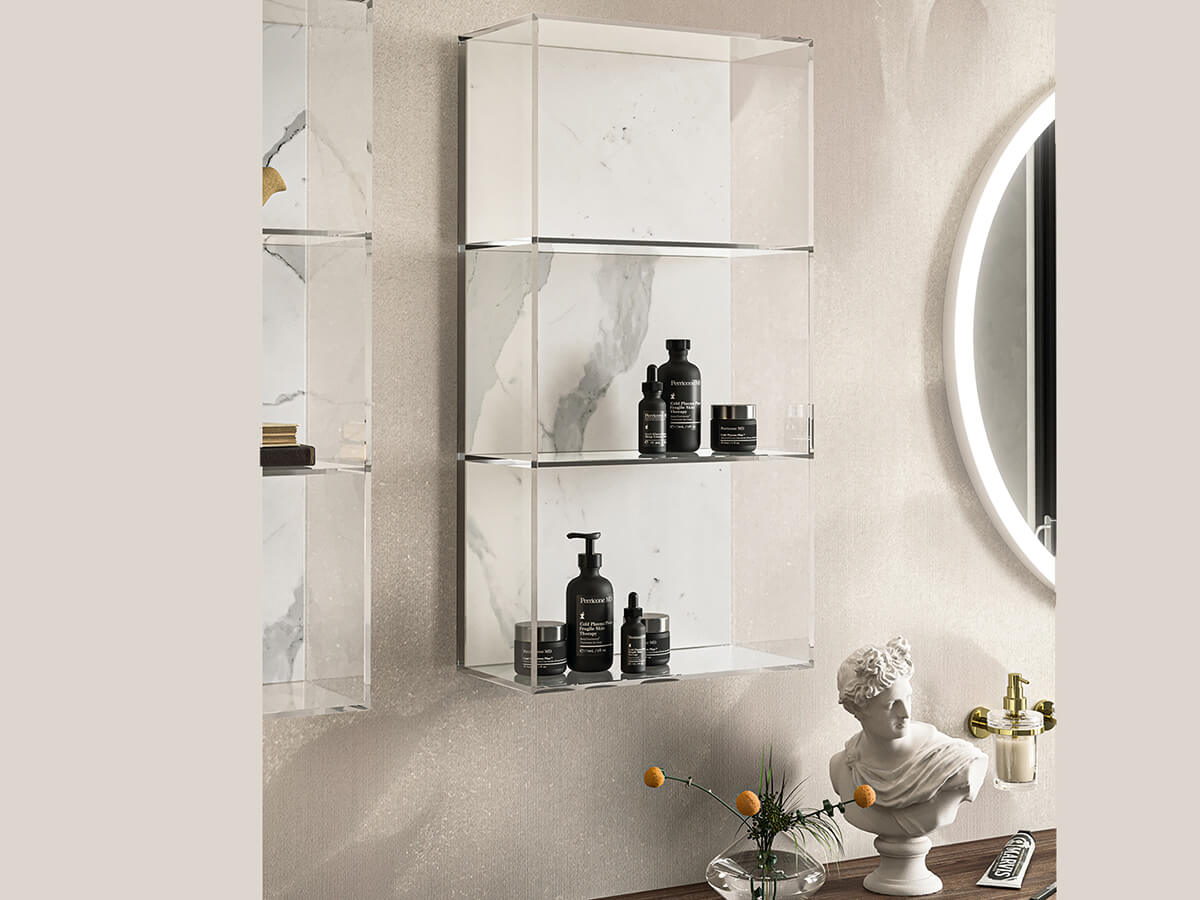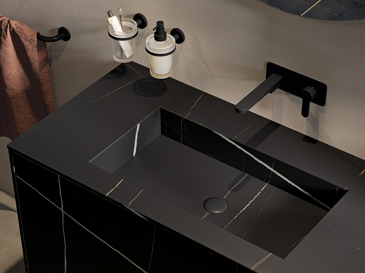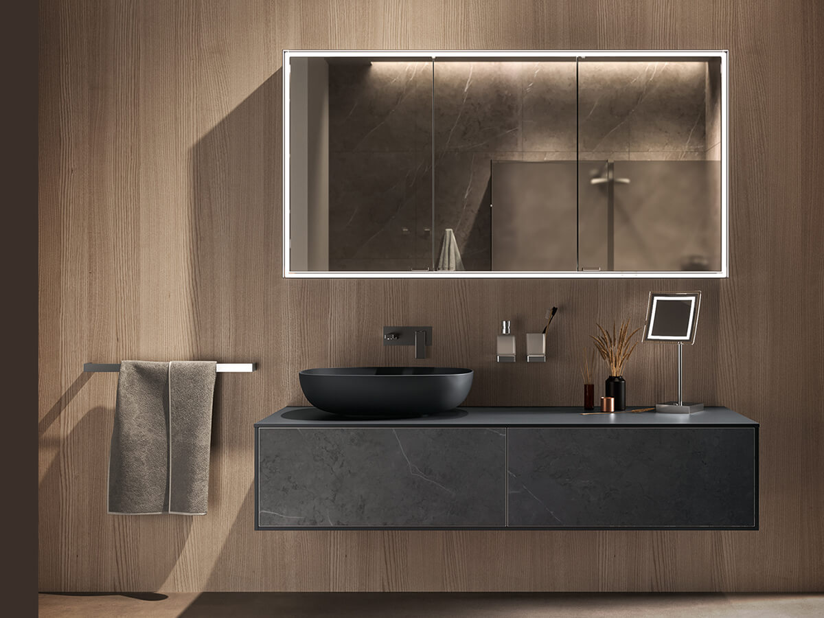 Minamale e versatile, il bagno Corretto di Inda presenta grosse e capienti cassettiere incastonate in maniera elegante ai quattro lati dalla struttura di sostegno composta da piano, fianchi e base. Le scelte del progettista possono dotarla di effetti radicalmente differenti: optando per una scelta di finiture a contrasto le cassettiere risultano come incorniciate dalla struttura, con un effetto pregevolmente decorativo, mentre se vengono accomunate dalla stessa finitura si ottengono composizioni più solide e monolitiche, di scenografica maestosità. Un uso sapiente di materiali quali laccati lucido o opachi, laminato HPL, gres opaco o legni decorativi consente di ottenere con Corretto la composizione giusta per ogni progetto. La collezione è compatibile con una grande varietà di lavabi, sia soprapiano che integrati nel top.