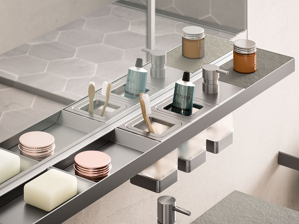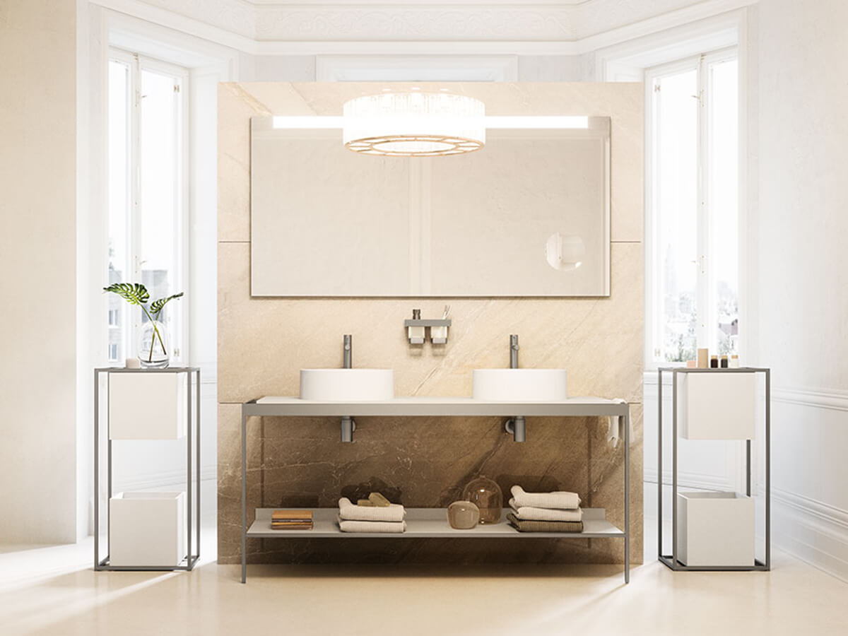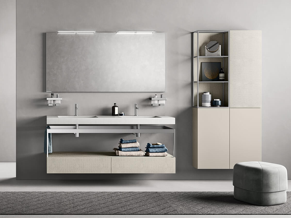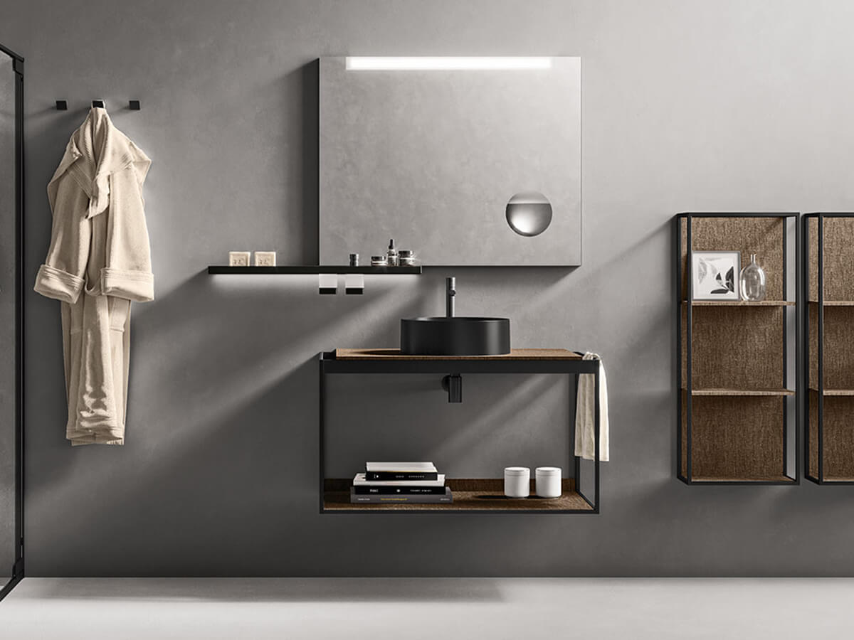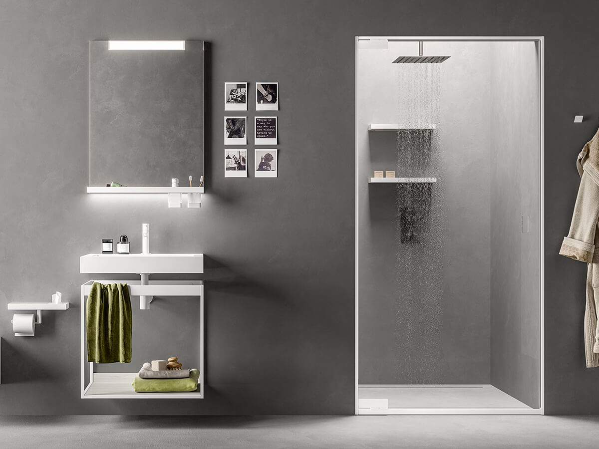 La serie Indissima di Inda può essere considerata un vero e proprio “bagno d’autore”. Firmata dal celebre architetto e designer Matteo Thun in collaborazione con Antonio Rodriguez, si presenta come un mobile bagno destrutturato, ridotto ai suoi componenti essenziali. In contrasto con la tradizionale pesantezza monolitica dei classici contenitori per il bagno, Indissima è invece un mobile leggero e arioso, in cui le geometrie rigide si esaltano in uno scheletro metallico che funge da sostegno, poggiato a terra o agganciato a parete, e che può ospitare piccole cassettiere o semplici ripiani. Il lavabo può essere con appoggio soprapiano oppure può venire integrato a filo in un piano leggermente rialzato, nel quale anche elementi tecnici come il sifone risultano enfatizzati acquisendo dignità di particolar scenografici.