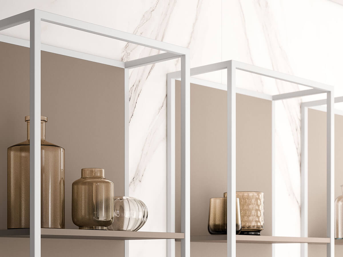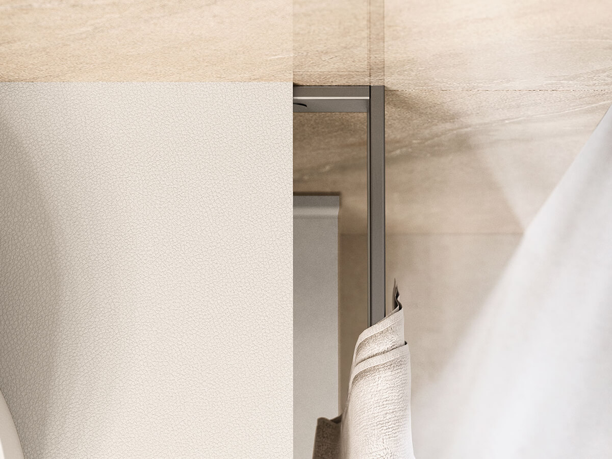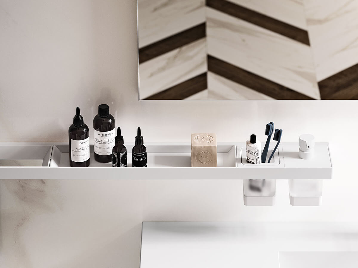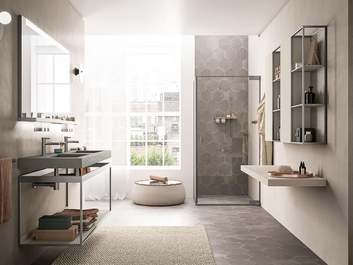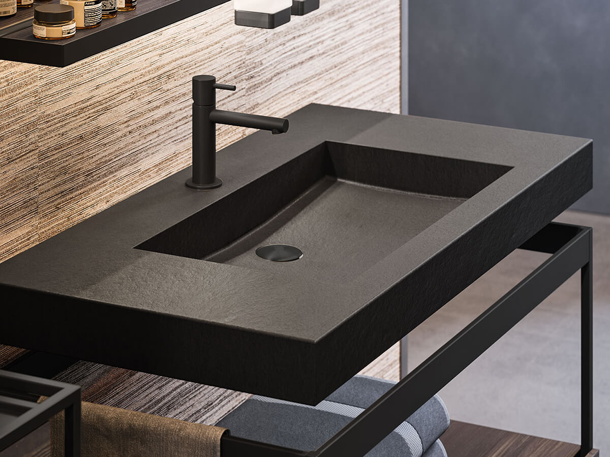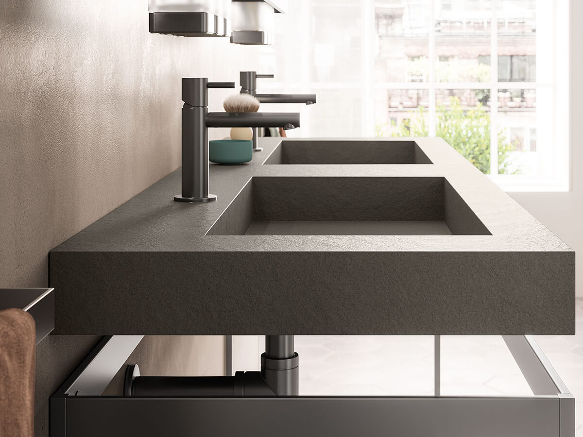 La serie Indissima di Inda può essere considerata un vero e proprio “bagno d’autore”. Firmata dal celebre architetto e designer Matteo Thun in collaborazione con Antonio Rodriguez, si presenta come un mobile bagno destrutturato, ridotto ai suoi componenti essenziali. In contrasto con la tradizionale pesantezza monolitica dei classici contenitori per il bagno, Indissima è invece un mobile leggero e arioso, in cui le geometrie rigide si esaltano in uno scheletro metallico che funge da sostegno, poggiato a terra o agganciato a parete, e che può ospitare piccole cassettiere o semplici ripiani. Il lavabo può essere con appoggio soprapiano oppure può venire integrato a filo in un piano leggermente rialzato, nel quale anche elementi tecnici come il sifone risultano enfatizzati acquisendo dignità di particolar scenografici.