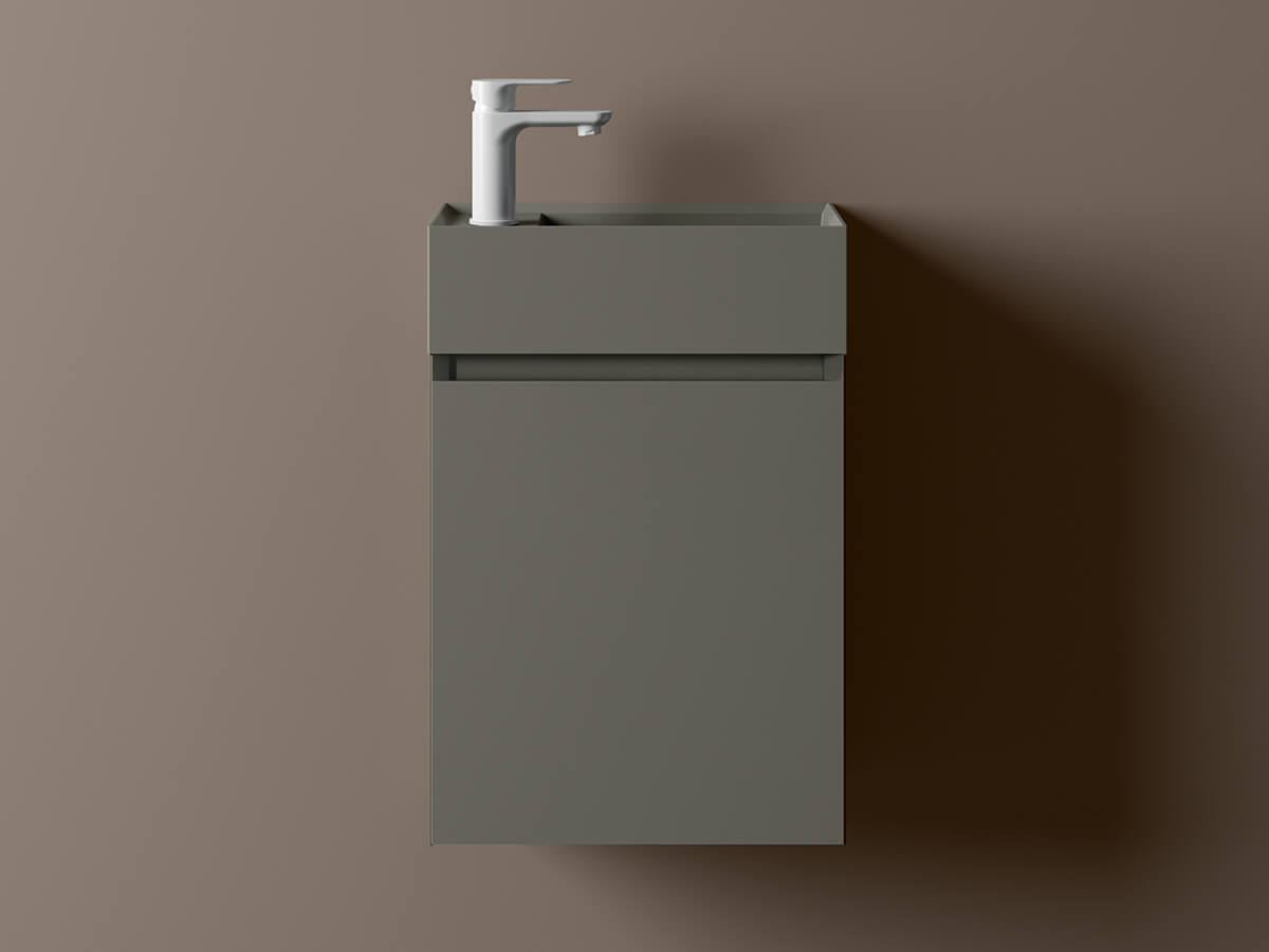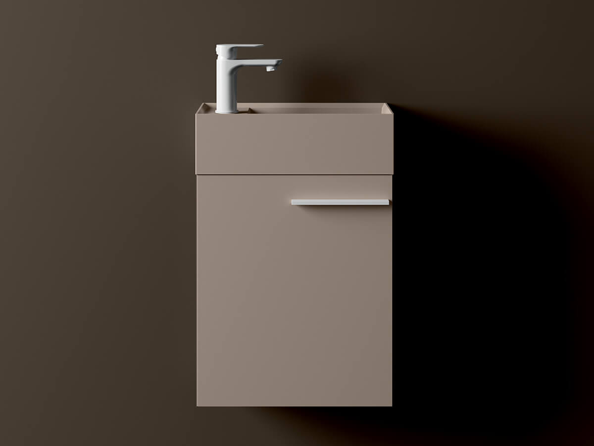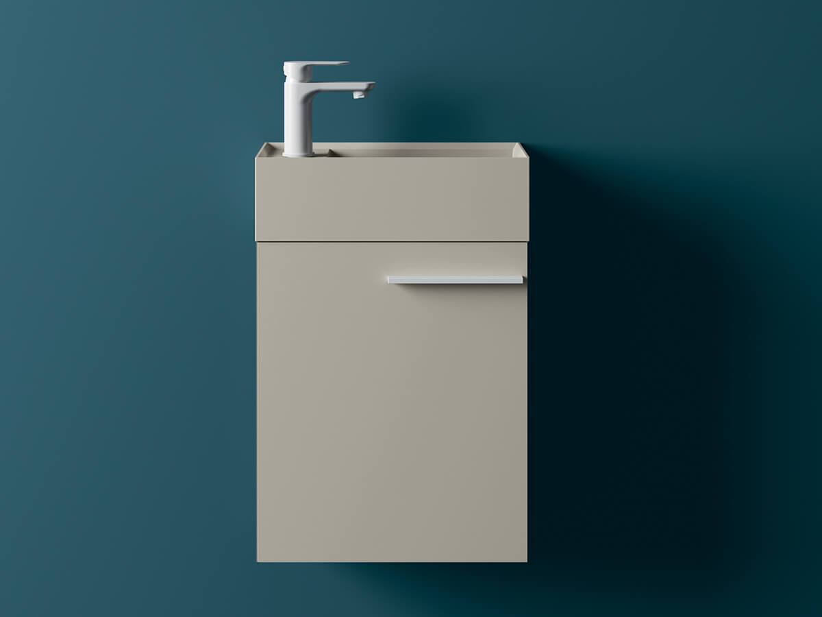 Lilliput 45 è un lavamani monoblocco sospeso comodo e pratico, capace di coniugare la tipica qualità delle collezioni Inda con un’estetica smart che gli permette di tornare molto utile in diverse situazioni progettuali. La sua forma è fissa: nella parte inferiore porta un capiente contenitore rettangolare (con anta apribile con maniglia oppure tramite una gola a seconda della configurazione scelta), mentre nella parte superiore trova posto il lavabo integrato. La finitura è laccata opaca oppure lucida, con una selezione fra oltre 30 colori, e permette una scelta fra eleganti composizioni monocromatiche o il contrasto di un lavabo in Mineralguss bianco lucido.