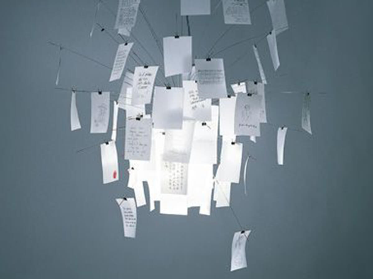 Si tratta di una delle lampade più conosciute di Ingo Maurer, una vera e propria opera che invita l’utente a usare la propria creatività dando vita a composizione attive, interagenti. Questa lampada a sospensione presenta un unico corpo centrale fatto di acciaio inossidabile, cui si aggiungono una serie di foglietti in carta giapponese, alcuni prestampati e altri dove l’azienda invita l’utente stesso a dare sfogo alla propria fantasia. I fogli possono essere disposti a piacere, usati per schizzi o per messaggi personali. Tutto è lecito. L’effetto che ne deriva è estremamente informale e suggestivo, ideale per chi desideri creare atmosfere giovani e conviviali, liberamente interpretabili.