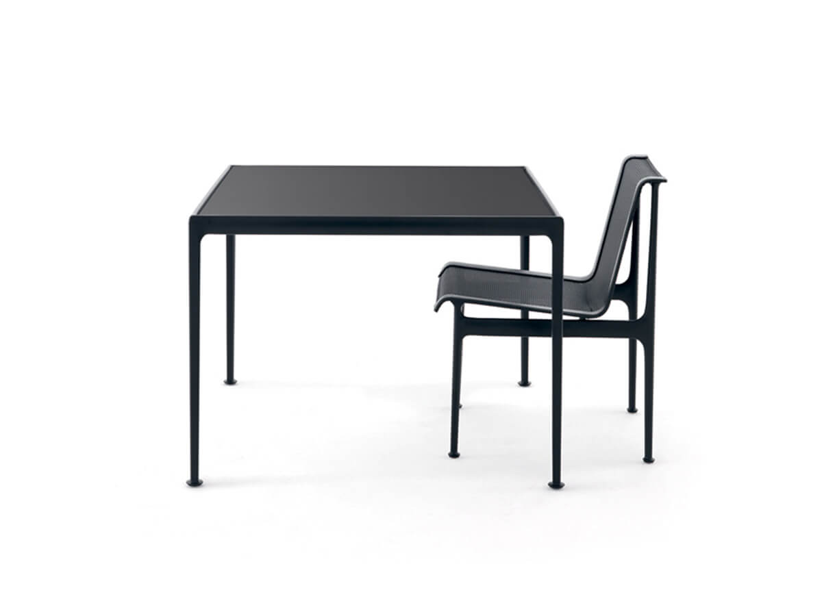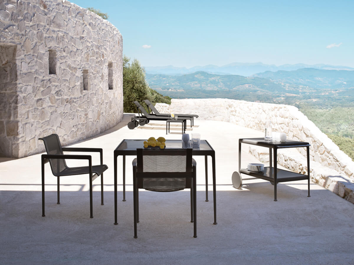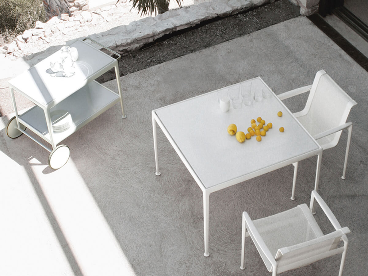 Dalla mano di Richard Schultz Knoll ha ereditato un vasto assortimento di mobili per l’esterno, progettati e realizzati con la fermezza di un design solido, semplice e funzionale. L’autore disegna ogni pezzo della collezione su richiesta di Florence Knoll, con la specifica richiesta che ogni elemento fosse in grado di resistere alle intemperie e agli agenti atmosferici, in particolare l’aria salmastra della Florida. Il risultato fu una incredibile varietà di tavoli, tavolini, sedie e poltrone che ancora oggi si distinguono per gusto estetico. Questo modello rettangolare, fatto in alluminio e poliestere non teme tanto i climi rigidi quanto quelli più caldi, risultando ottimale in ogni condizione.