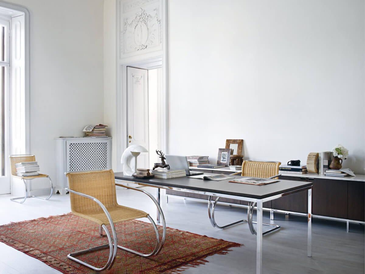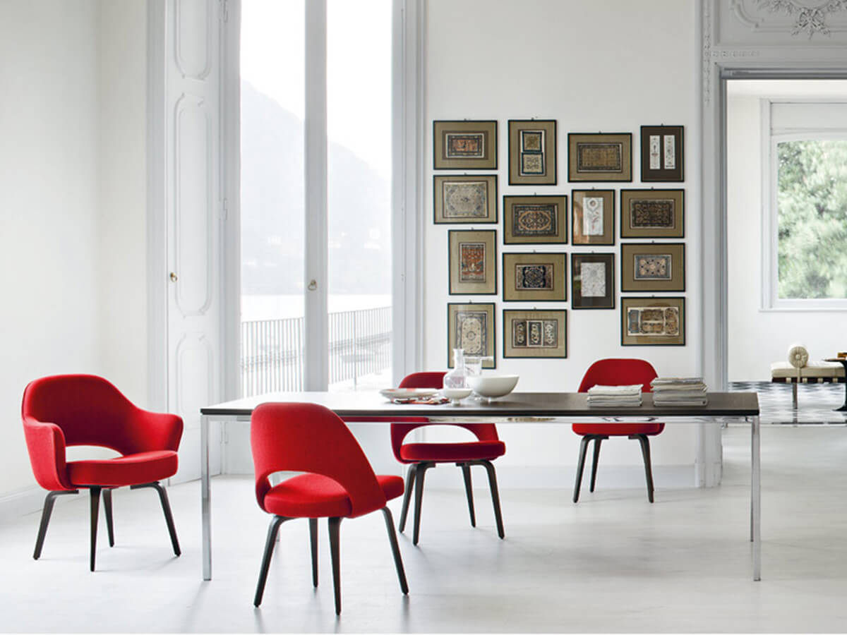 Autrice di numerosi pezzi dell’azienda Knoll, Florence Knoll vede nel proprio fornitissimo catalogo di opere anche una serie di tavoli per la zona pranzo, declinati poi in tavoli da soggiorno e tavoli da ufficio. Fra queste mirabili opere spicca per eleganza e suprema ricerca minimalista il tavolo Florence Knoll a struttura cromata lucida con quattro razze. Le numerose finiture per il top ampliano al massimo le possibilità di personalizzazione, rendendo questo elemento d’arredo la soluzione perfetta per chi ami circondarsi di opere rigorose e fortemente caratterizzate. Fra i molti modelli disponibili, Florence Knoll contemplò dei top sia rotondi che ovali, perfetti per ogni gusto.