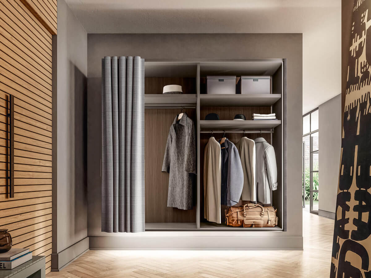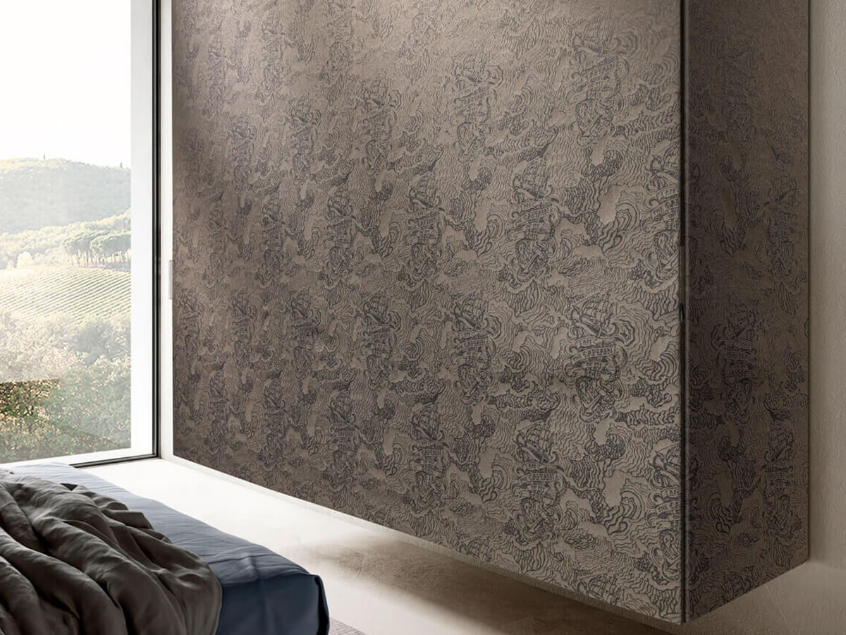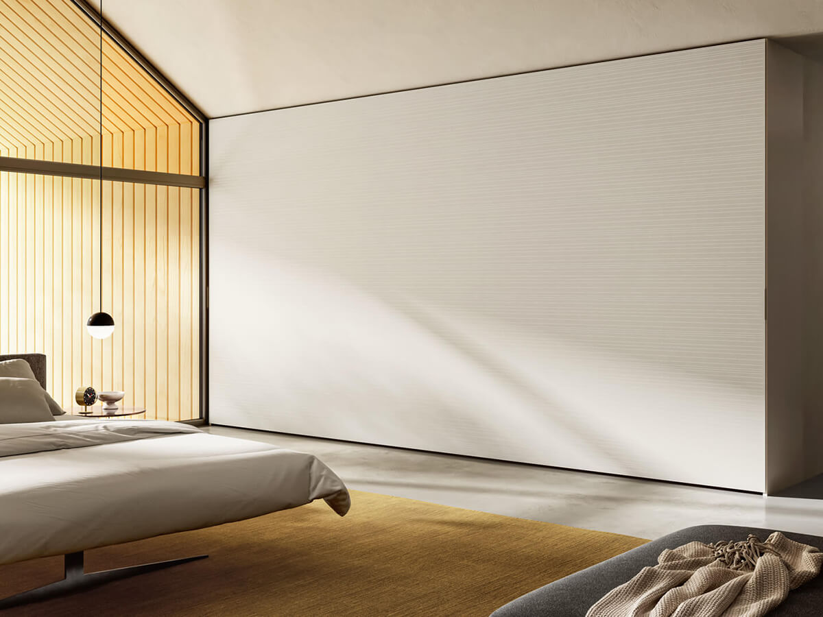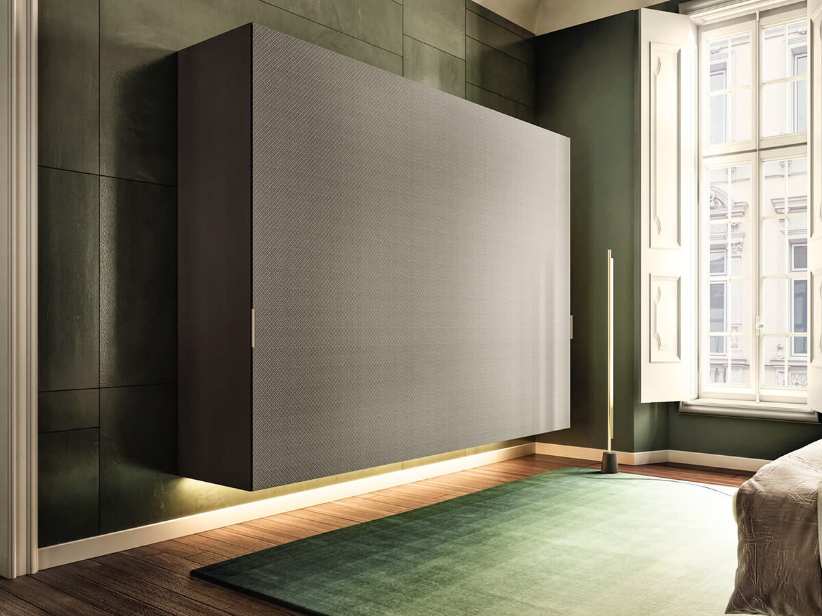 L’armadio Et Voilà di Lago è protagonista di una tecnologia sorprendente e innovativa. Al posto delle ante presenta infatti un grande tessuto teso, delicato a raffinato al tatto, apribile a scorrimento con un semplice gesto come piccolo trucco di magia grazie all’ingegnoso sistema di chiusura magnetica, silenziosa e autoregolabile. La grande cura per i dettagli tecnologici si estende anche alla trama del tessuto, appositamente studiata per bloccare il passaggio della polvere e risultare fonoassorbente. Et Voilà si mimetizza così completamente nell’ambiente circostante, assumendo da chiuso l’aspetto di una parete tessile decorativa ed eliminando totalmente la percezione del suo ingombro.