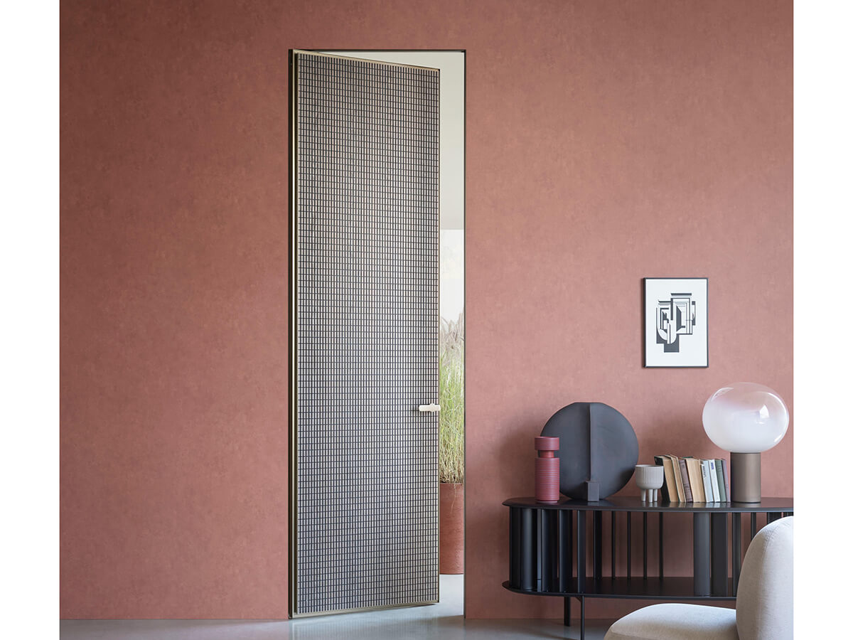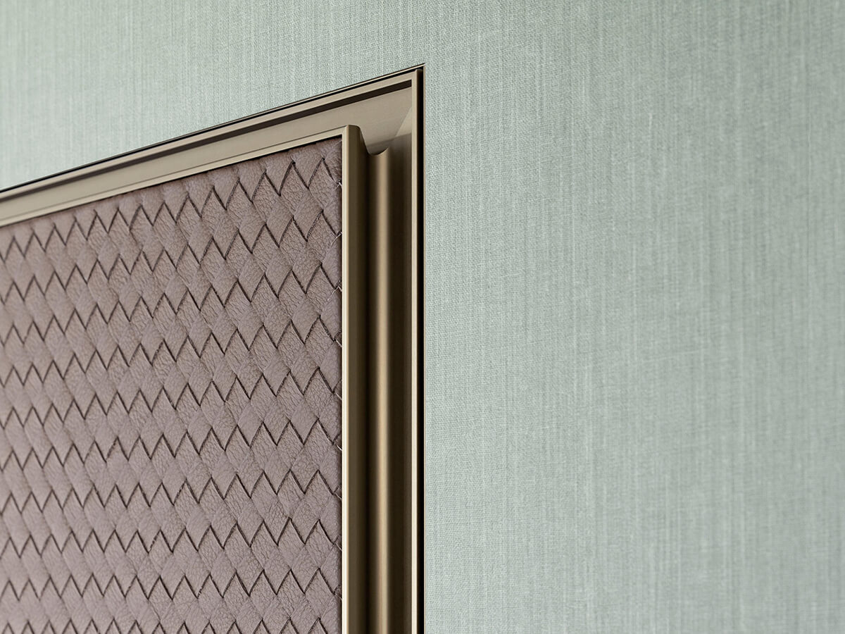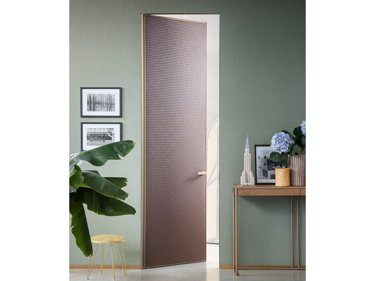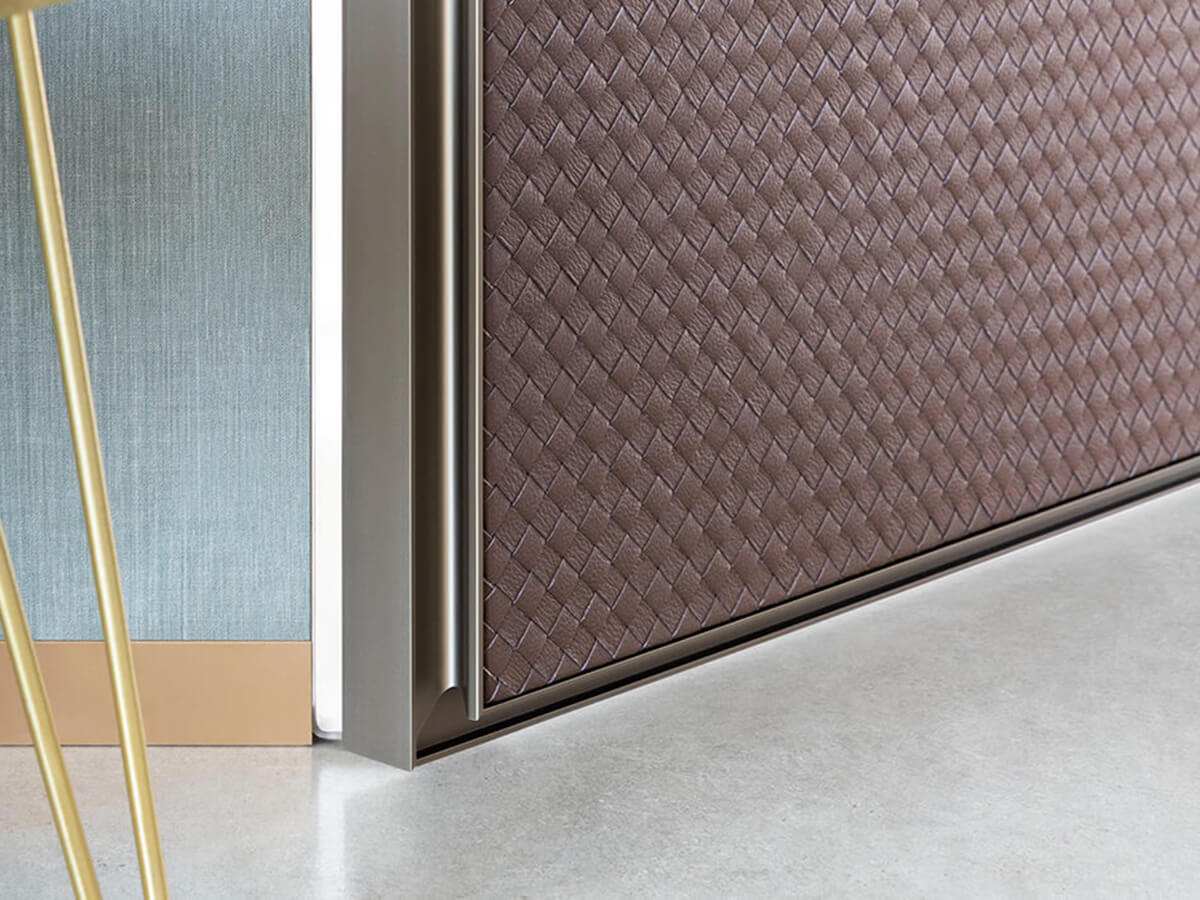 Il modello Altaj di Lualdi è una porta filo muro decisamente inusuale: solitamente le porte battenti appartenenti a questa tipologia si presentano con un look decisamente minimalista che punta a una completa mimesi all’interno della parete, mentre Altaj sceglie l’opposta strada di un decorativismo estremo. Altaj si basa infatti su un’anta leggerissima che può essere ricoperta di materiali pregiati, dal cuoio intrecciato al legno riccamente decorato nella texture Chocolat, mentre il telaio metallico dal segno sottile ma deciso la isola in maniera netta dalla parete circostante. L’apertura è a pivot e l’anima dell’anta è realizzata in tamburato.