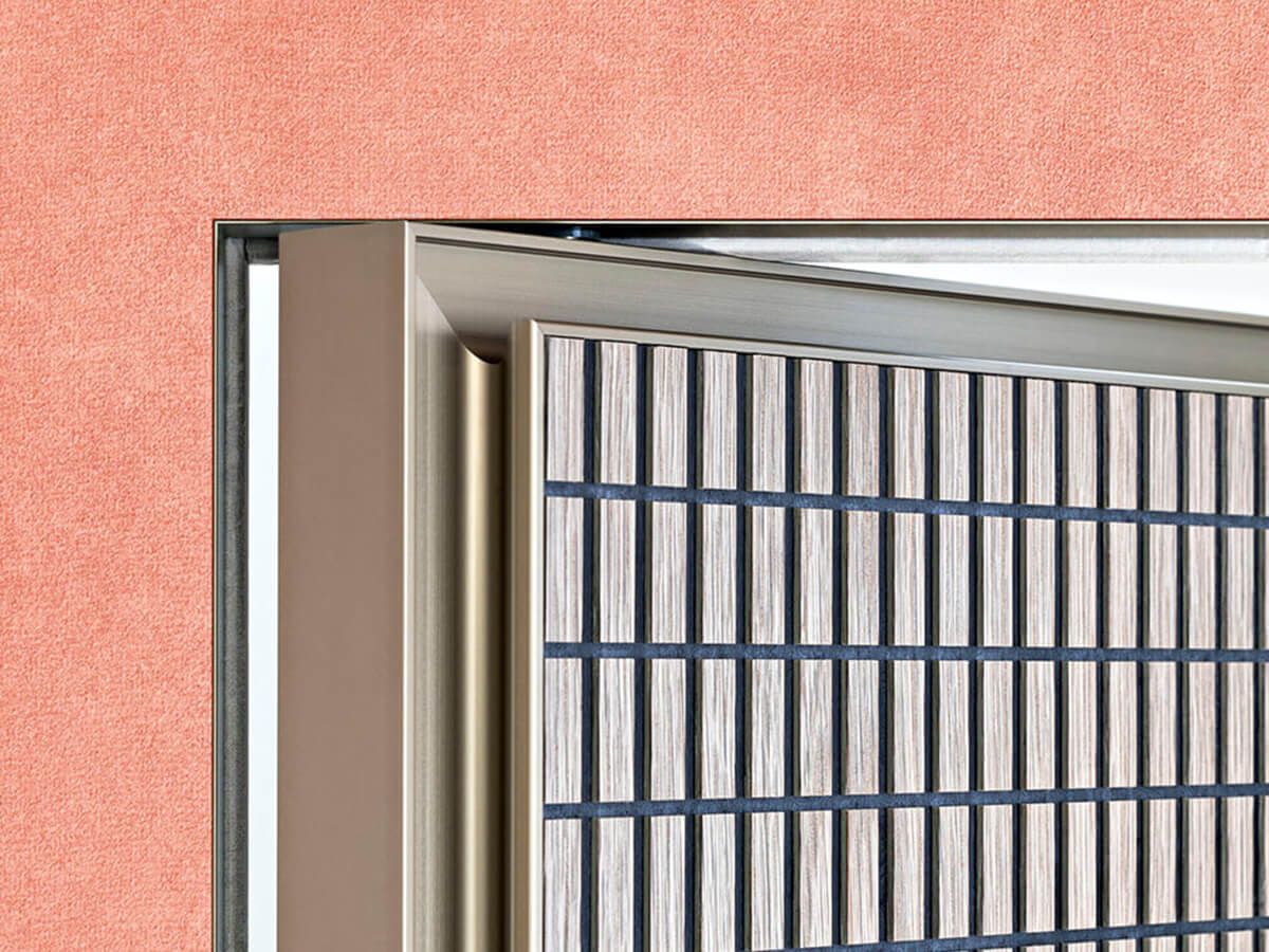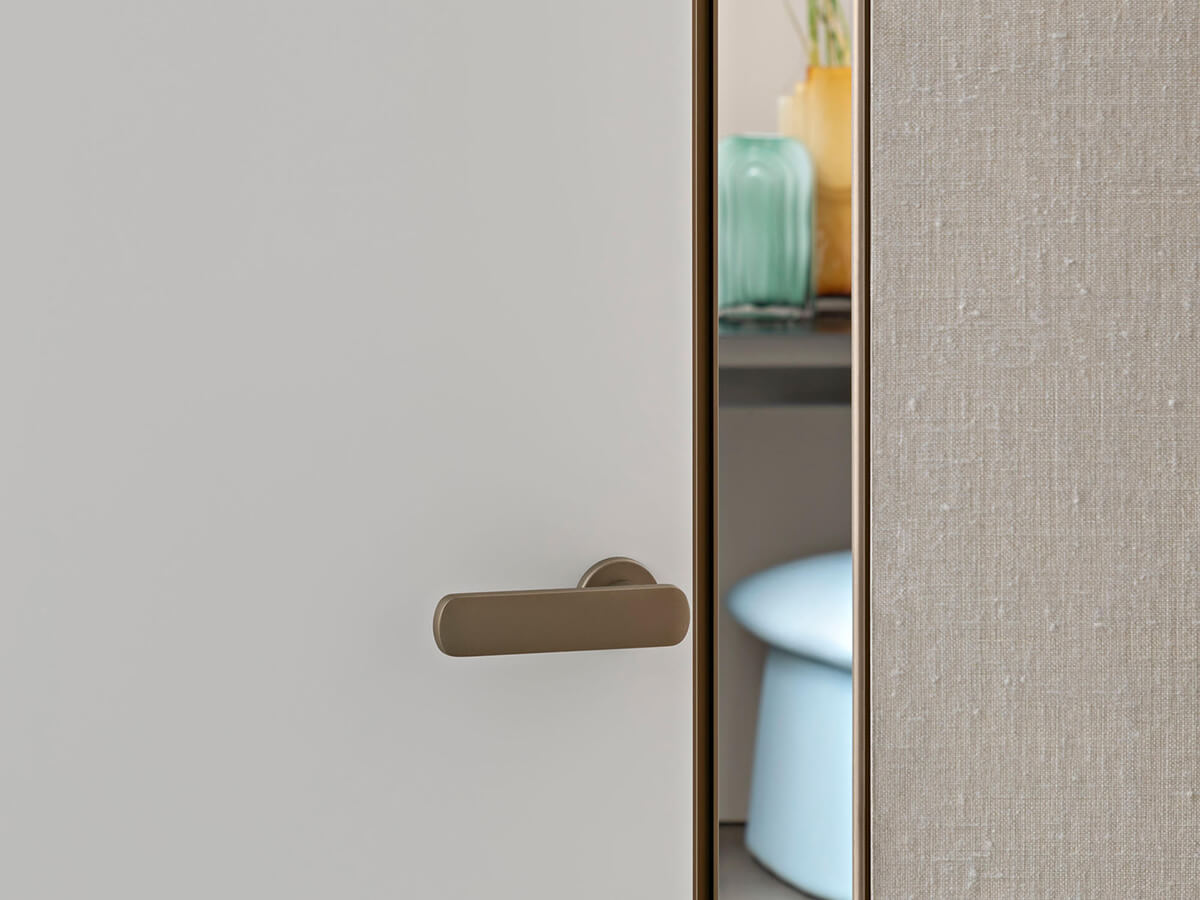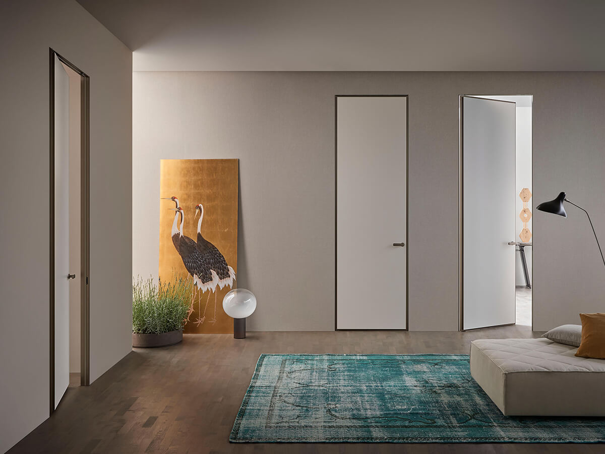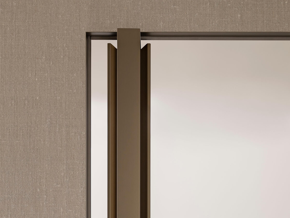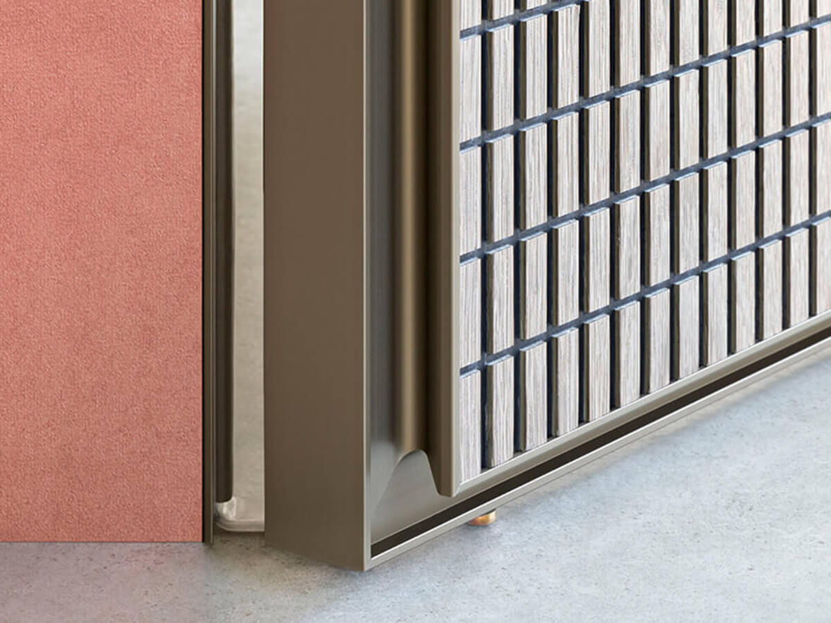 Il modello Altaj di Lualdi è una porta filo muro decisamente inusuale: solitamente le porte battenti appartenenti a questa tipologia si presentano con un look decisamente minimalista che punta a una completa mimesi all’interno della parete, mentre Altaj sceglie l’opposta strada di un decorativismo estremo. Altaj si basa infatti su un’anta leggerissima che può essere ricoperta di materiali pregiati, dal cuoio intrecciato al legno riccamente decorato nella texture Chocolat, mentre il telaio metallico dal segno sottile ma deciso la isola in maniera netta dalla parete circostante. L’apertura è a pivot e l’anima dell’anta è realizzata in tamburato.