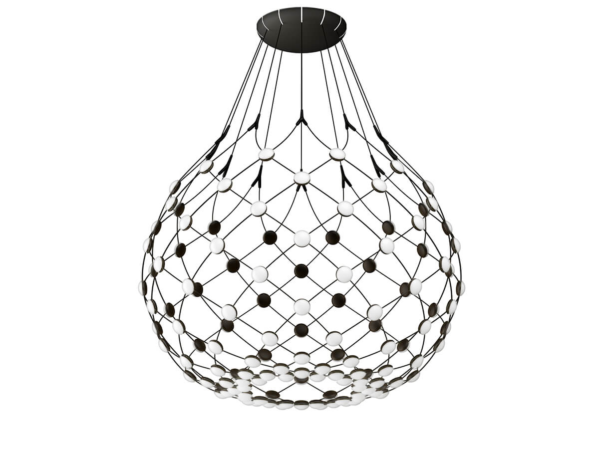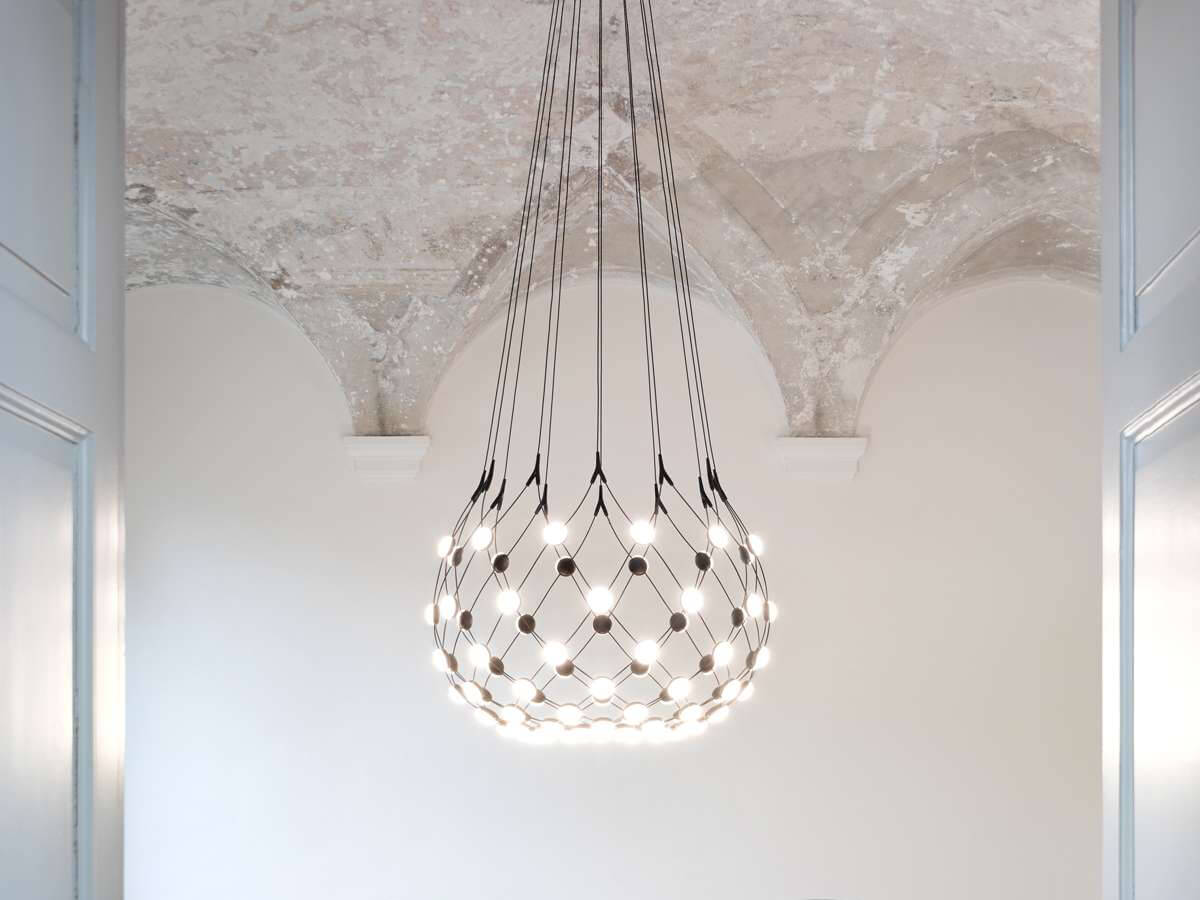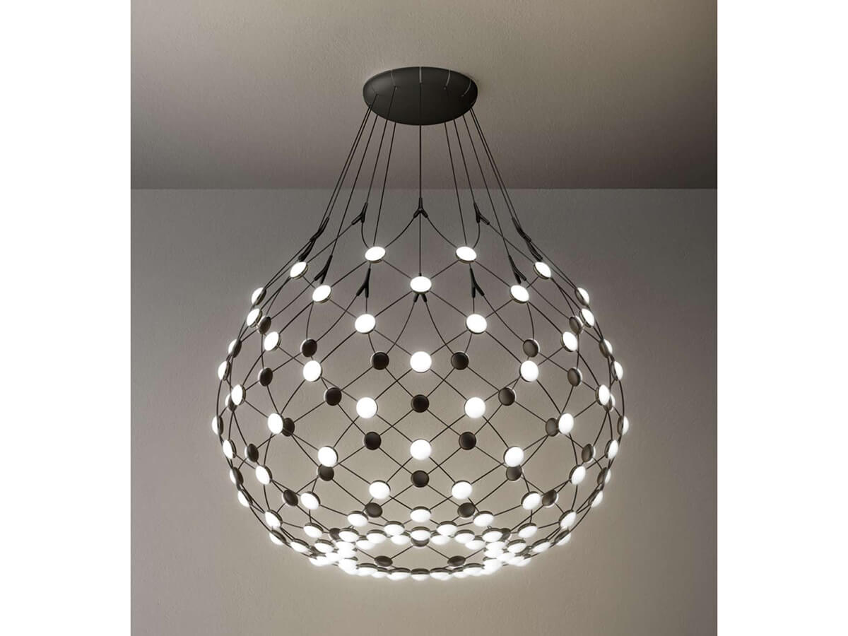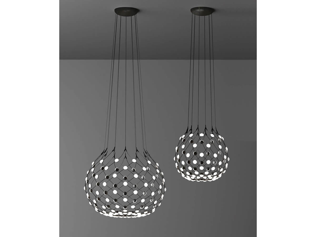 Una lampada dal forte impatto visivo ed estetico, capace grazie alla propria fisionomia di adattarsi a diversi contesti della casa risultando sempre appropriata. La tradizionale forma a rete di Mesh sembra strizzare l’occhio alle reti da pesca a strascico, alleggerite grazie alla scelta di materie leggere, quasi trasparenti, composte da intrecci di cavi flessibili all’incrocio dei quali vengono posizionate le sorgenti LED. Apparentemente semplice, Mesh è in realtà particolarmente complessa per via della accurata scelta compiuta sulla diffusione della luce, indispensabile per garantire un prodotto soddisfacente. La struttura permette un’eccezionale libertà nella gestione della luminanza: è infatti possibile regolarne l’intensità e scegliere quali settori della lampada illuminare.