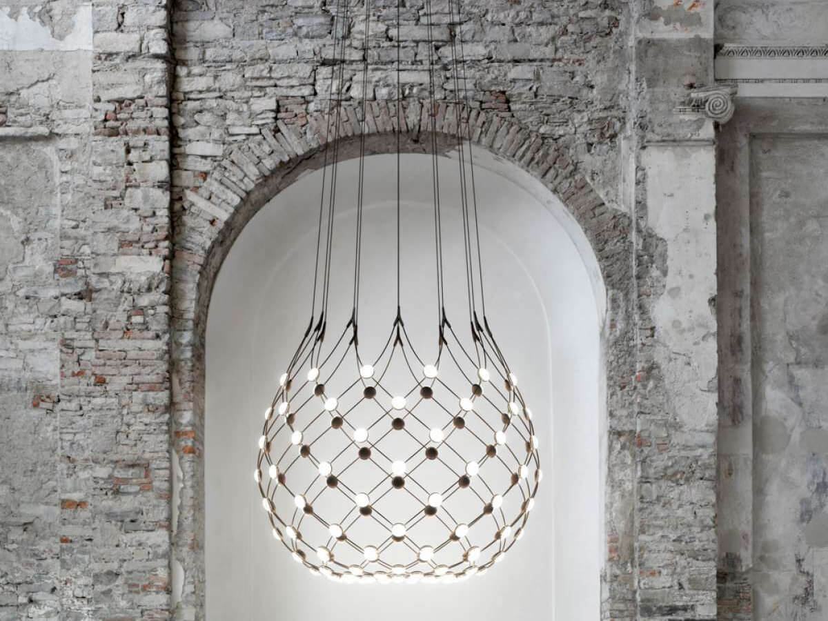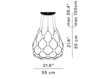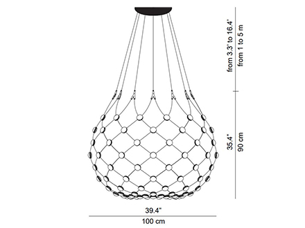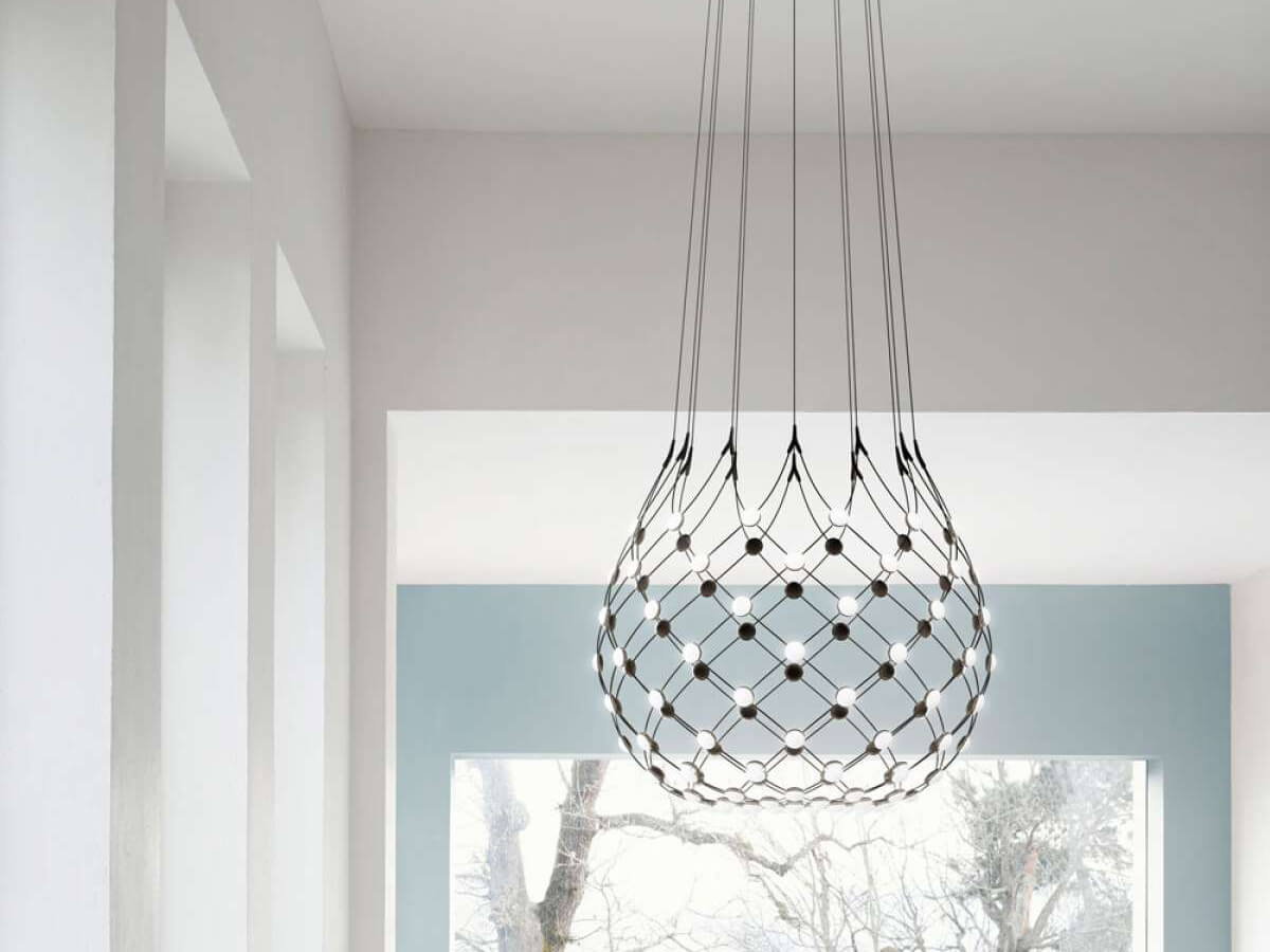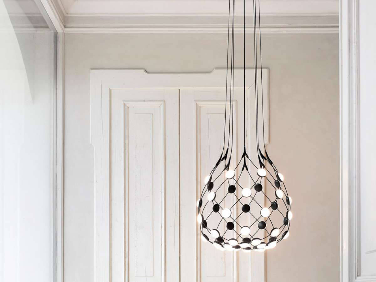 Una lampada dal forte impatto visivo ed estetico, capace grazie alla propria fisionomia di adattarsi a diversi contesti della casa risultando sempre appropriata. La tradizionale forma a rete di Mesh sembra strizzare l’occhio alle reti da pesca a strascico, alleggerite grazie alla scelta di materie leggere, quasi trasparenti, composte da intrecci di cavi flessibili all’incrocio dei quali vengono posizionate le sorgenti LED. Apparentemente semplice, Mesh è in realtà particolarmente complessa per via della accurata scelta compiuta sulla diffusione della luce, indispensabile per garantire un prodotto soddisfacente. La struttura permette un’eccezionale libertà nella gestione della luminanza: è infatti possibile regolarne l’intensità e scegliere quali settori della lampada illuminare.