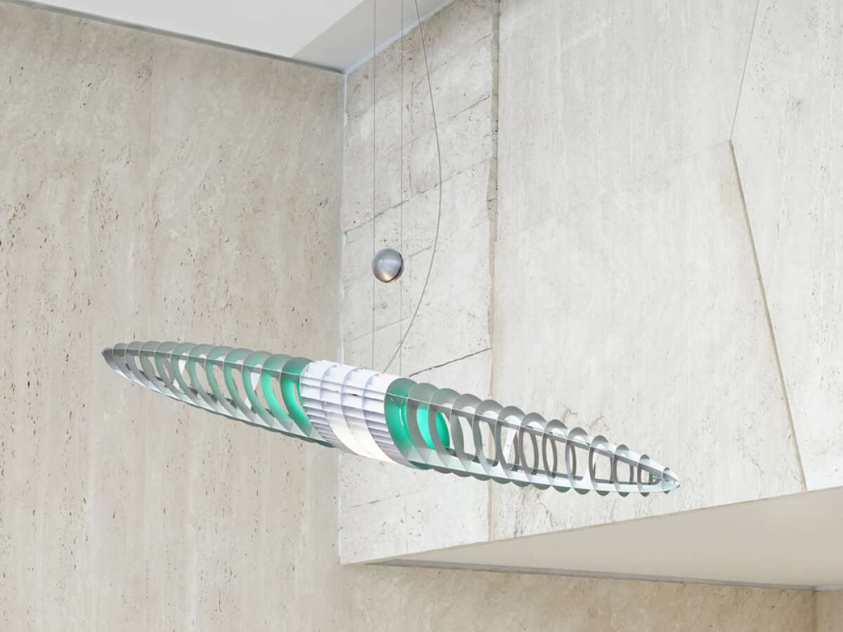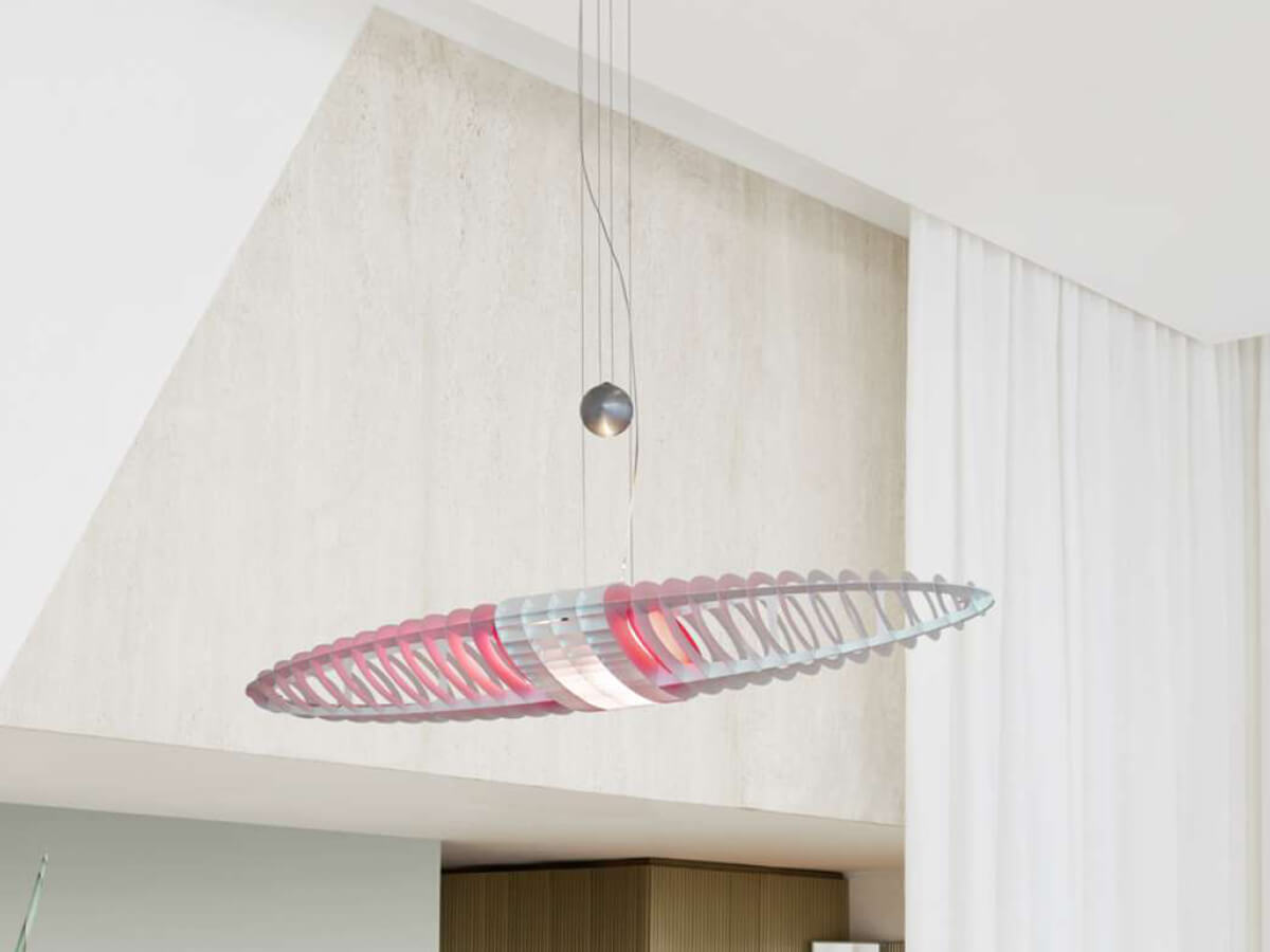 Luceplan è in grado di dare vita a modelli di arredo luminoso unici, dove forte si percepisce la cura verso l’eleganza, la bellezza e l’innovazione. Ogni elemento delle sue collezioni contribuisce a creare sensazioni nuove, uniche, con forti rimandi all’immaginazione simbolica e surreale. Titania si colora grazie a una coppia di filtri in policarbonato che non interferisce con l’emissione di luce bianca. L’ordine delle centine in alluminio riflette la luce e nasconde la lampadina in un volume trasparente e sorprendente. Il contrappeso sferico permette la regolazione dell’altezza, così da poter creare composizioni uniche e inimitabili.