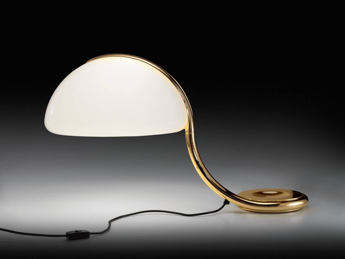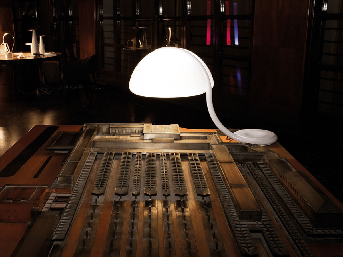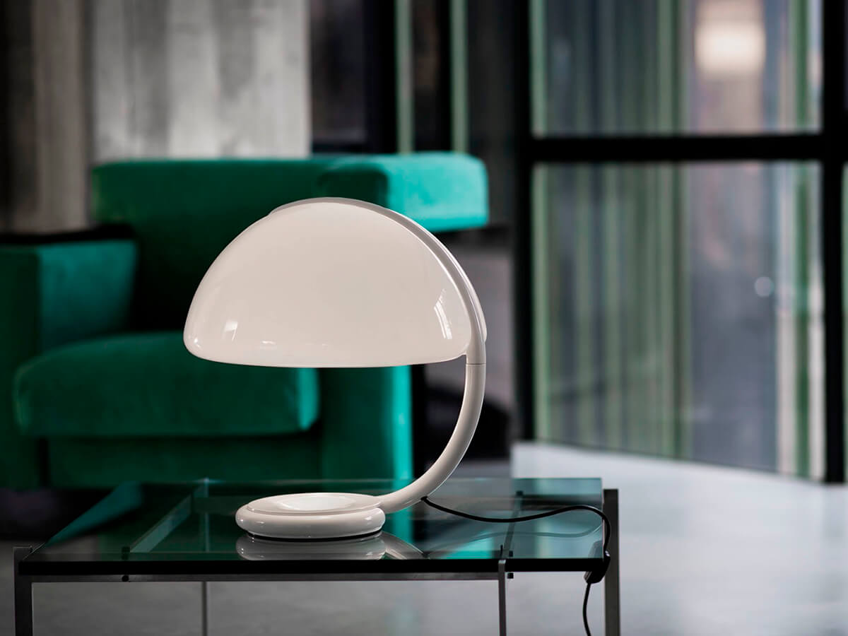 Martinelli Luce nasce come azienda che ha saputo fare del design luminoso il proprio cavallo di battaglia, dando vita a oggetti che nel tempo hanno saputo riscuotere successo e stima internazionale, divenendo delle vere e proprie icone del design contemporaneo. La lampada Serpente creata da Elio Martinelli nel 1968 fa parte di questi oggetti cult, celebre per la sua forma inusuale e fortemente antropomorfa che attrae e affascina fin dalla sua creazione. Ideale se collocata su un tavolo o una scrivania, è orientabile grazie al braccio snodato. Il diffusore è in metacrilato bianco opale, unito alla struttura in metallo laccato bianco.