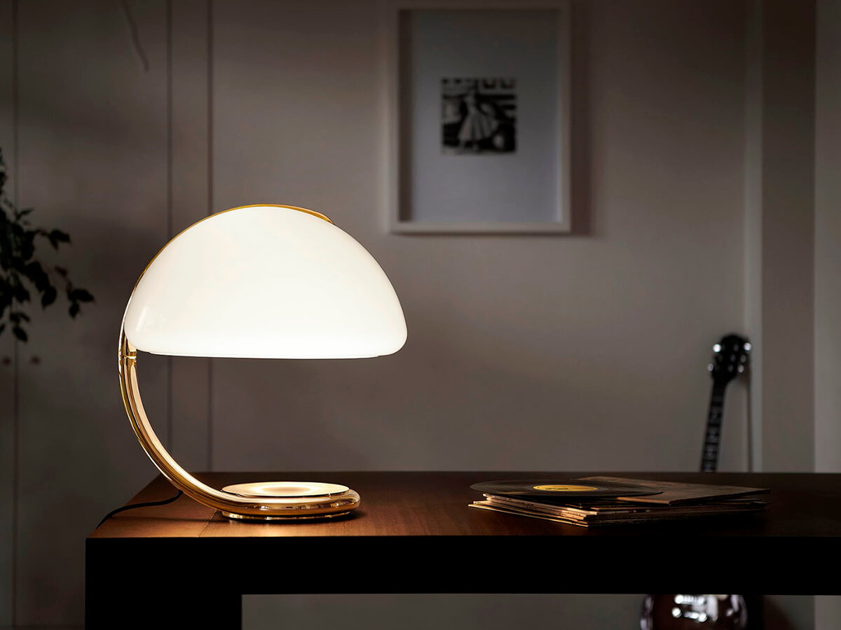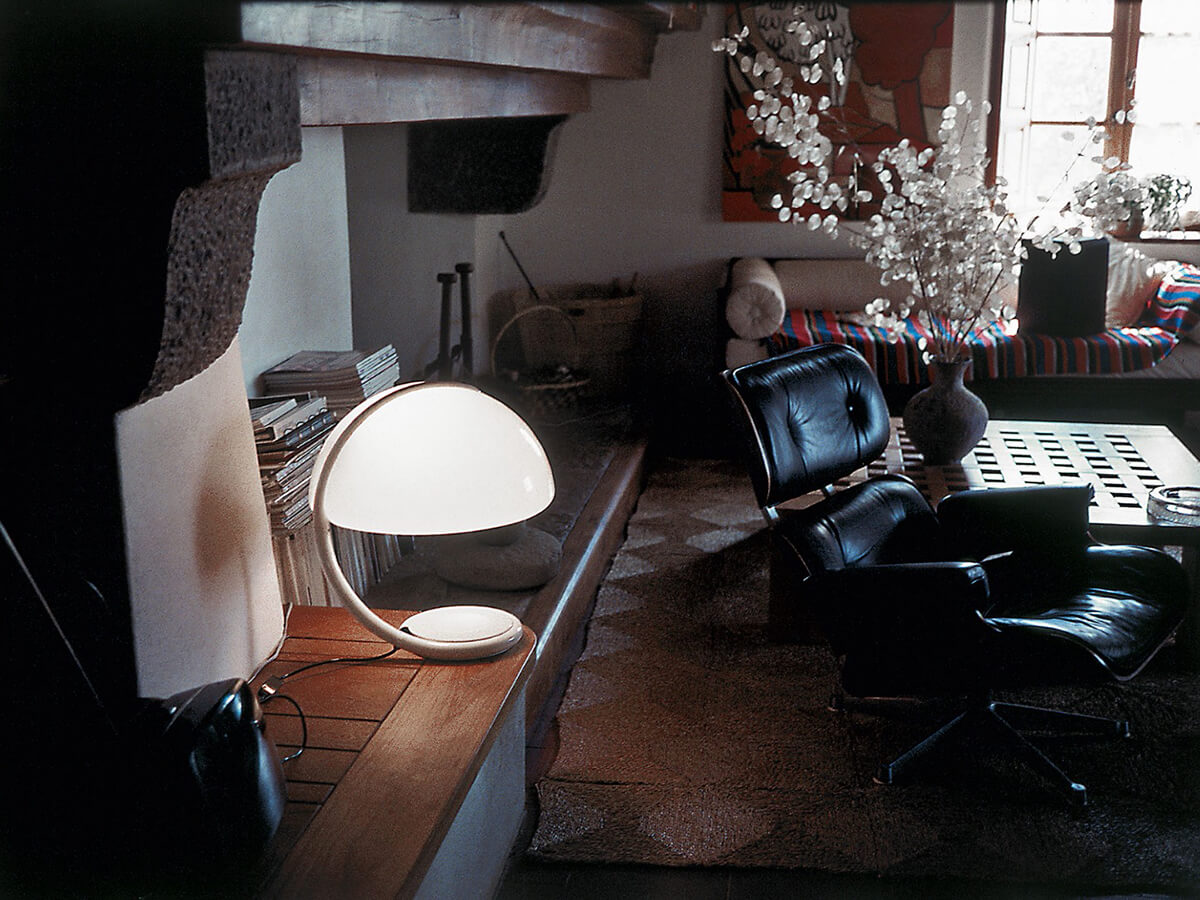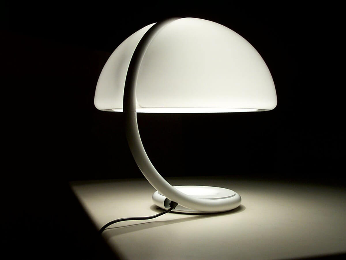 Martinelli Luce nasce come azienda che ha saputo fare del design luminoso il proprio cavallo di battaglia, dando vita a oggetti che nel tempo hanno saputo riscuotere successo e stima internazionale, divenendo delle vere e proprie icone del design contemporaneo. La lampada Serpente creata da Elio Martinelli nel 1968 fa parte di questi oggetti cult, celebre per la sua forma inusuale e fortemente antropomorfa che attrae e affascina fin dalla sua creazione. Ideale se collocata su un tavolo o una scrivania, è orientabile grazie al braccio snodato. Il diffusore è in metacrilato bianco opale, unito alla struttura in metallo laccato bianco.