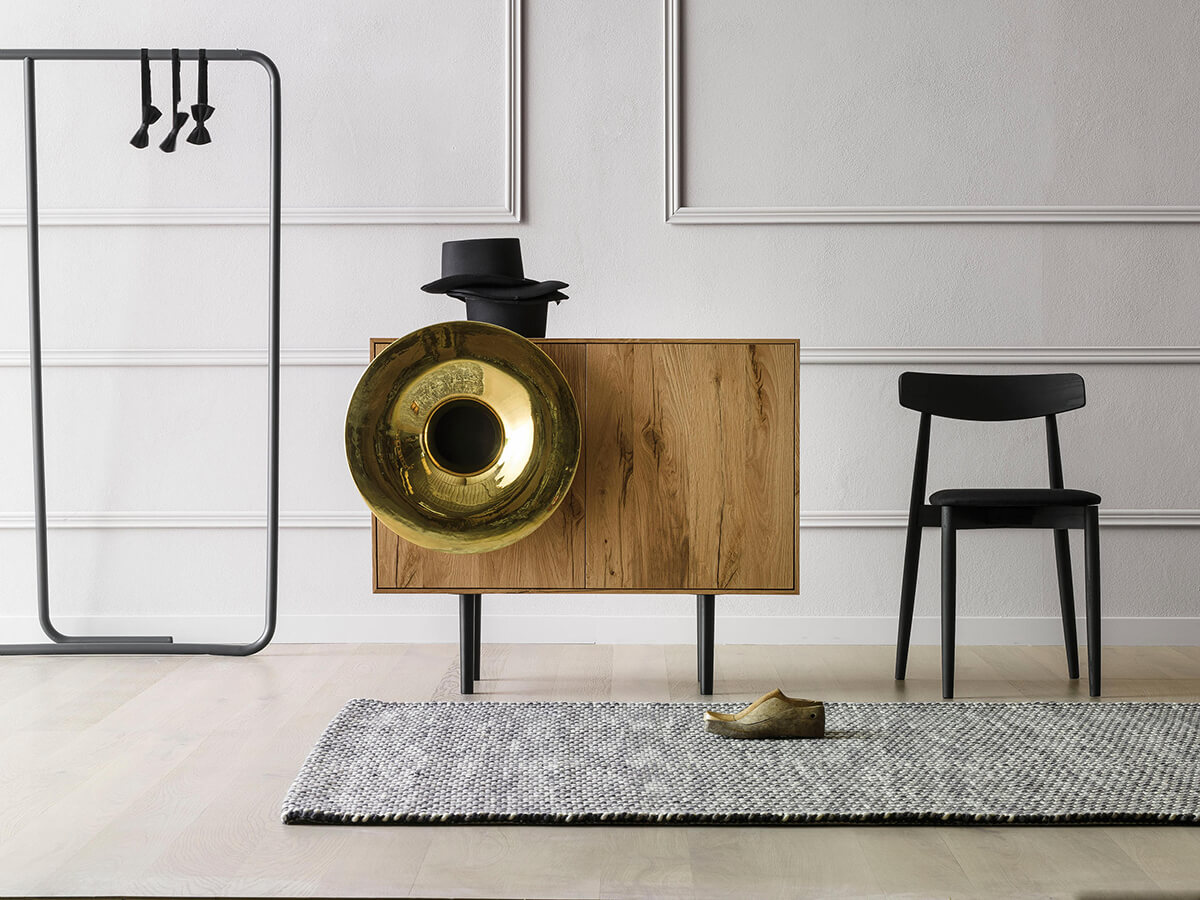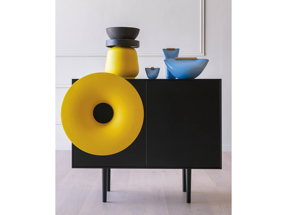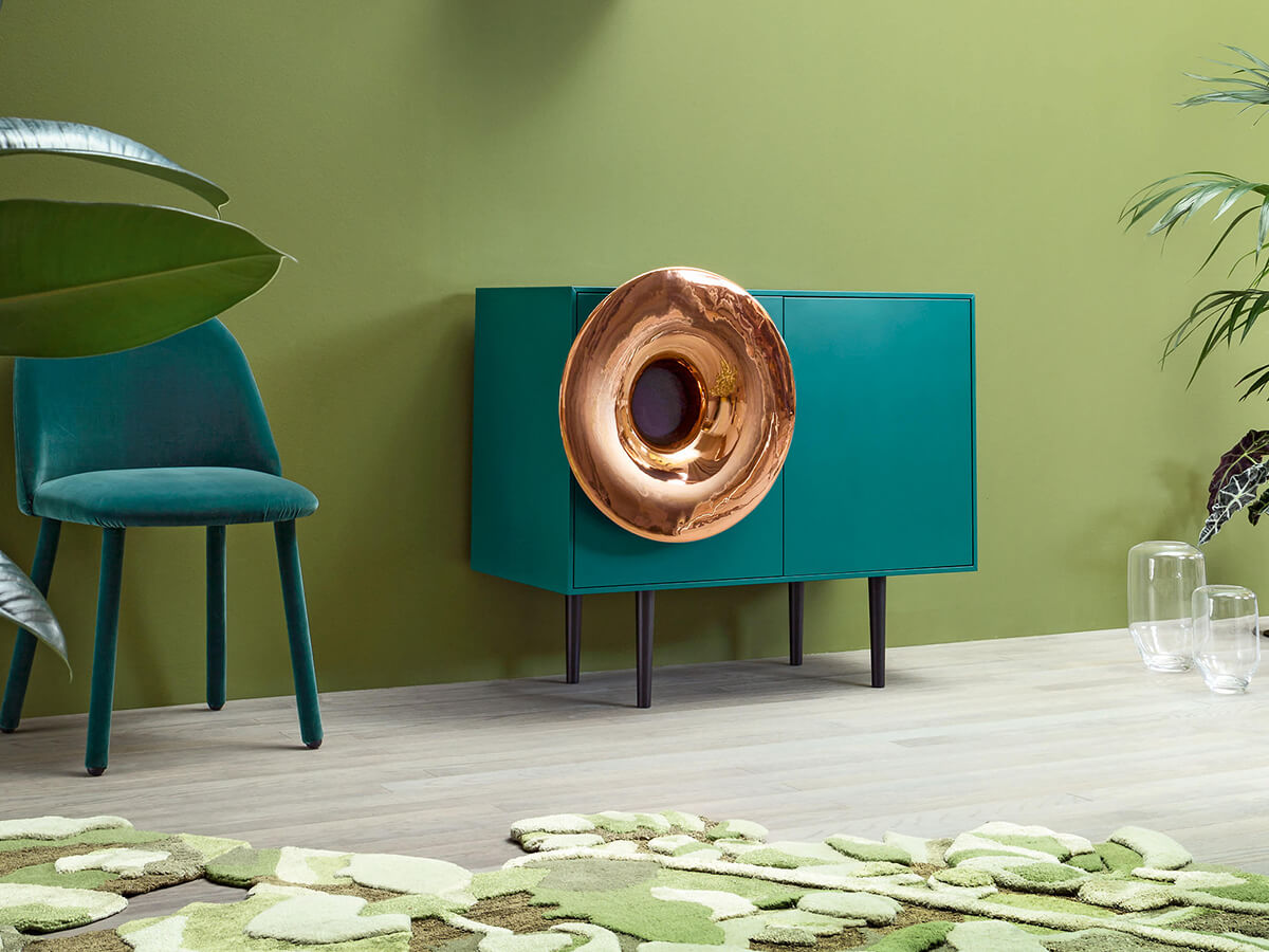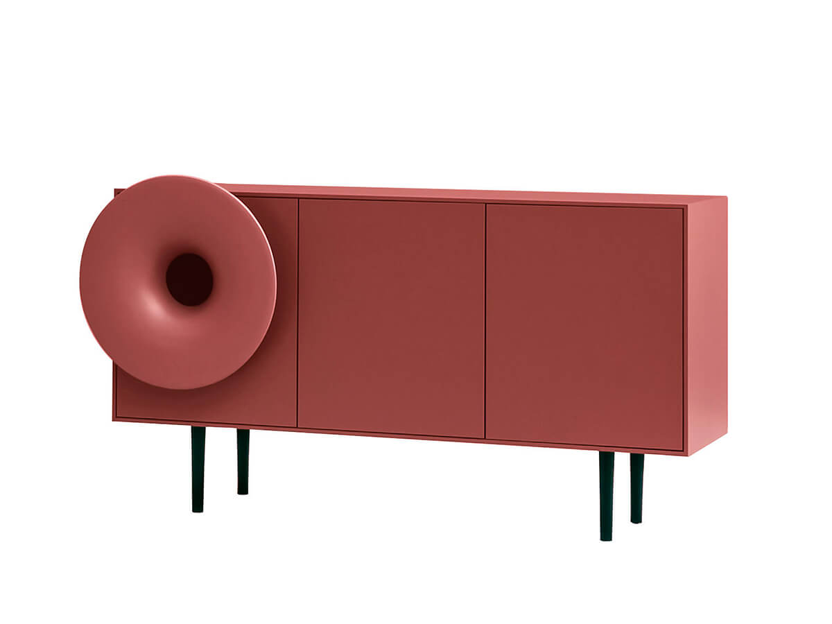 Un arredo trasversale, capace di esprimere una duplice identità conservando tuttavia una forte caratterizzazione intrinseca. Caruso è una madia che ben si presta allo spazio giorno e ambienti conviviali per i suoi toni giocosi e sgargianti che sembrano strizzare l’occhio al gusto anni ’80. Interessante è però la doppia anima conferitagli da Miniforms, in quanto oltre che contenitore, Caruso funge anche da riproduttore di musica in quanto al suo interno presenta un vero e proprio sistema Hi-Fi compreso di uno speaker che si può direttamente collegare con un’apposita applicazione del cellulare. Il risultato è che in qualunque momento si può scegliere di riprodurre musica all’interno degli ambienti, per una più gradevole gestione del tempo e della quotidianità.