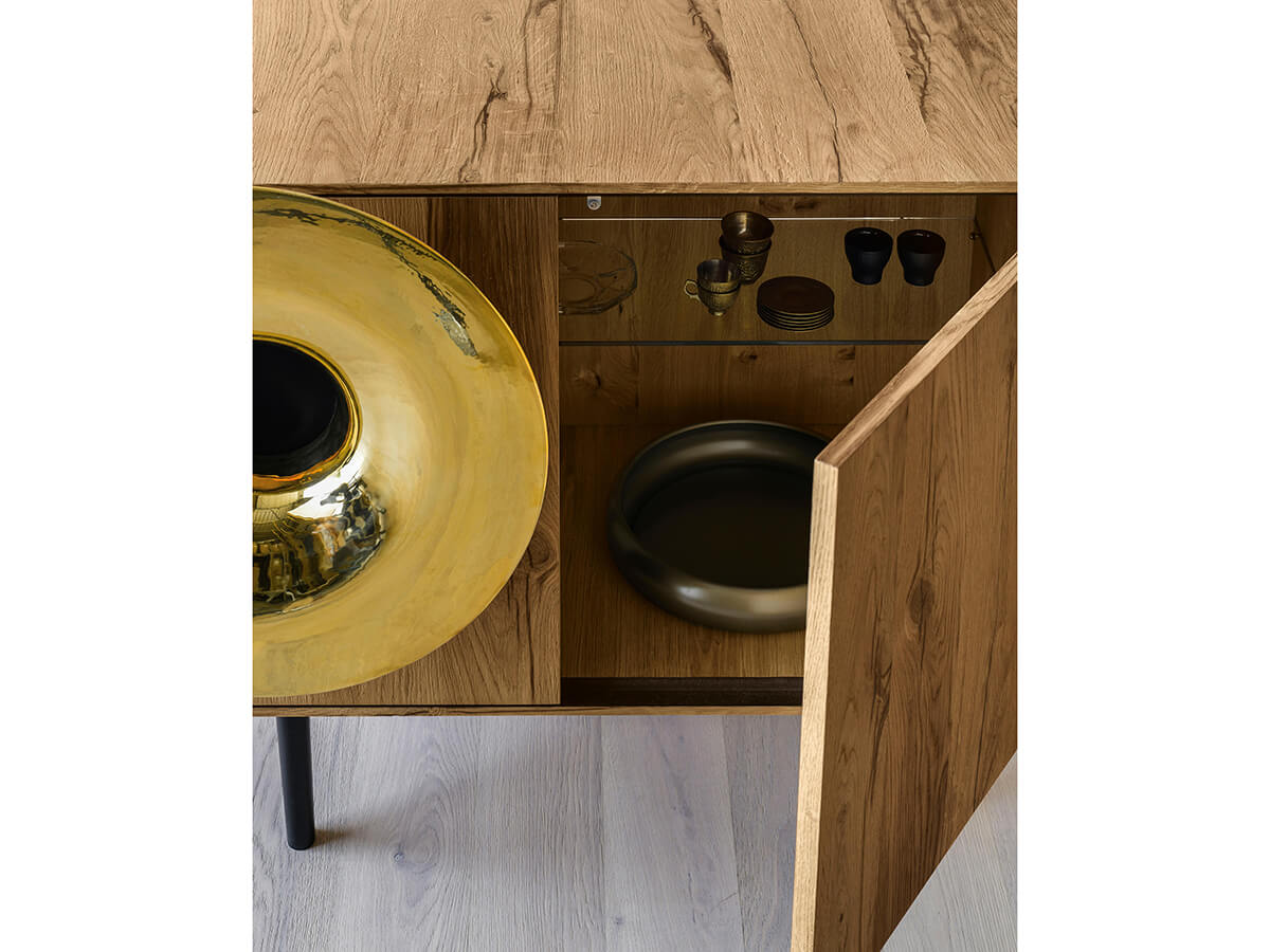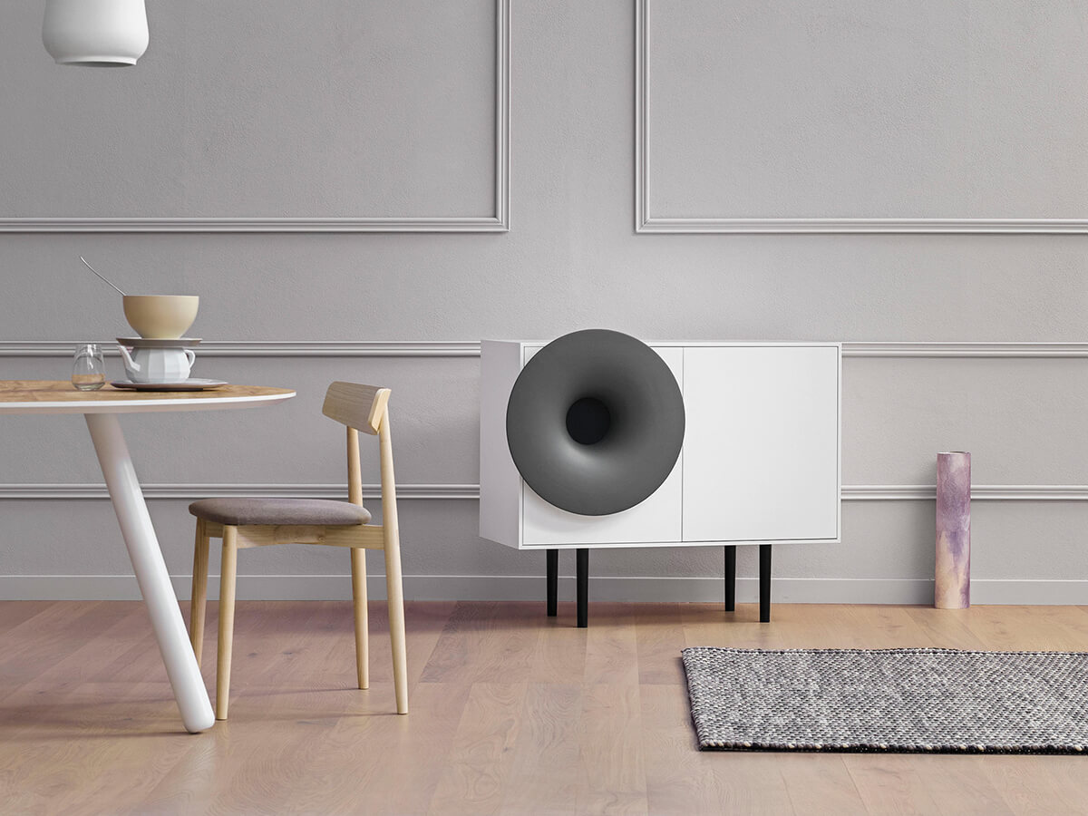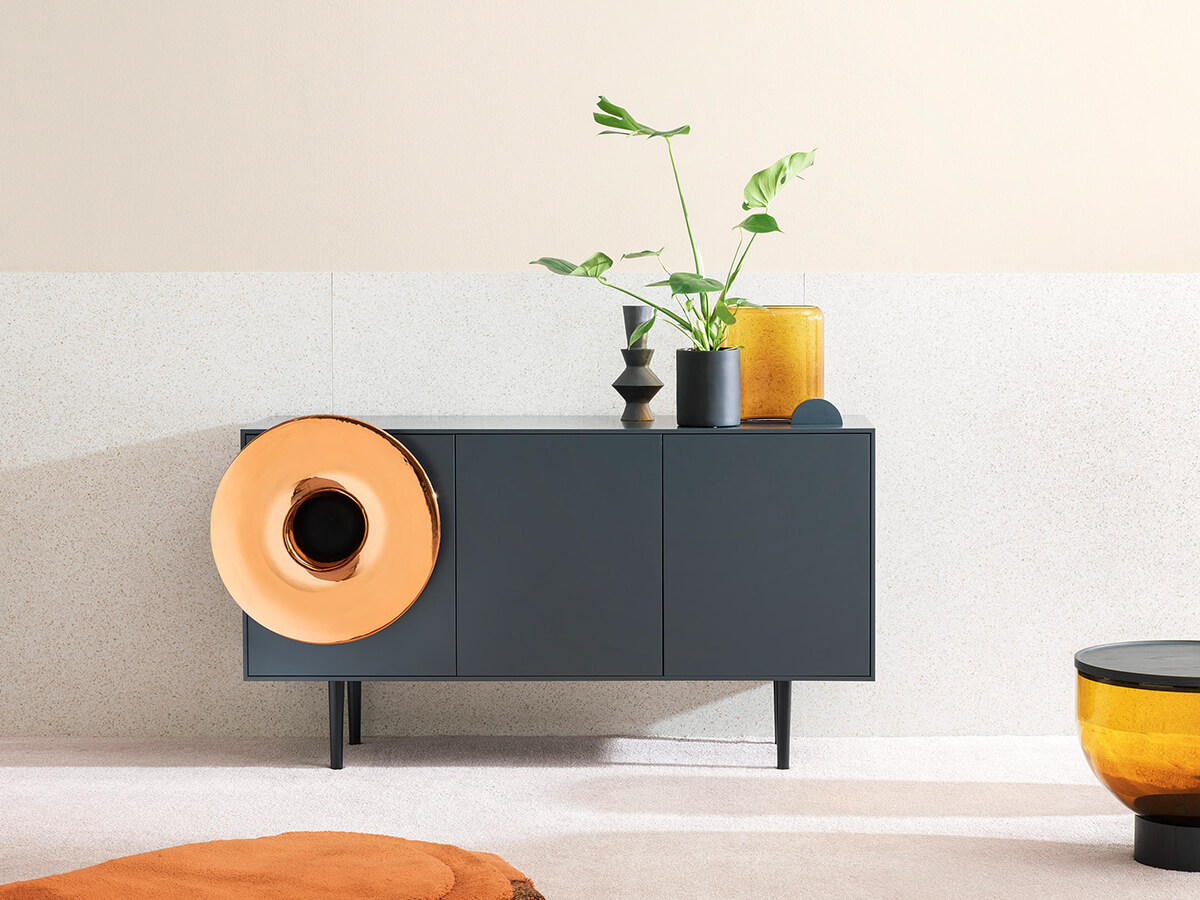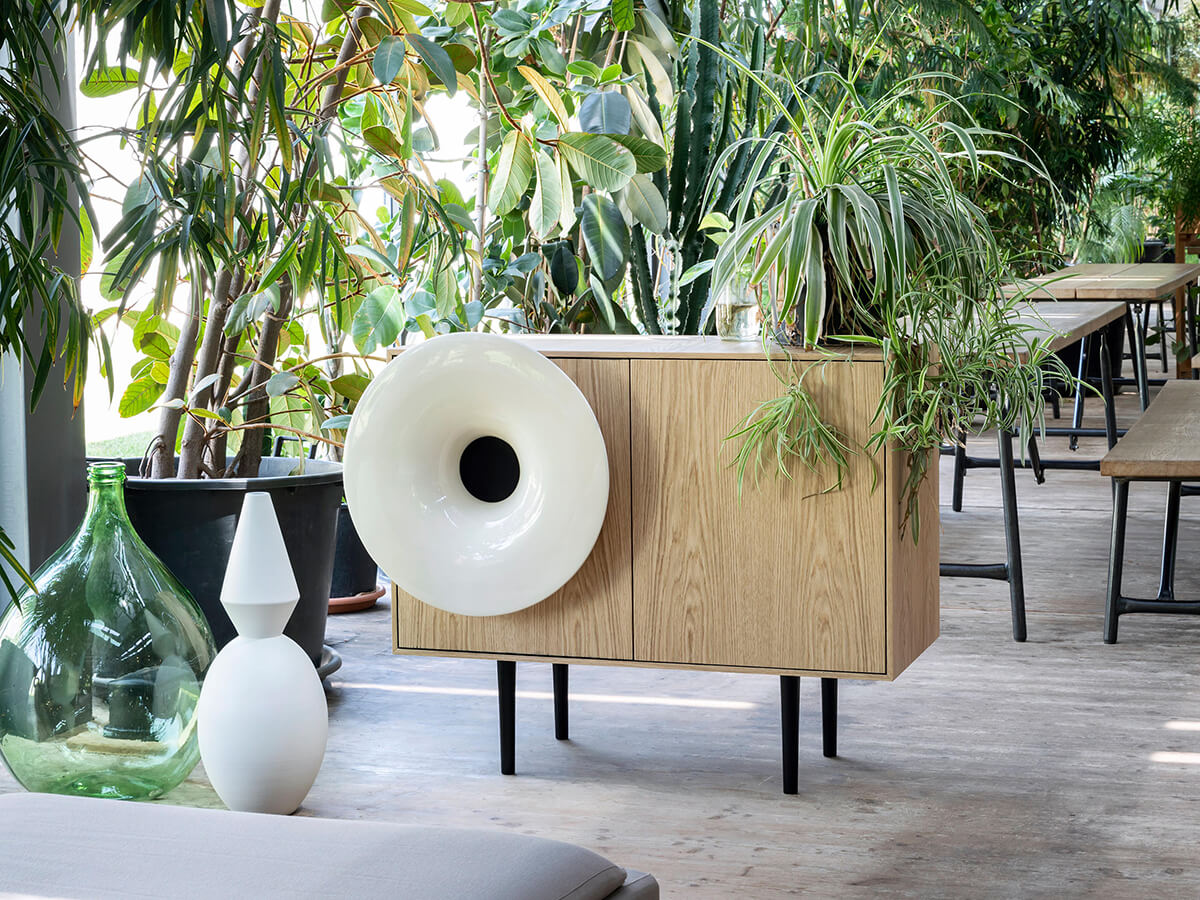 Un arredo trasversale, capace di esprimere una duplice identità conservando tuttavia una forte caratterizzazione intrinseca. Caruso è una madia che ben si presta allo spazio giorno e ambienti conviviali per i suoi toni giocosi e sgargianti che sembrano strizzare l’occhio al gusto anni ’80. Interessante è però la doppia anima conferitagli da Miniforms, in quanto oltre che contenitore, Caruso funge anche da riproduttore di musica in quanto al suo interno presenta un vero e proprio sistema Hi-Fi compreso di uno speaker che si può direttamente collegare con un’apposita applicazione del cellulare. Il risultato è che in qualunque momento si può scegliere di riprodurre musica all’interno degli ambienti, per una più gradevole gestione del tempo e della quotidianità.