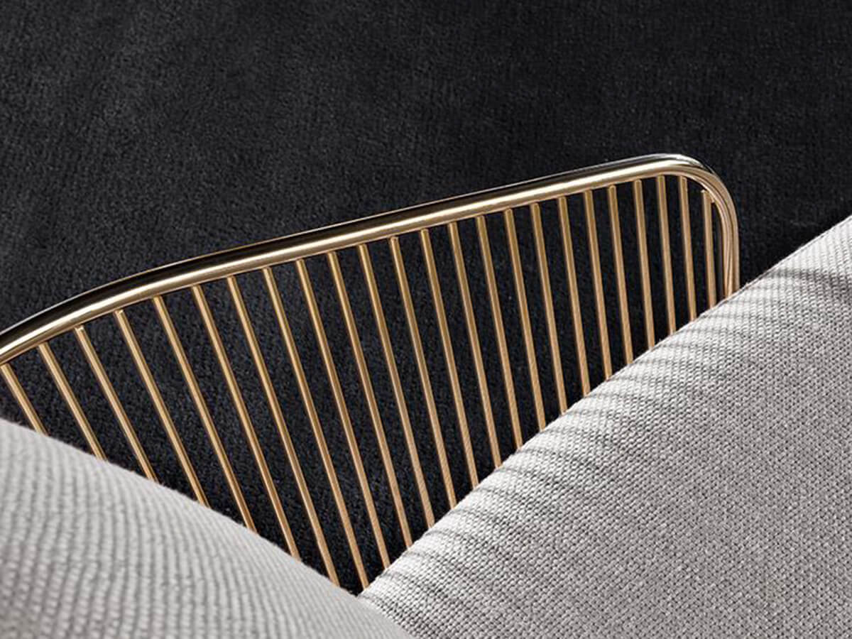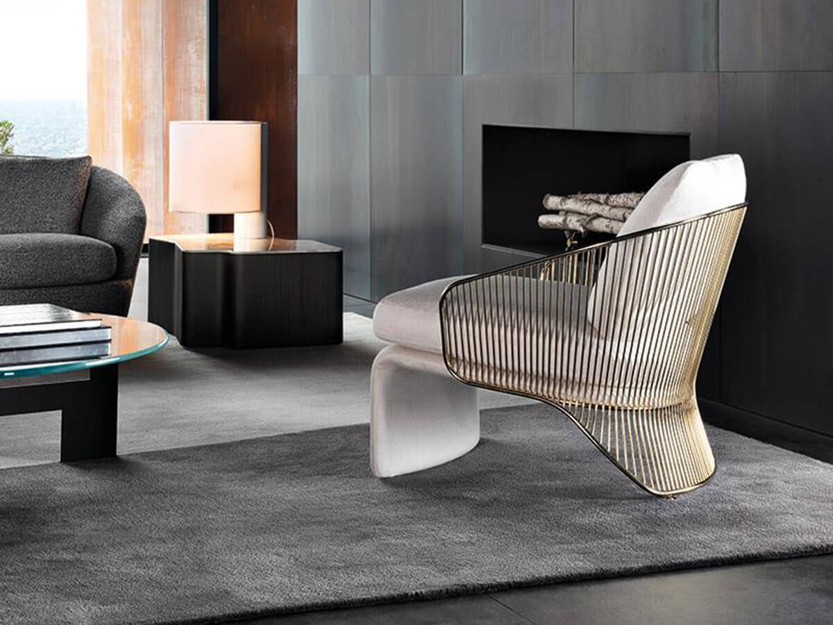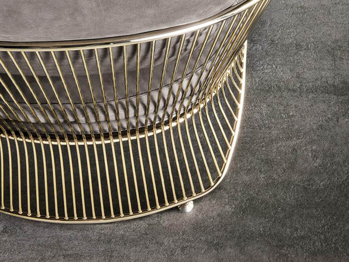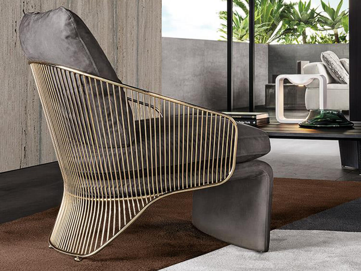Colette è una delle poltrone più caratteristiche di Minotti, celebre per il suo design fuori dagli schemi e squisitamente ispirato all’eleganza mid-century. Si tratta di un grande classico dell’estetica luxury, capace di esprimere ora come allora un gusto sofisticato e inalterabile. Colette presenta una struttura esterna complessa, in metallo calandrato, assemblato e saldato in oltre trecento punti. La speciale finitura metallica viene galvanizzata in un bagno d’oro e vernice protettiva che le conferiscono resistenza e profondità. La seduta, comoda e ampia così da garantire un’esperienza di comfort totale, termina nella parte anteriore con un appoggio a terra realizzato in schiuma poliuretanica e inserto di metallo. I cuscini sagomati si innestano perfettamente in questo delicato intreccio di proporzioni, conferendo a Colette la sua apparenza solida e leggera al contempo.