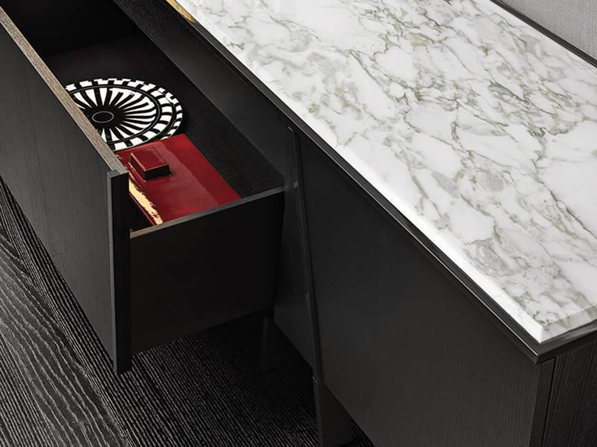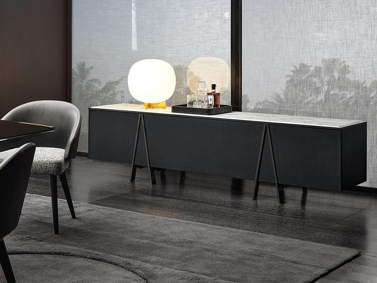 Il design di Nendo continua a stupire per la capacità di unire eleganza e genialità in un tutt’uno di estrema bellezza estetica. La serie di contenitori Easel si declina in tre principali versioni: contenitori per la zona living, contenitori per la zona dining e mobile alto, utilizzabile sia singolarmente che in coppia. Il design sobrio viene connotato dal segno decorativo a V su quello che appare come un frontale unico, in realtà suddiviso in ante o cassetti dal profilo inclinato. A impreziosire l’estetica dei contorni, Minotti ha previsto una serie di top in marmo, Stone, e altre finiture di estremo pregio, dimostrazione della capacità artigianale d’alta gamma di questa azienda.