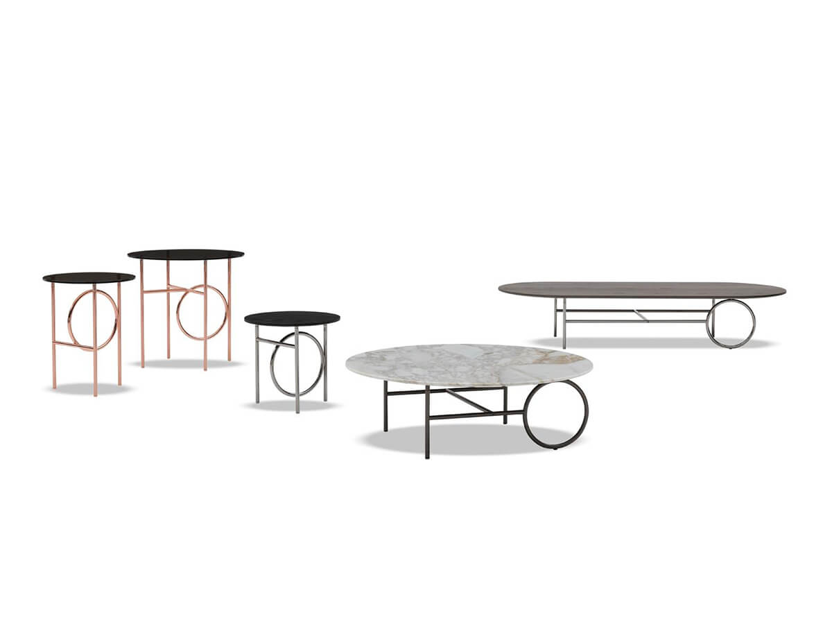 La serie di tavolini Ring si caratterizza per il design non convenzionale e ricco di suggestioni. Nendo lo disegna in cinque diverse fisionomie, pensando per ognuna un contrasto di proporzioni e fisionomie tali da renderlo un elemento d’arredo versatile e collocabile negli ambienti più diversificati. Il disegno in metallo delle gambe si articola in linee ortogonali spezzate da un grande anello collocato ogni volta in posizioni diverse. La sua funzione può evocare quella di un supporto o un semplice elemento estetico, rimanendo sempre un elemento focale estremamente suggestivo nella composizione totale. Disponibile in diverse altezze, il tavolino Ring può presentare un piano circolare o ellittico in diversi materiali ed essenze.