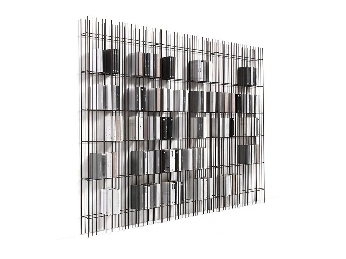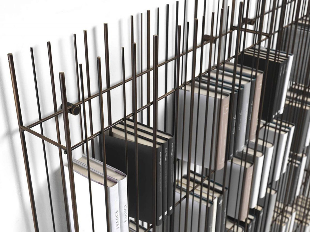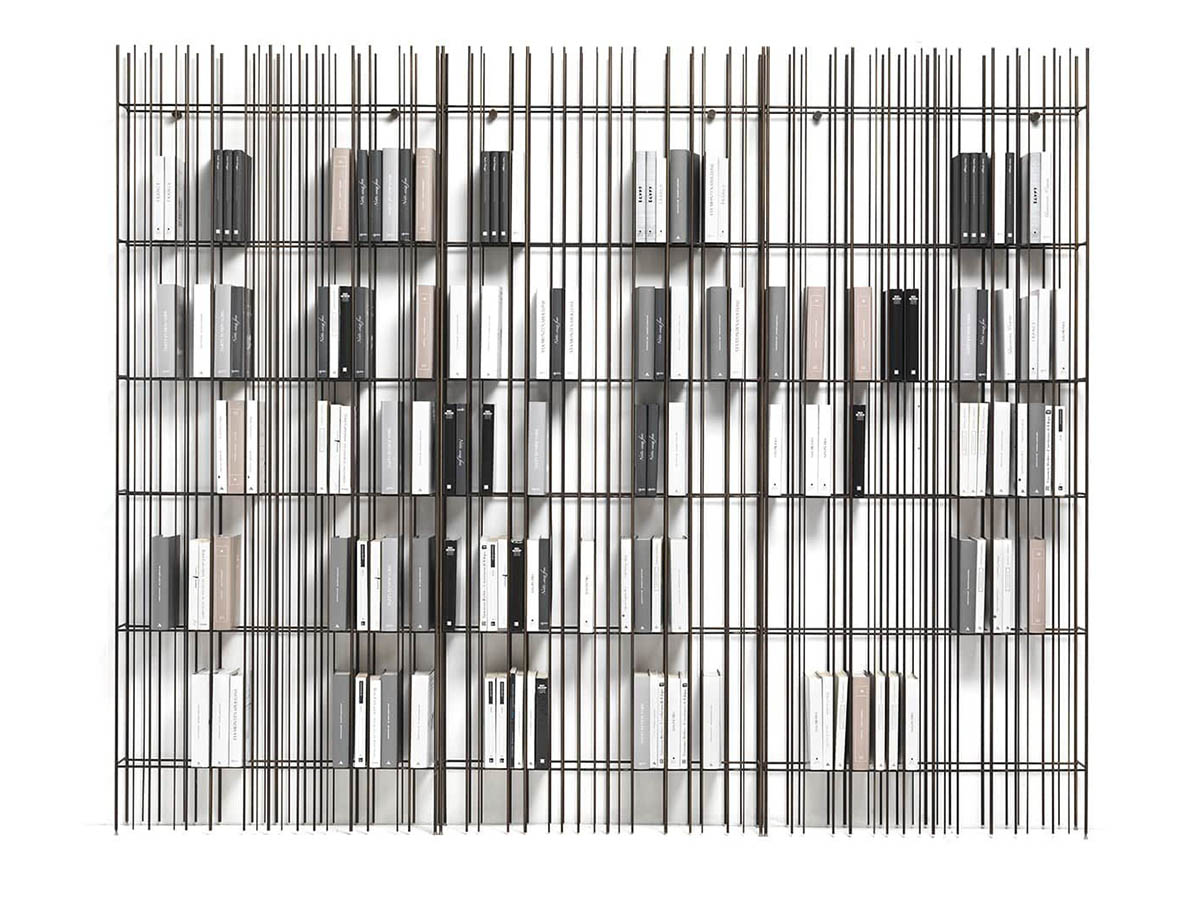 Una libreria dal tocco forte e connotato, capace di attirare l’attenzione ovunque la si metta per il suo design forte. La struttura è metallo, ma può presentarsi anche con finitura in titanio, brunito e oro con ripiani in cristallo trasparente disponibili anche qui in diverse colorazioni fra cui bronzo o verde. Il design di Metrica è essenziale e semplice, con un ritmo scandito dalle diverse bacchette di ferro fissate a intervalli regolari lungo la struttura. Disponibile in numerose dimensioni, Metrica sembra un inno al design industriale e al rigore geometrico che non teme di esagerare risultando comunque interessante e ricco di personalità.