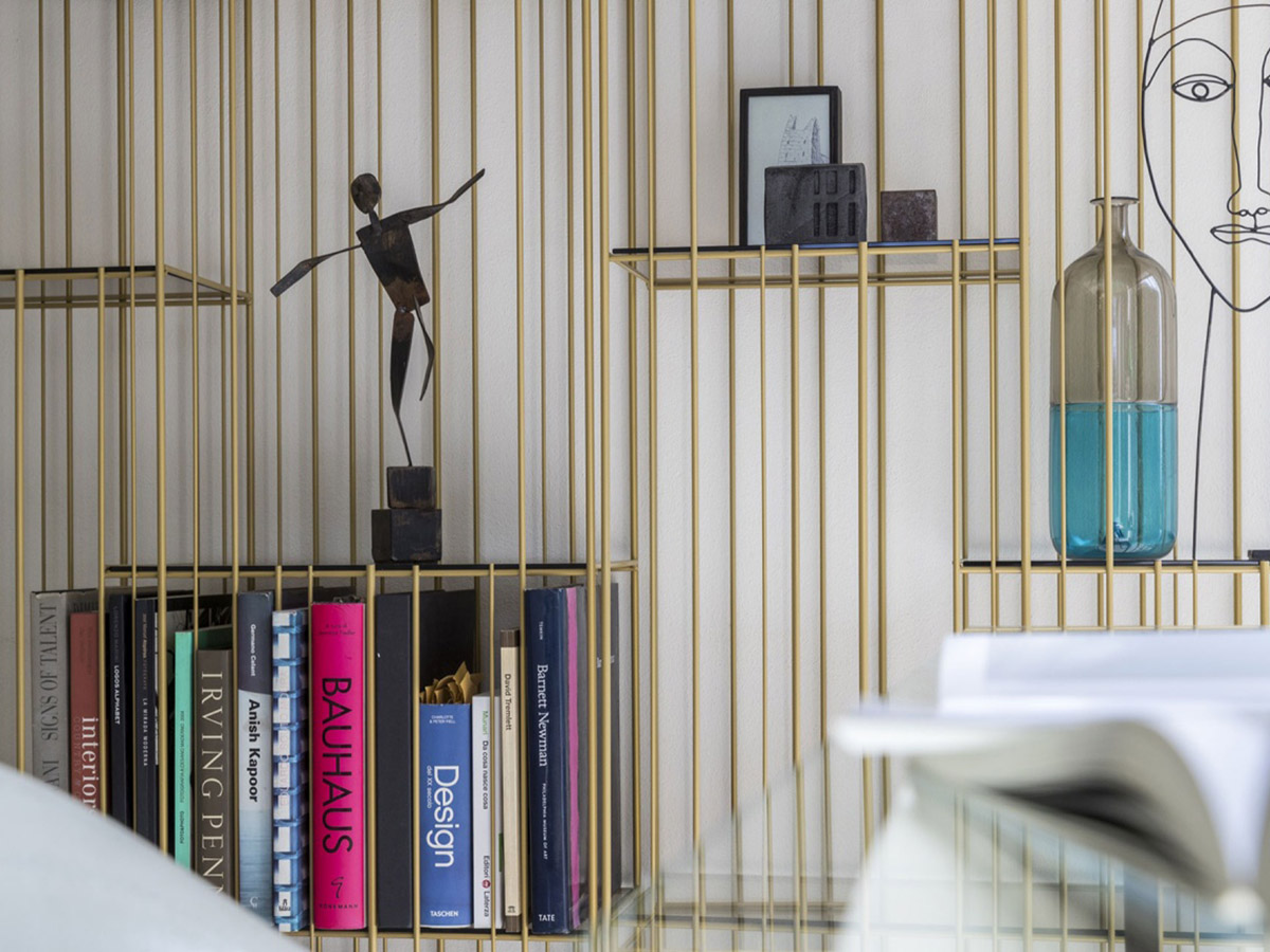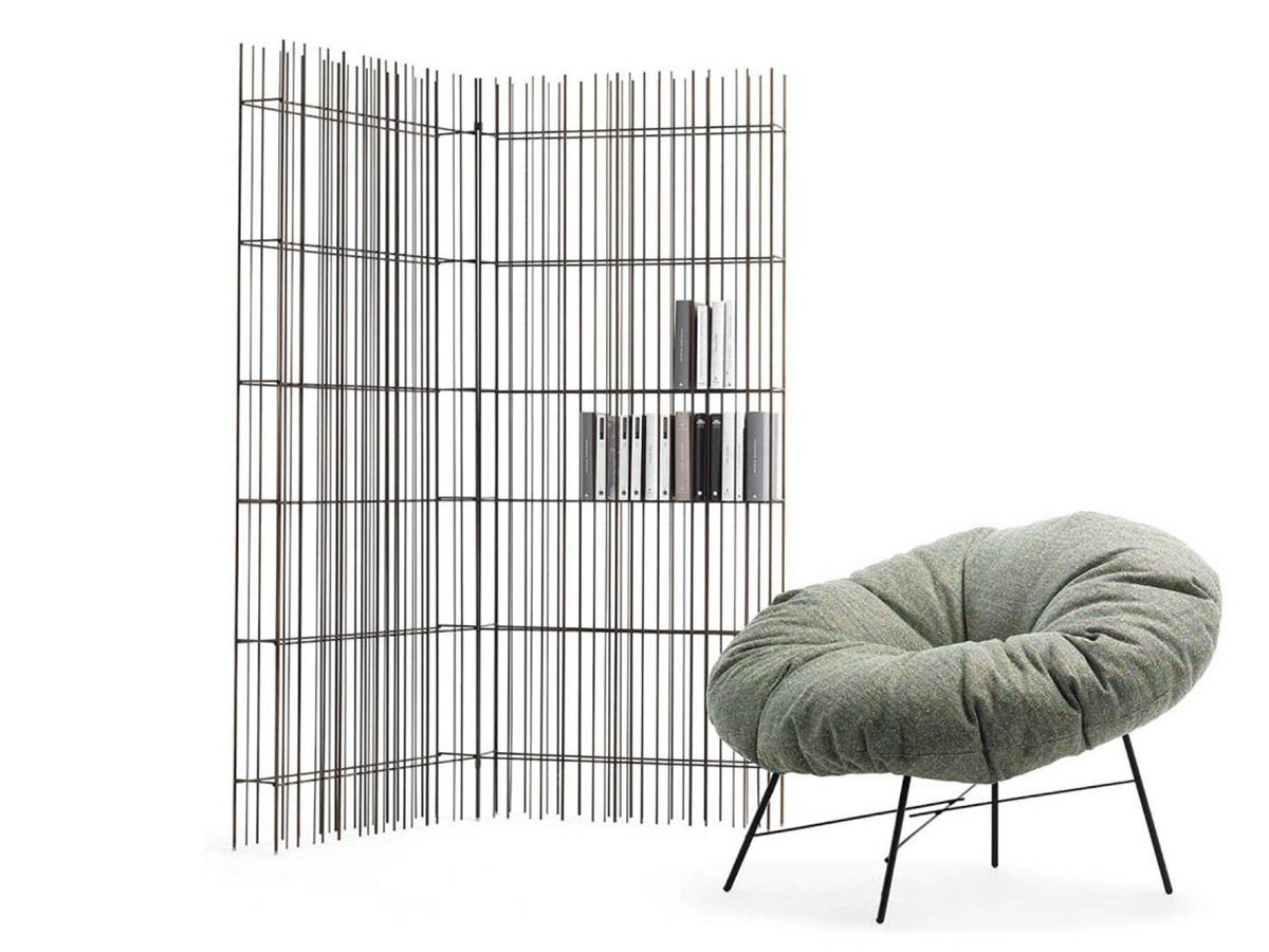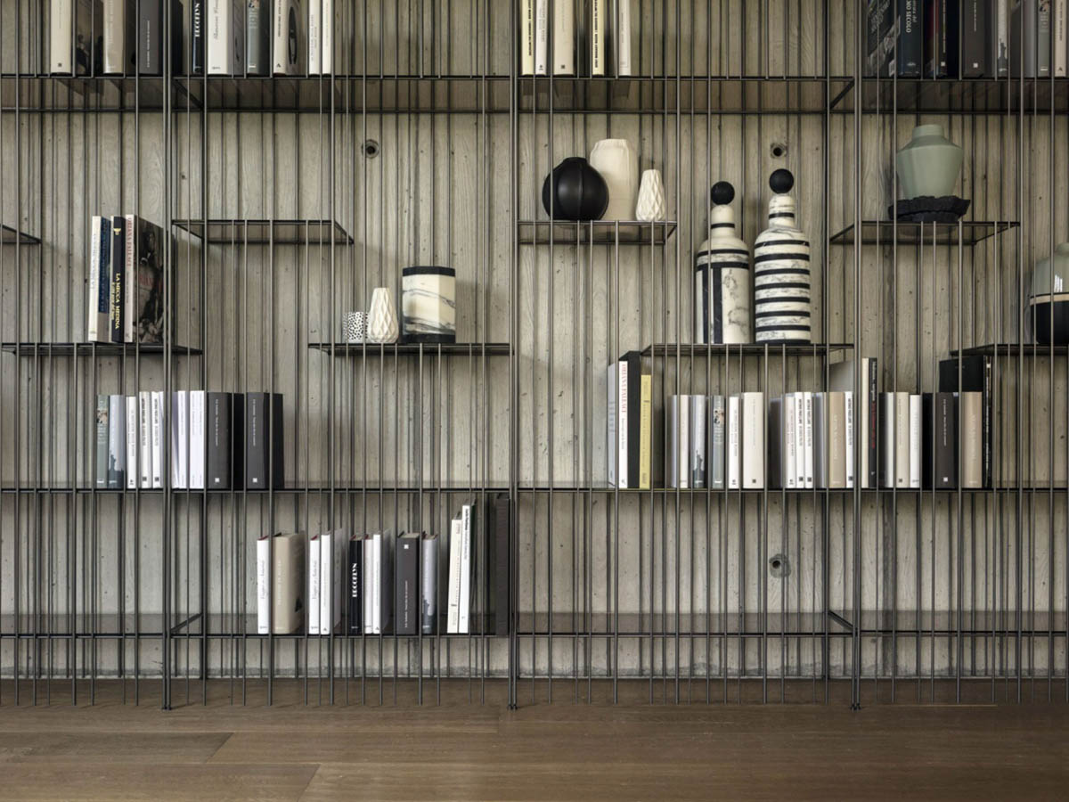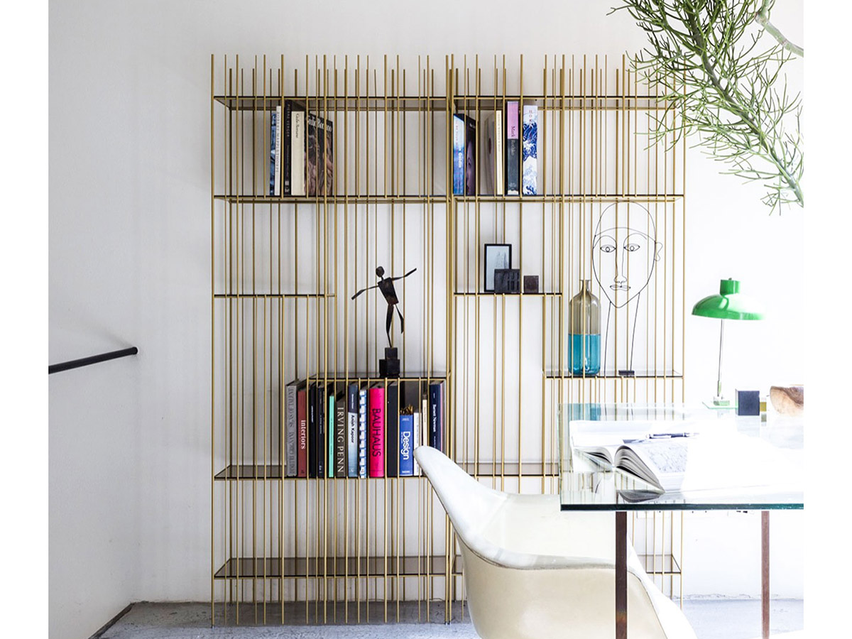 Una libreria dal tocco forte e connotato, capace di attirare l’attenzione ovunque la si metta per il suo design forte. La struttura è metallo, ma può presentarsi anche con finitura in titanio, brunito e oro con ripiani in cristallo trasparente disponibili anche qui in diverse colorazioni fra cui bronzo o verde. Il design di Metrica è essenziale e semplice, con un ritmo scandito dalle diverse bacchette di ferro fissate a intervalli regolari lungo la struttura. Disponibile in numerose dimensioni, Metrica sembra un inno al design industriale e al rigore geometrico che non teme di esagerare risultando comunque interessante e ricco di personalità.